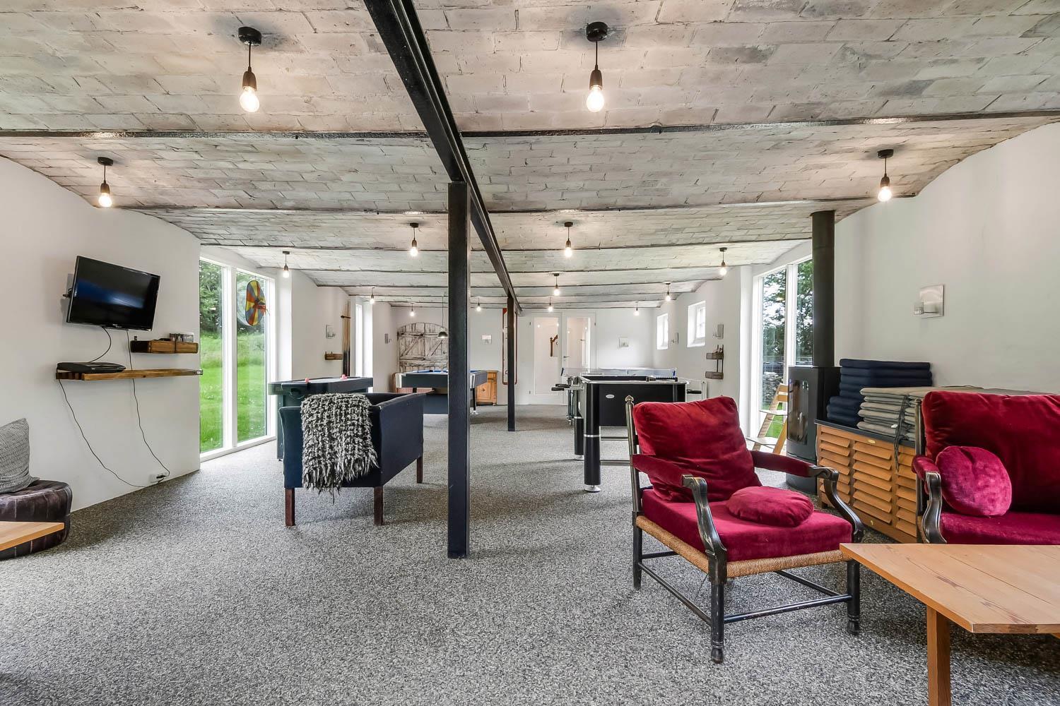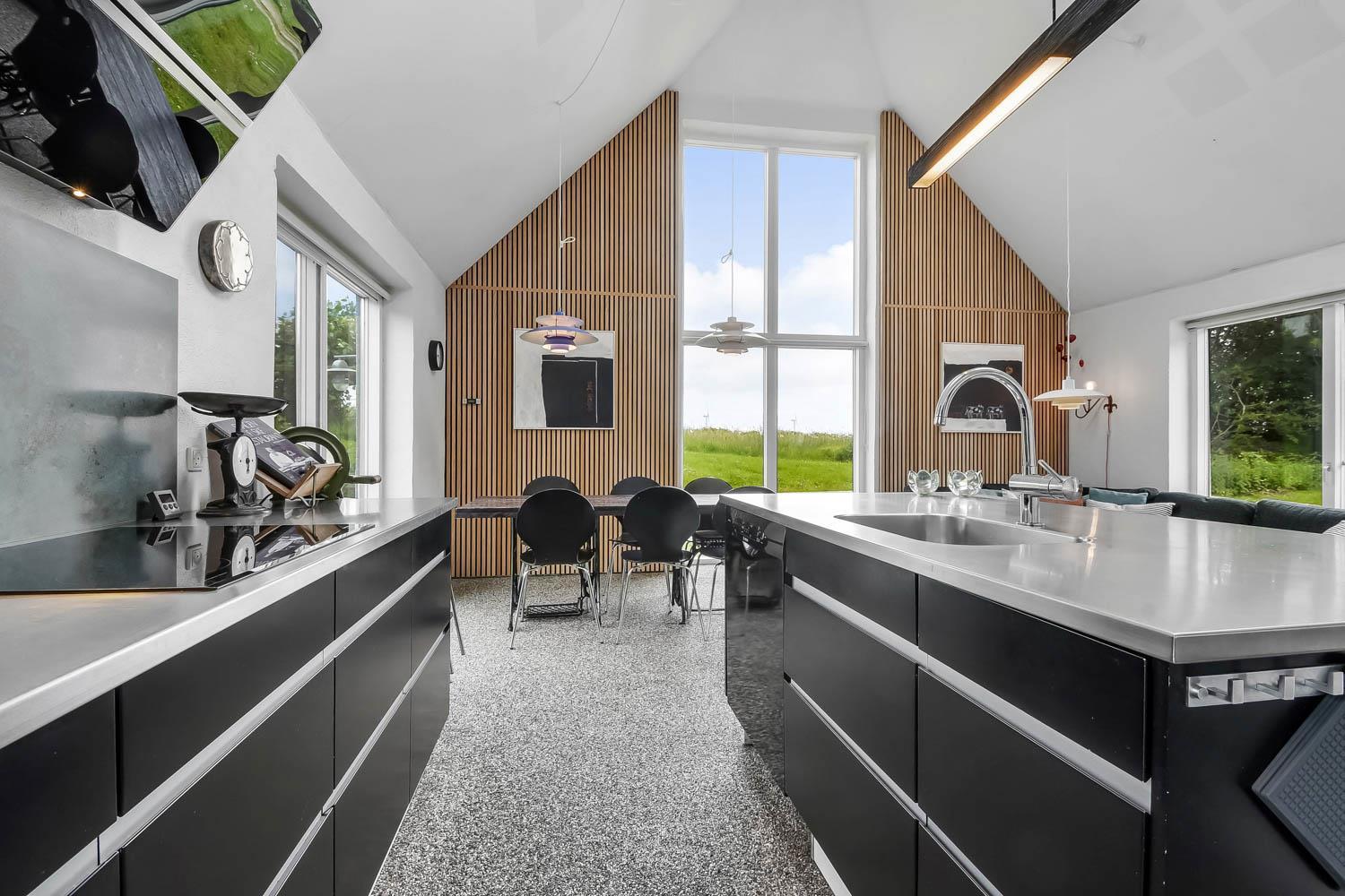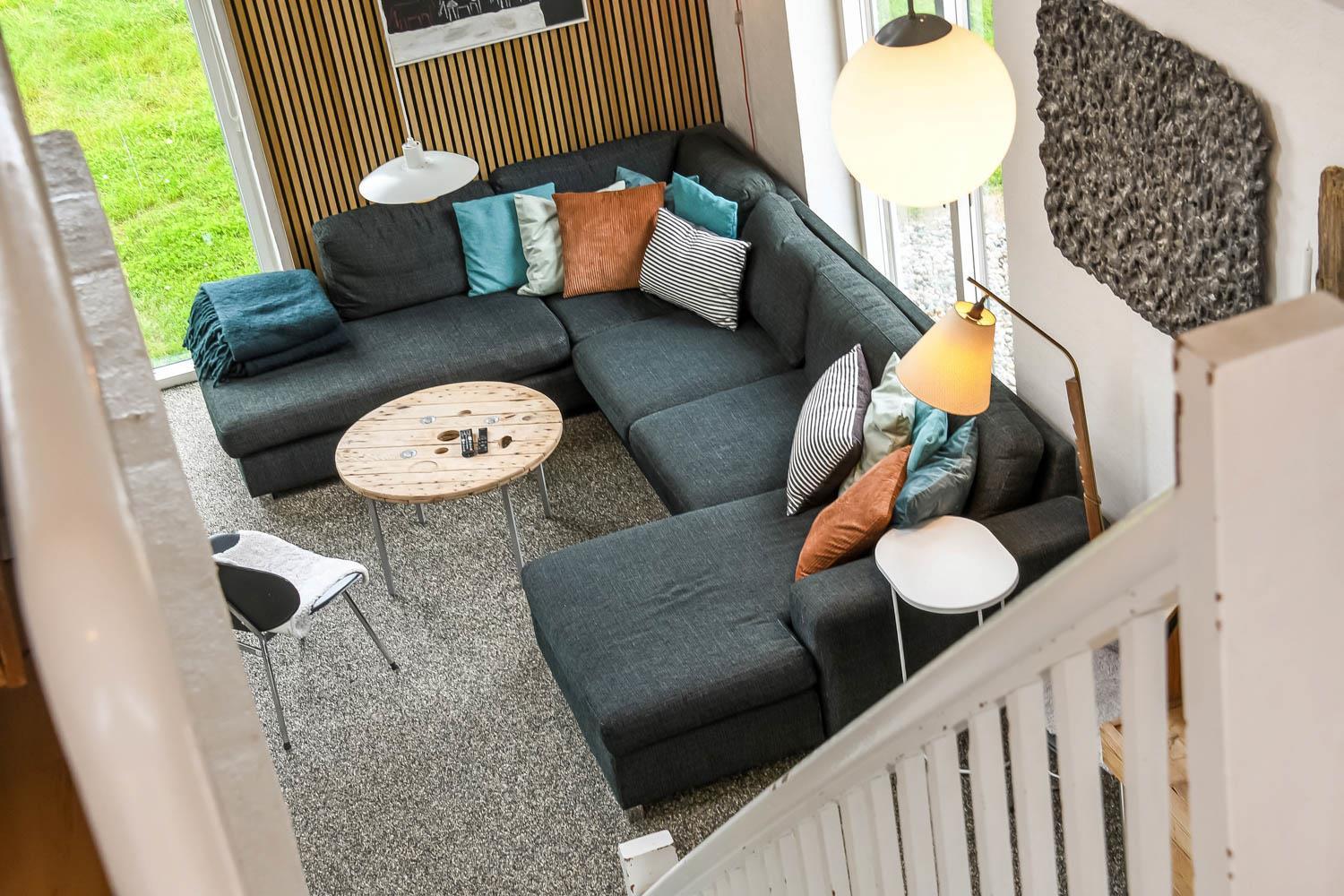 Huset har i alt 11 sovepladser. Nedenunder er der et værelse med dobbeltseng og et værelse med 4 køjesenge. Ialt 6 soveplader nedenunder. Ovenpå er der et værelse med en dobbeltseng og på hemsen, som har forbindelse med stuen, er der 3 sovepladser. Stuen, er bygget sammen med køkkenet og, er stilfuld indrettet med epoxy-stengulv, fladskærm med tysk og dansk tv, cromecast og brændeovn. Hertil er der også spisebord og sofagruppe. Det lækre køkken har 2 elkomfurer, køleskab, en 40 liters fryser, mikroovn og opvaskemaskine. Der er 2 badeværelser som ligger ved siden af hinanden i stueetagen. Det store badeværelse har gulvvarme, dampkabine med bruser, toilet, spabad og håndvask. Det mindre badeværelse har blot toilet og håndvask. Det store aktivitetsrum er i modsatte ende af stuen og byder på bordtennis, bordfodbold, poolbord og Playstation2 samt ekstra spiseborde hvis man af praktiske grunde skal spise eller på anden måde opholde sig her. Herudover har huset en barnestol, en barneseng, en tørretumbler samt en vaskemaskine. Huset er lavet som et energi rigtigt hus der opvarmes med jordvarme. Rengøring er obligatorisk ved dette hus.