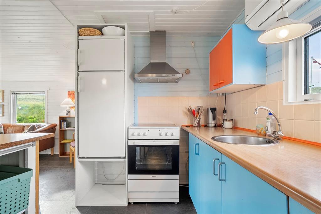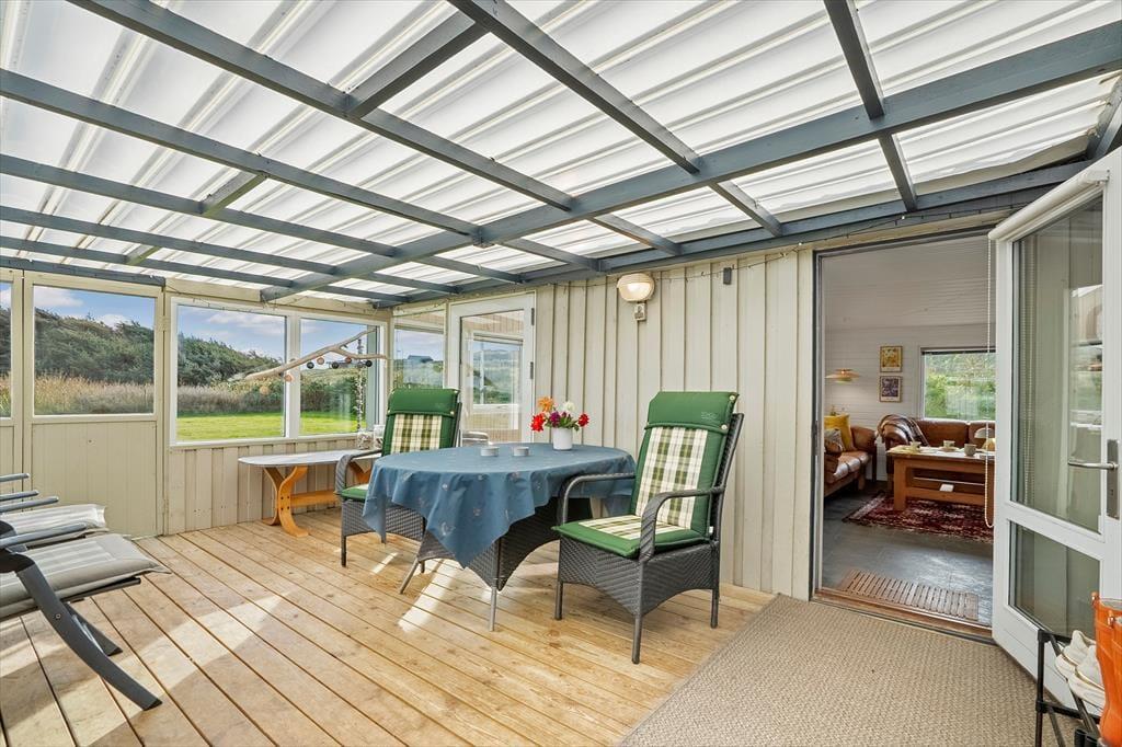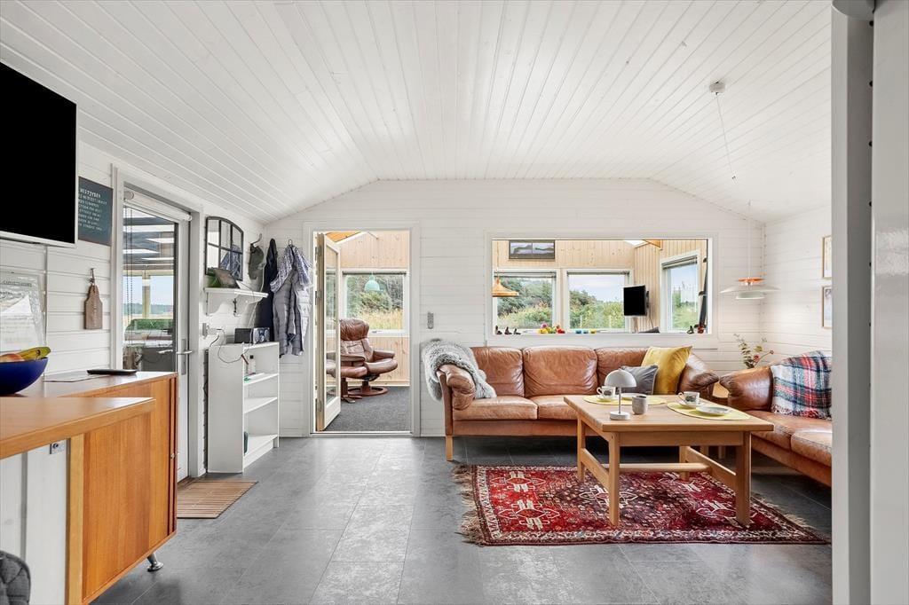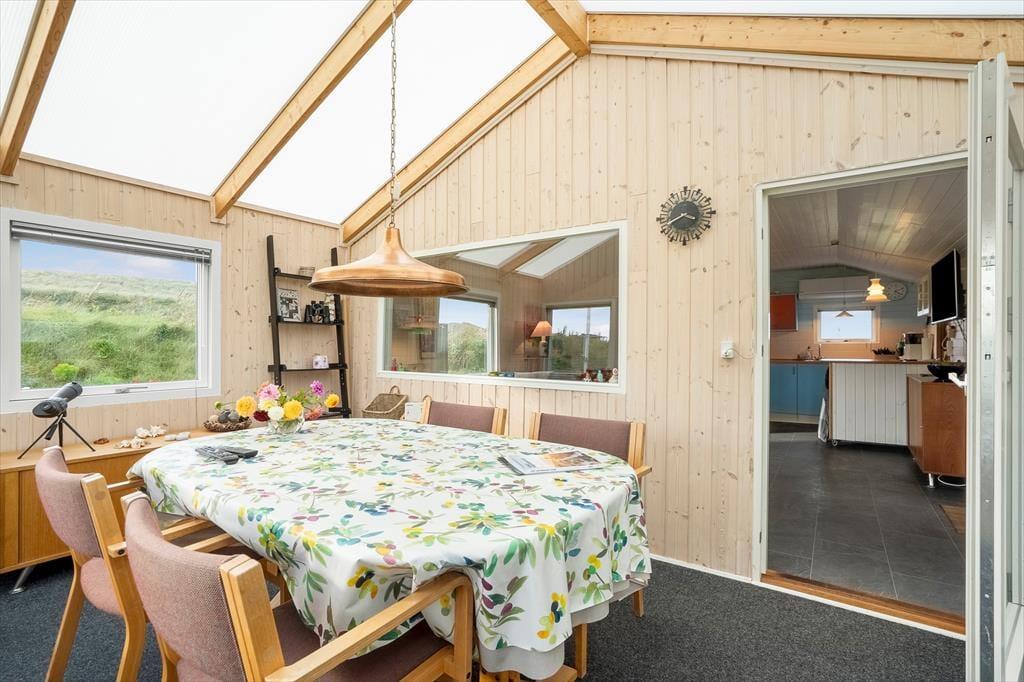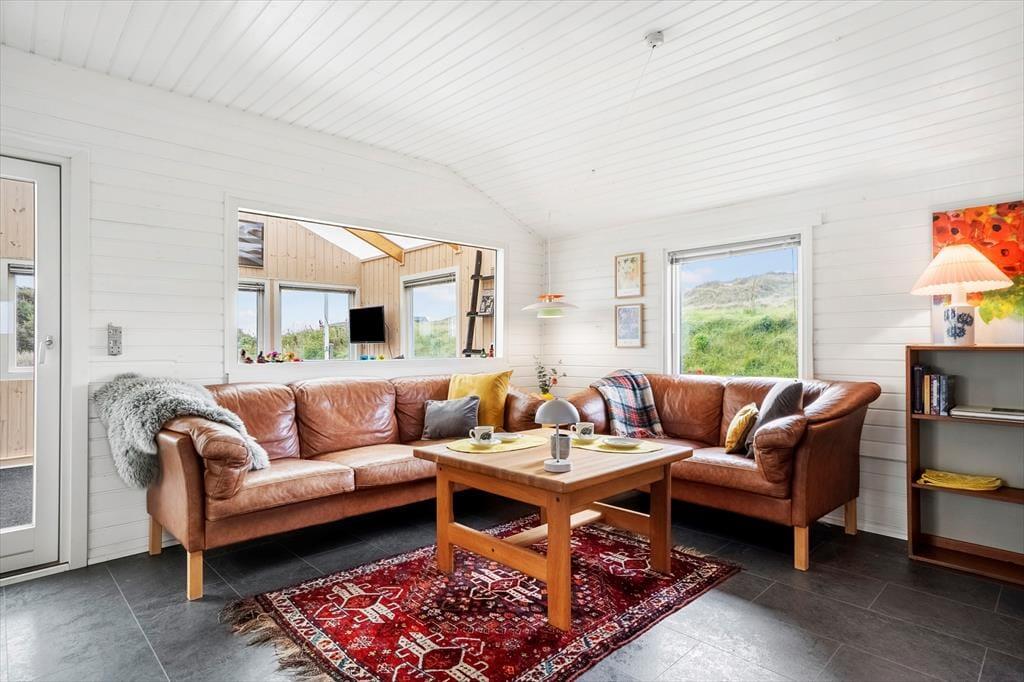 Velkommen til Enghytten – et hyggeligt fritidshus, fredeligt placeret mellem Vesterhavets brusende bølger og Nissum Fjords rolige vand. Når I træder ind, mødes I af en dejlig overdækket terrasse, hvor morgenkaffen kan nydes i læ, mens naturen omgiver jer. Indenfor finder I et lyst og venligt hjem med hvidmalede vægge og lofter, der giver en følelse af luftighed og ro. Køkkenet er funktionelt med en praktisk flytbar køkkenø, og i udestuen med loft til kip skaber de lyse termotagplader et åbent og indbydende rum. Her får I en skøn base, hvor hygge og naturoplevelser går hånd i hånd.