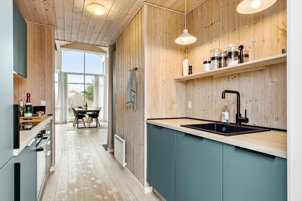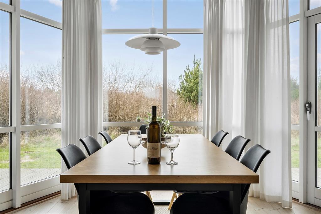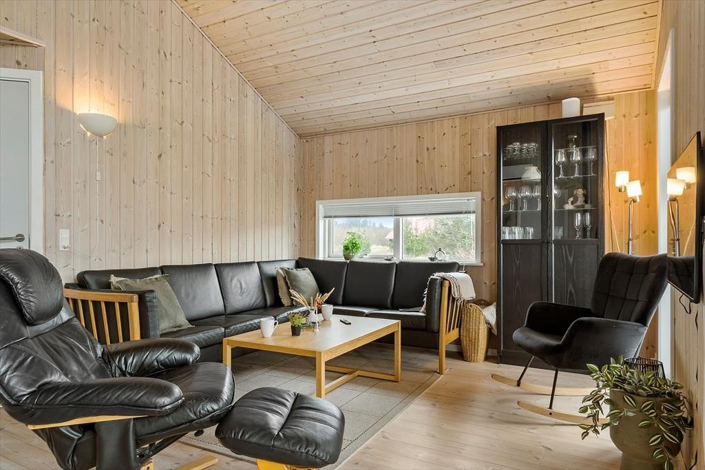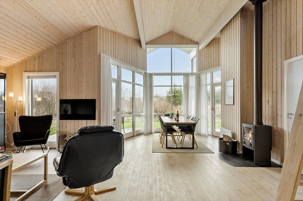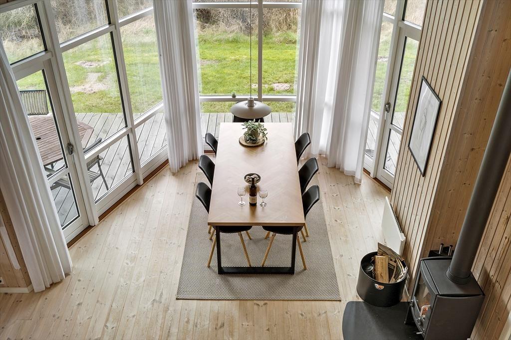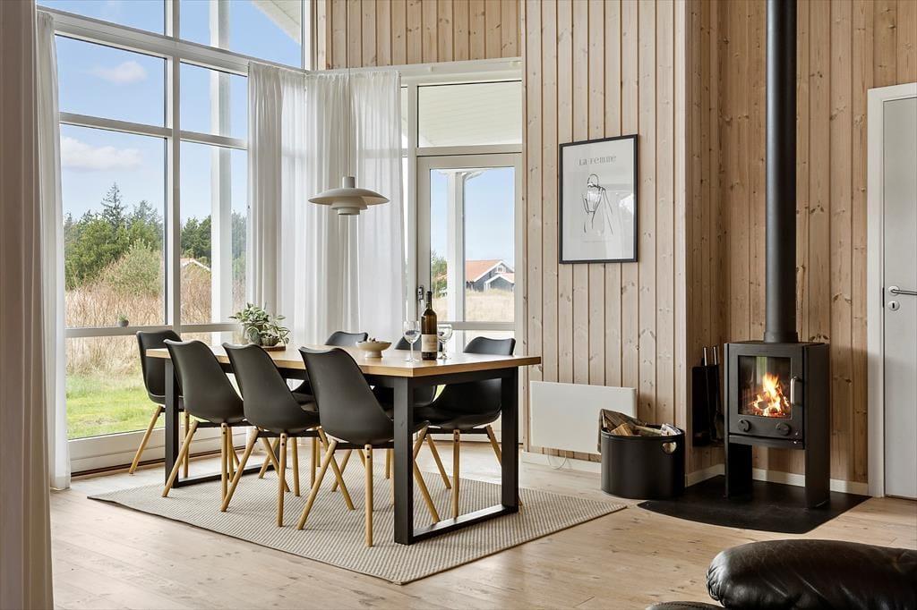 Når I træder ind i dette sommerhus, mærker I straks, hvordan roen tager over, og dagligdagens travlhed forsvinder. Her er plads til nærvær og hygge i smukke omgivelser. Det åbne køkken står klar, når sulten melder sig, og I kan samtidig følge med i livet i huset, mens maden bliver tilberedt. Lyset strømmer ind gennem vinduerne ved spisebordet og skaber den perfekte stemning til jeres måltider. Træk jer op på hemsen med en god bog – herfra har I stadig udsigt over rummet og kan føle jer en del af fællesskabet. Når aftenen falder på, kan I tænde op i brændeovnen og nyde varmen, der langsomt breder sig.
