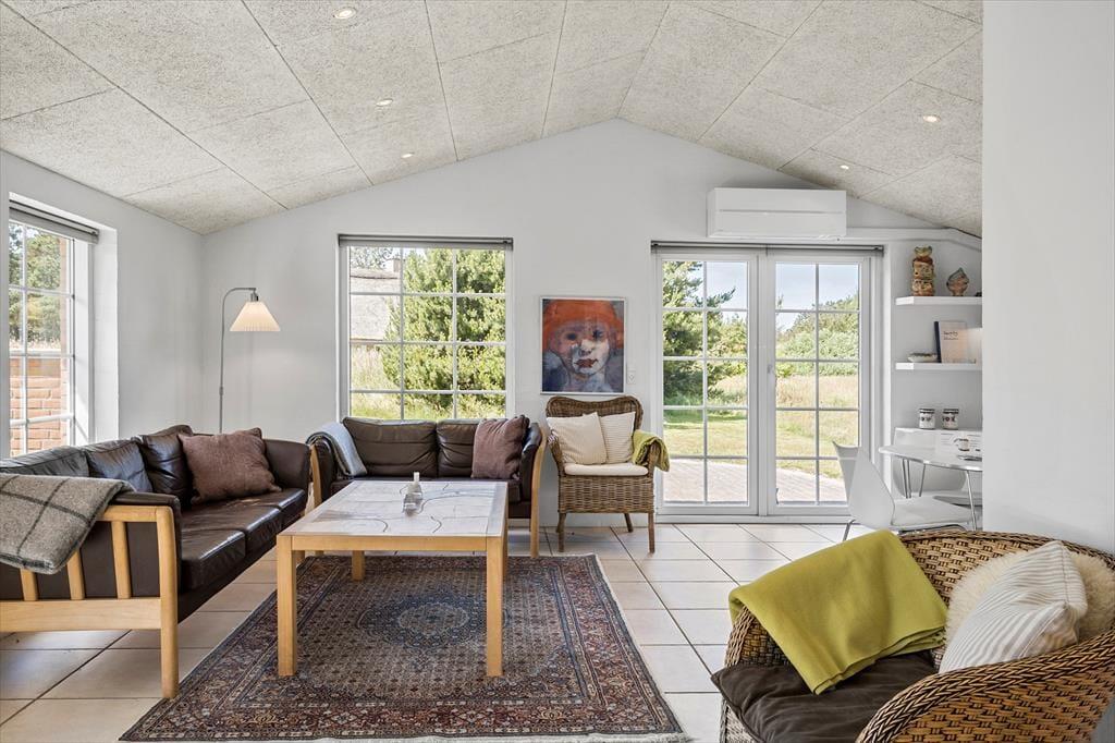 Forestil jer en ferie, hvor I vågner op til det bløde lys, der strømmer ind gennem store vinduer, mens den jyske natur hilser jer godmorgen lige udenfor. Dette skønne feriehus på 88 m² er smagfuldt og lyst indrettet med højt til loftet og en atmosfære, der indbyder til afslapning og kvalitetstid. I det åbne opholdsrum kombineres køkken og stue, så I kan nyde hinandens selskab – hvad enten I laver mad sammen, spiller spil eller slapper af foran brændeovnens knitren. Her er to rummelige soveværelser med dobbeltsenge og god skabsplads – og i det ene er der endda en ekstra udtræksseng, så I nemt kan være op til fem personer. Fra begge værelser er der direkte adgang til terrassen, hvor I kan nyde morgenkaffen i solen. Huset byder desuden på hele to badeværelser – det ene med sauna og spabad, så I kan forkæle jer selv med lidt luksus og lade roen sænke sig. Kort sagt: Her får I de perfekte rammer for en uforglemmelig ferie sammen.