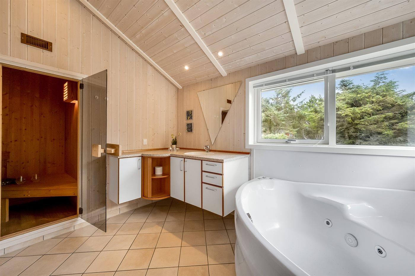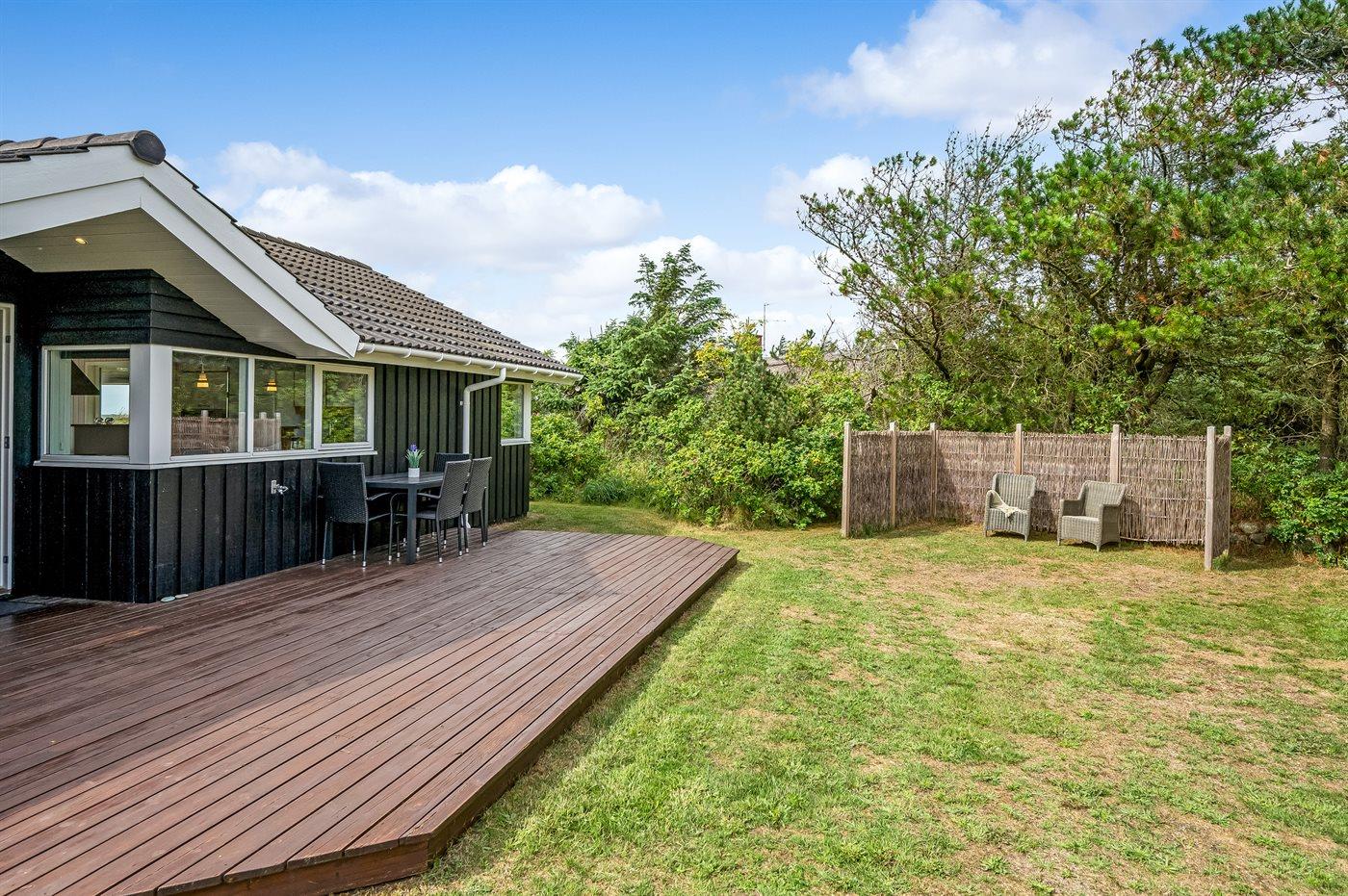 Et rigtig dejligt sommerhus i træ, bygget i 2003, beliggende på en natur-/klitgrund. Huset ligger for enden af en vej og fra stuen er der en flot udsigt over fjorden og klitområdet. Til huset hører et dejligt terrasseareal med havemøbler. Huset er flot indrettet med nye møbler. Vægge og lofter er beklædt med træ. Trægulve, dog opvarmet klinkegulv i badeværelse og køkken. Pænt badeværelse med bruseniche, 2-pers. spa samt direkte adgang til husets sauna. Det flotte køkken indeholder bl.a. opvaskemaskine, mikrobølgeovn samt komfur med keramiske kogeplader og varmluftovn. Opholdsstuen er indrettet med brændeovn, Radio, TV med parabol (digital) og DVD-afspiller. De 6 sovepladser fordeler sig på 3 værelser: 2 med dobbeltseng og 1 med 2 enkeltsenge. Endvidere står vaskemaskine, tørretumbler og høj barnestol.