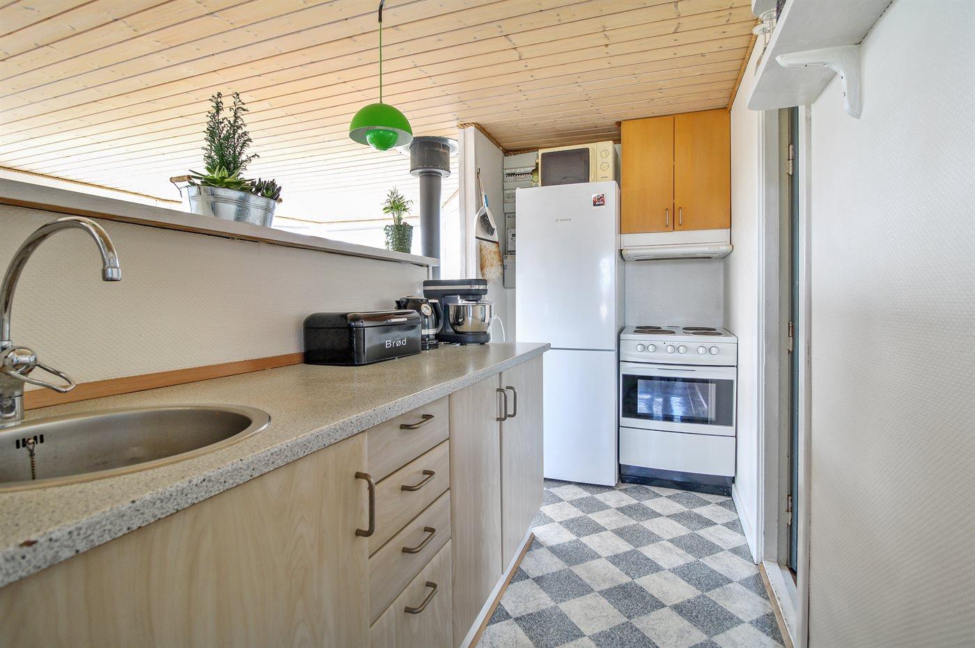 Køkkenet er udstyret med 1 køleskab. Der er 4 elkogeplader, varmluftovn, mikrobølgeovn.