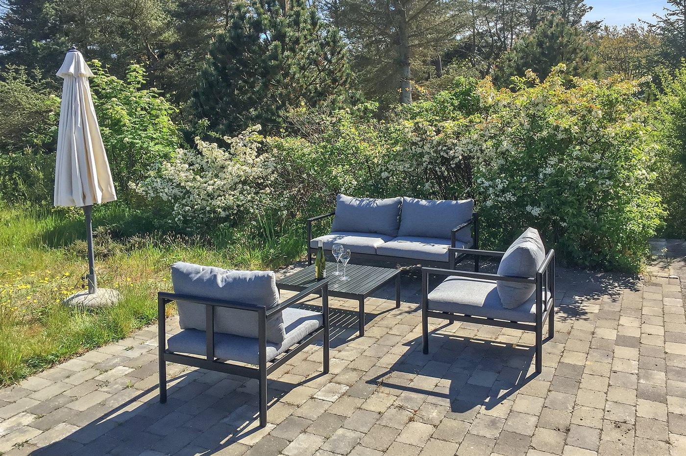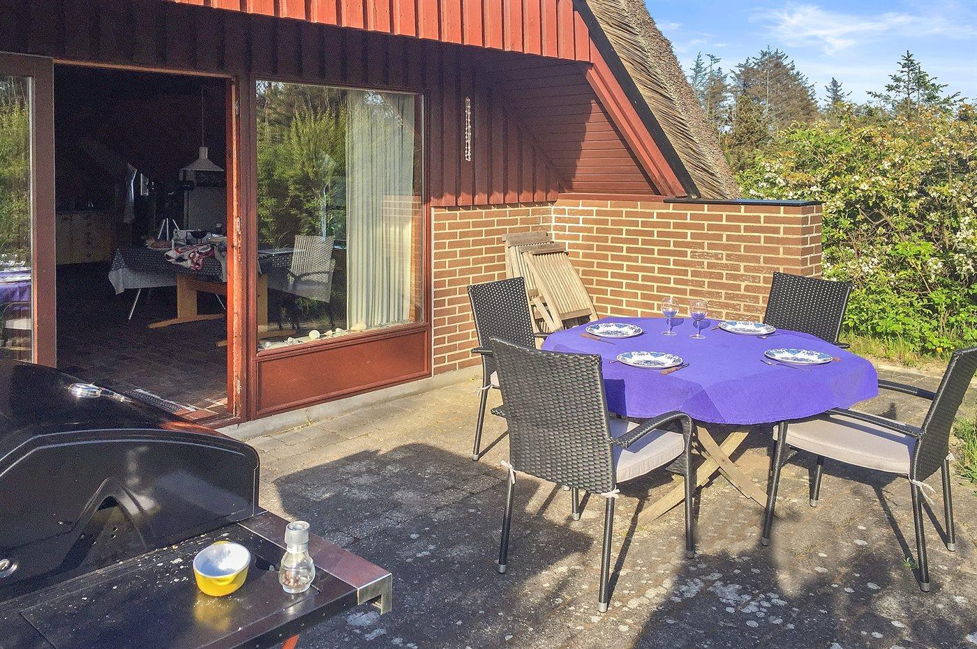 Hyggeligt sommerhus med stråtag, stor terrasse og brændeovn, beliggende tæt på fjord og natur i Ulfborg.