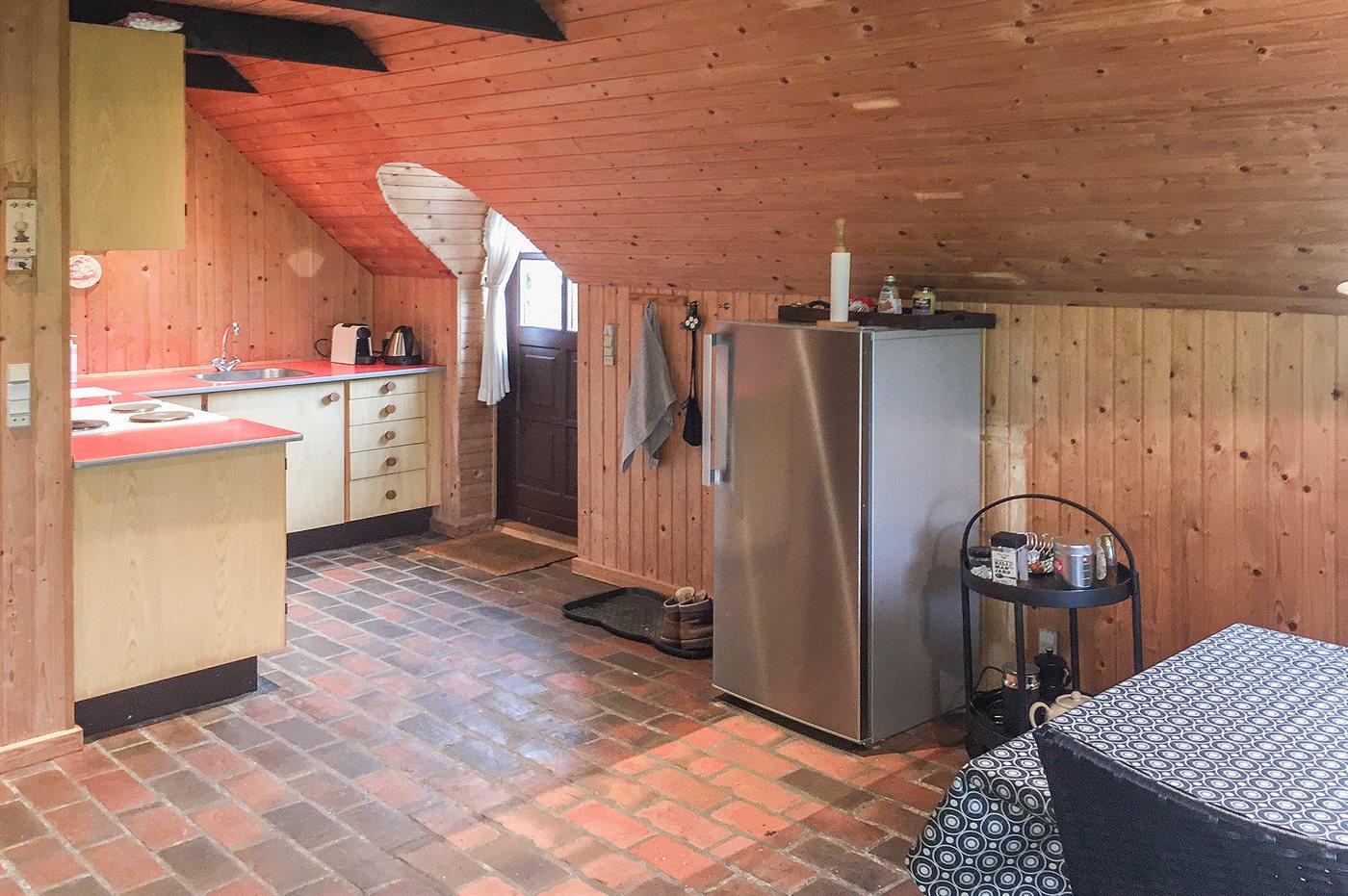 Køkkenet er udstyret med 1 køleskab. Der er 4 keramiske kogeplader, varmluftovn.