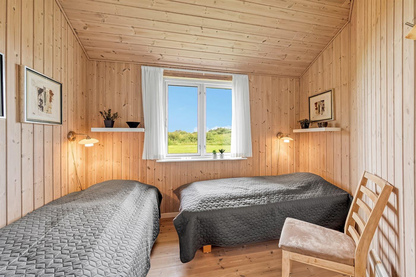 Der er i alt 3 soveværelser. Sovepladserne fordeler sig på: 6 sovepladser i enkeltsenge. 2 sovepladser på madrasser. 2 af disse sovepladser befinder sig på husets hems.
