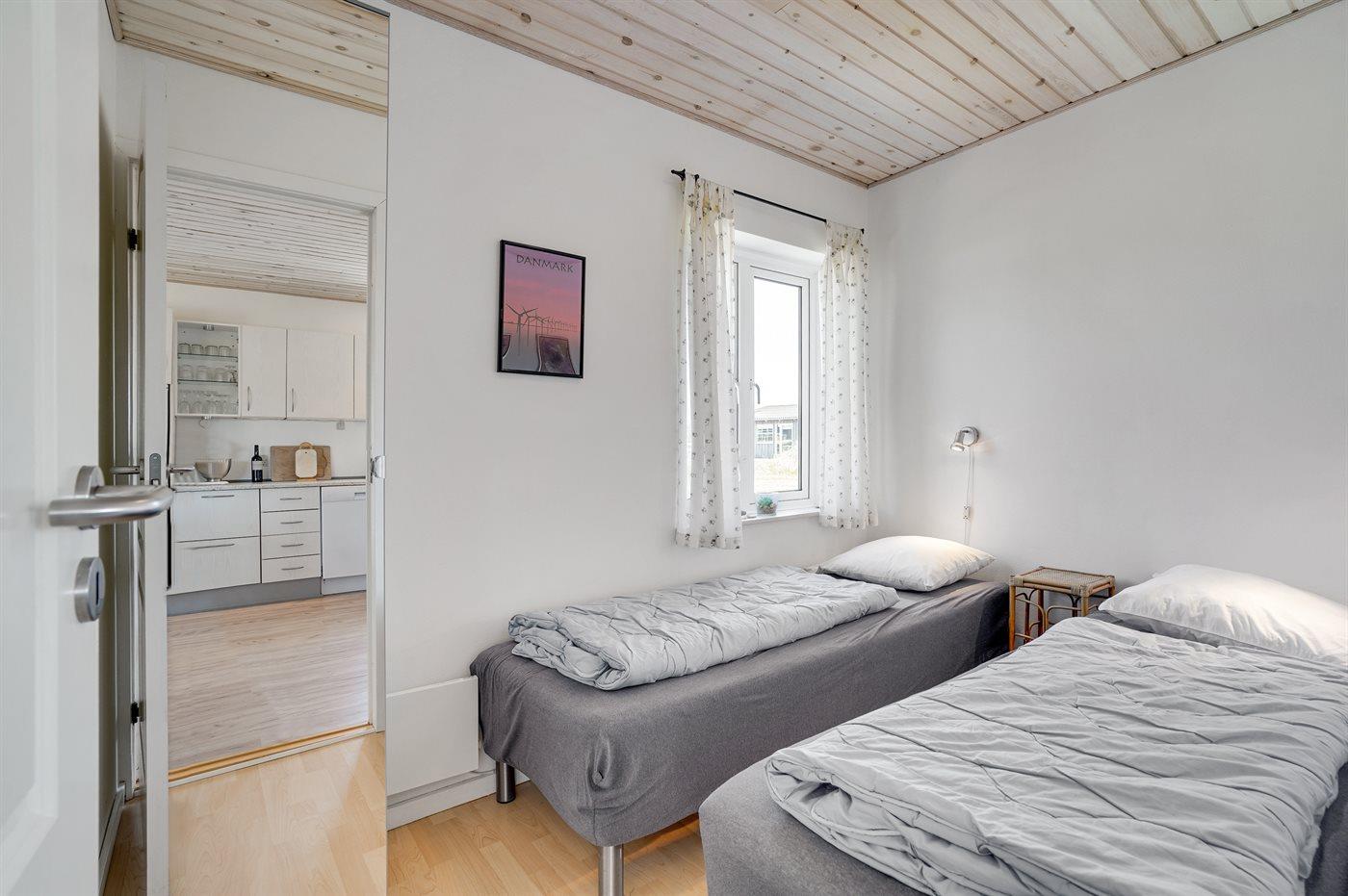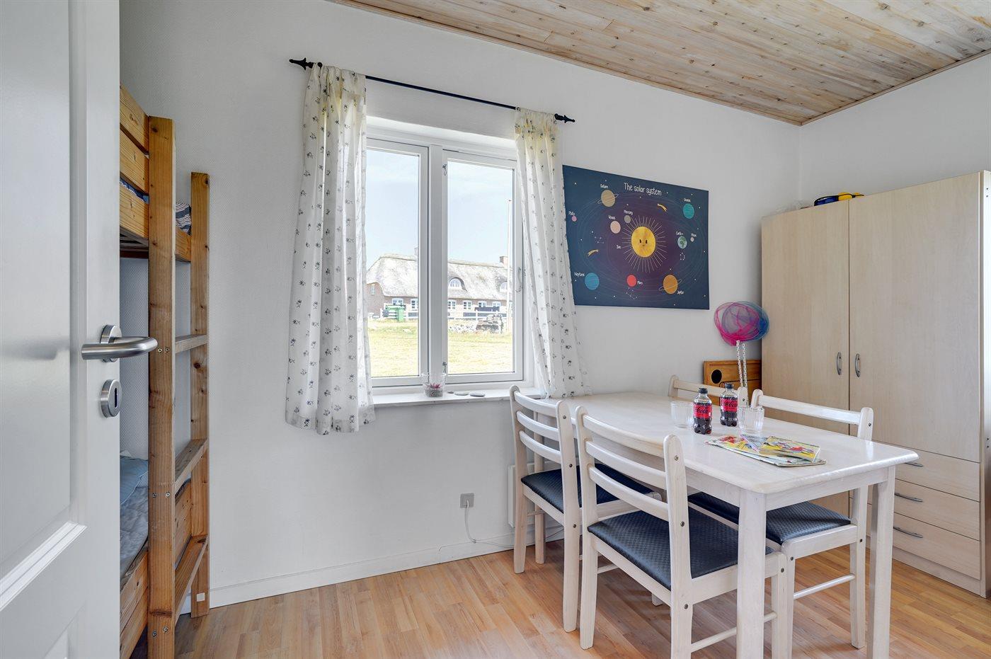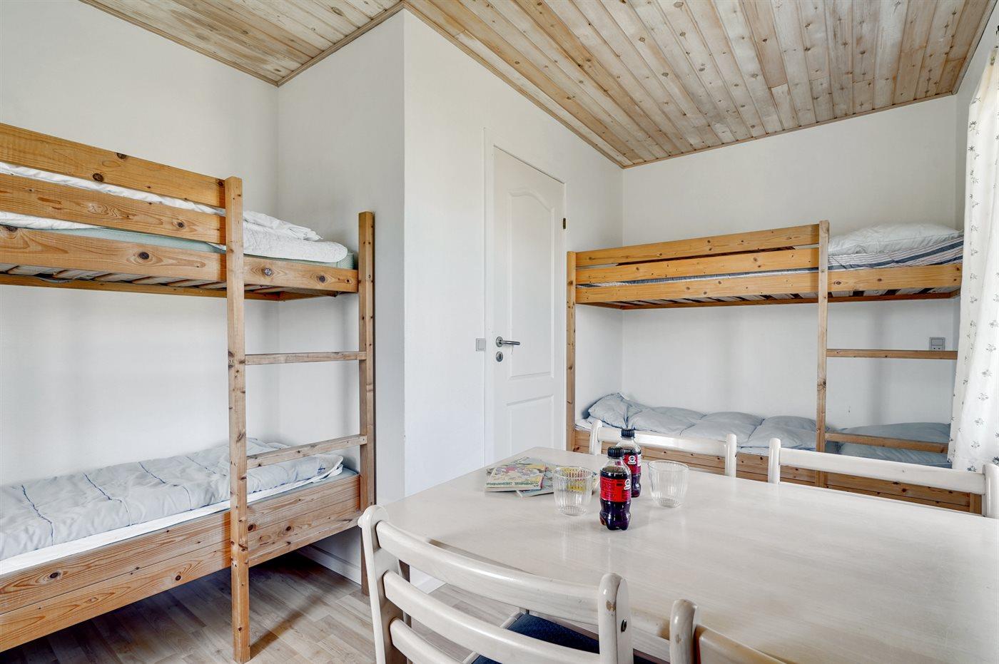 Der er i alt 3 soveværelser. Sovepladserne fordeler sig på: 2 sovepladser i dobbeltseng. 2 sovepladser i enkeltsenge. 2 sovepladser i køjeseng. Derudover er der 1 stk. barneseng.