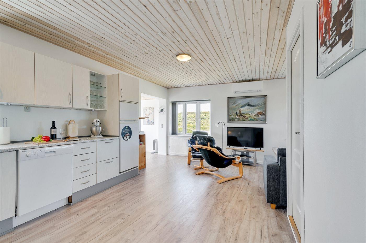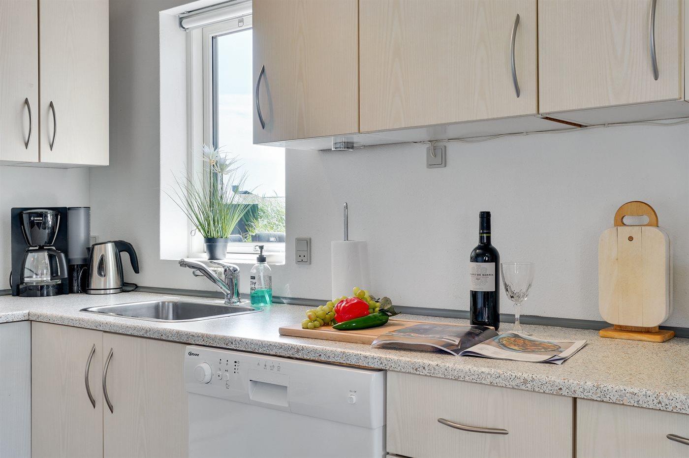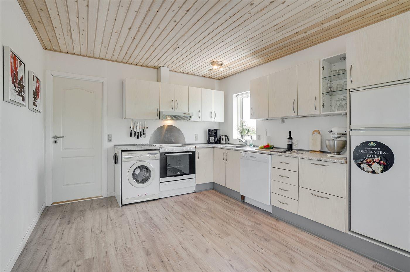 Køkkenet er udstyret med 1 køleskab. Der er 4 keramiske kogeplader, varmluftovn, mikrobølgeovn samt opvaskemaskine.