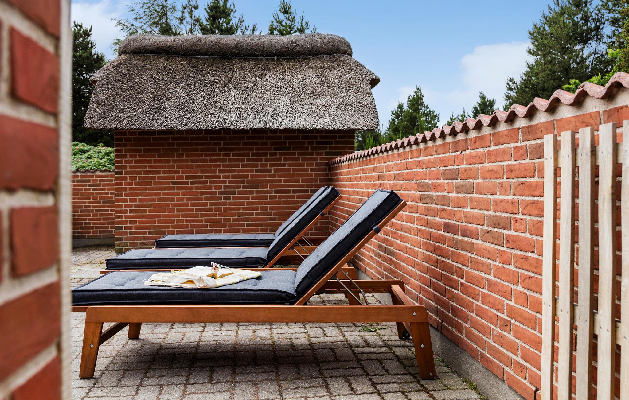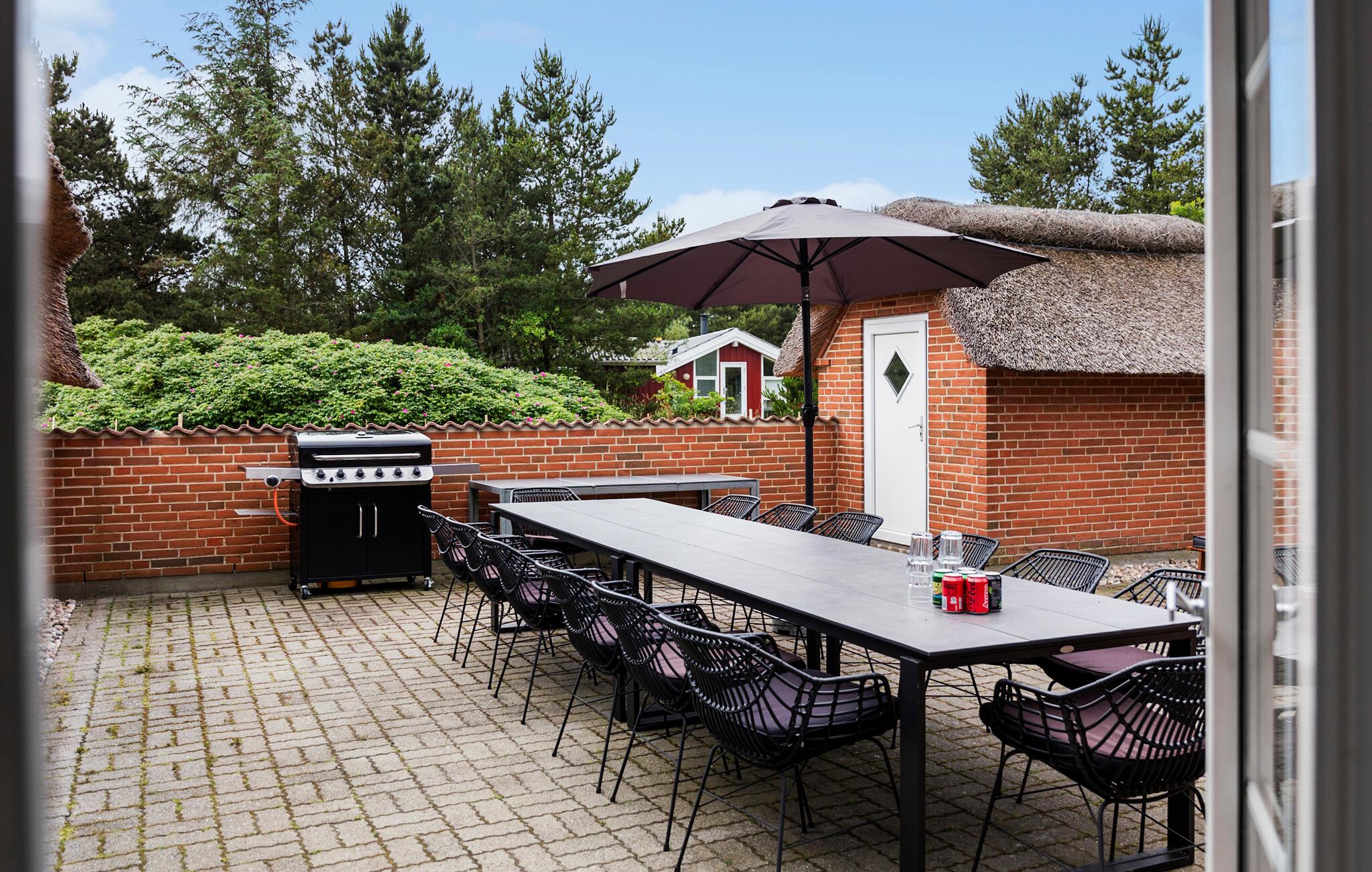 Udenfor fortsætter oplevelserne. Den store, lukkede terrasse indbyder til solbadning, afslapning og hyggelige grillaftener i de lune sommernætter. Haven er stor og en del er indhegnet, så både børn og hunde kan lege frit og trygt. På grunden er der desuden anlagt en natursti, hvor I kan gå små ture og nyde den fredelige stemning. Huset har også sin egen beachvolleybane med ægte strandsand samt forskellige legeredskaber.