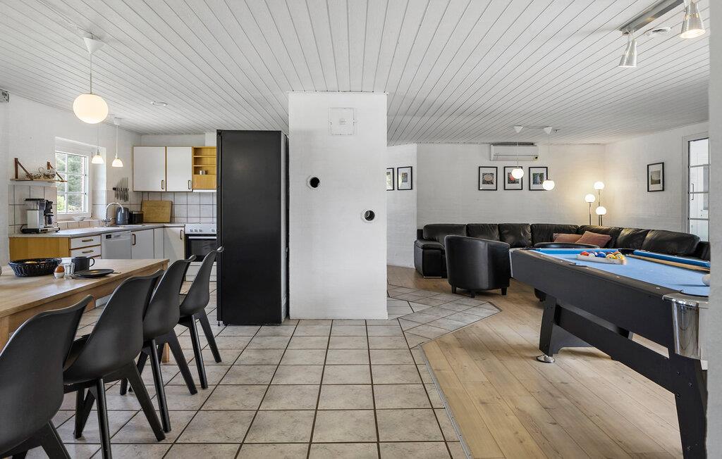 Jeres hus er hyggeligt indrettet og byder på et lyst, åbent køkken-alrum med spisebord og sofa, hvor I kan samles til madlavning, spisning og hyggelige stunder. En af husets aktivitetsmuligheder er den indbydende poolafdeling, hvor der er swimmingpool med modstrømsanlæg, spabad med massage og en dejlig sauna, der sørger for velvære hele året rundt. I kan også udfordre familien til et parti billard ved poolbordet.