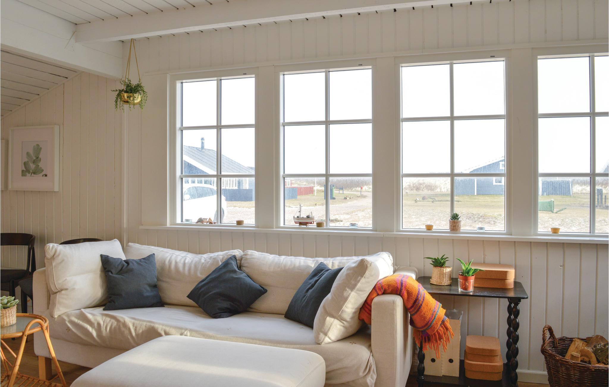 Dette hyggelige feriehus er beliggende i det rolige område Fjand helt op til klitten. Huset er indrettet med et kombineret køkken- og stueområde hvor I både har køkken, spiseplads, sofaarrangement med brændeovn og udgang til terrassen. I selve huset findes to soveværelser hvoraf det ene er et gennemgangsværelse, i annekset, der ligger på den modsatte side af terrassen, findes yderligere to sovepladser. Huset er familiært indrettet, og indbyder til mange hyggelige stunder. Terrassen er delvist overdækket, hvilket giver Jer mulighed for at nyde den friske havluft, selvom det småregner eller blæser.