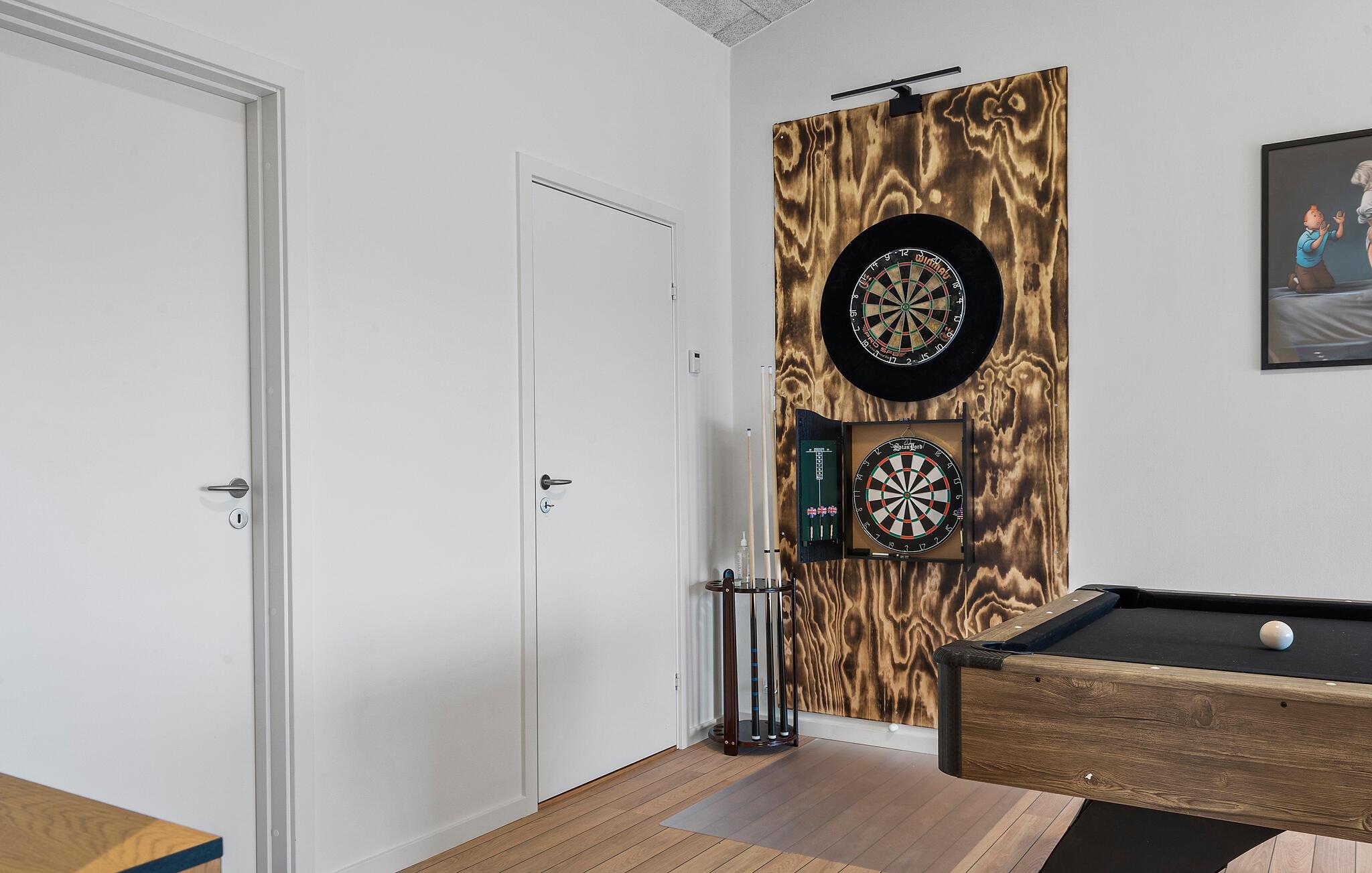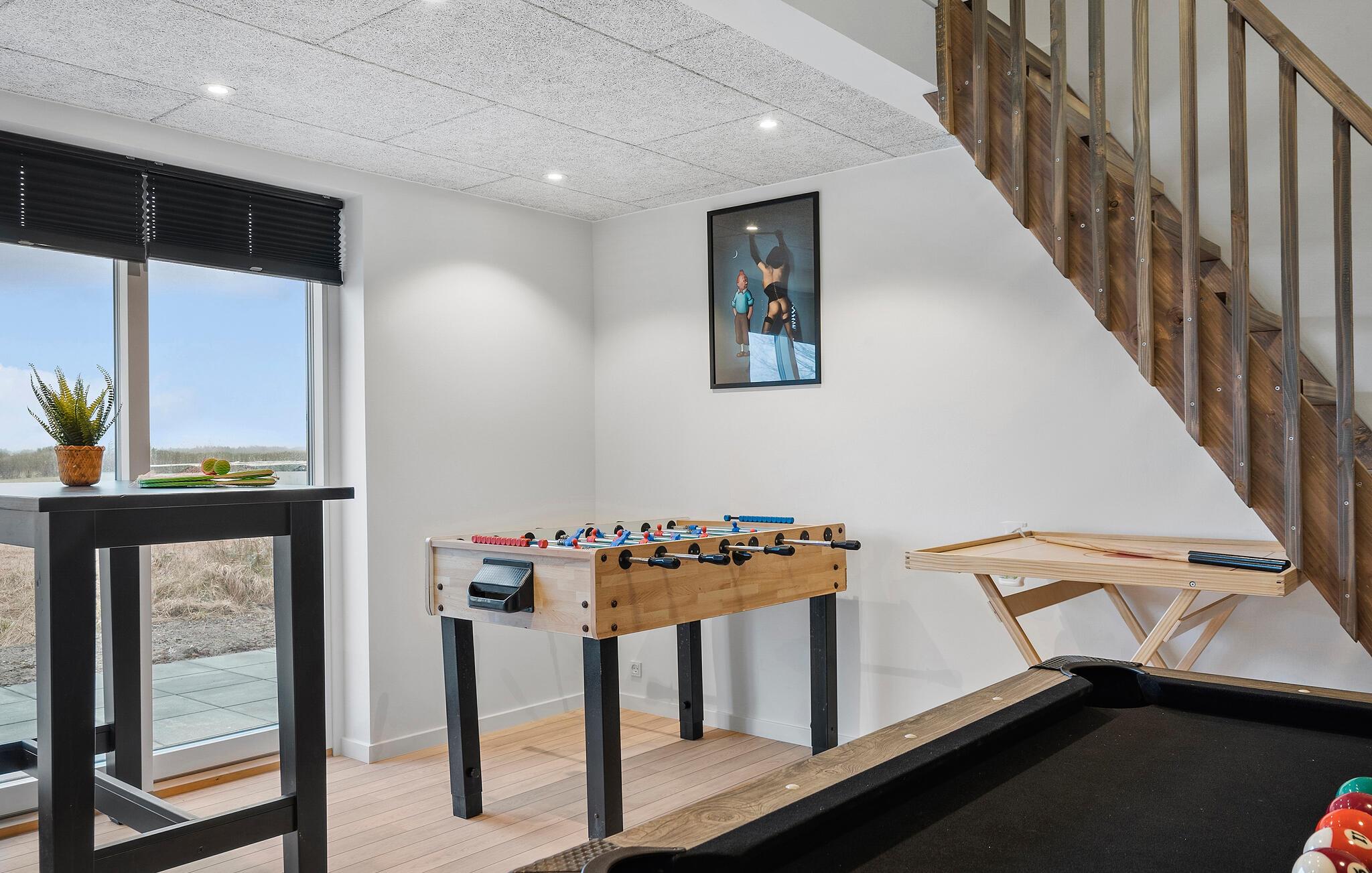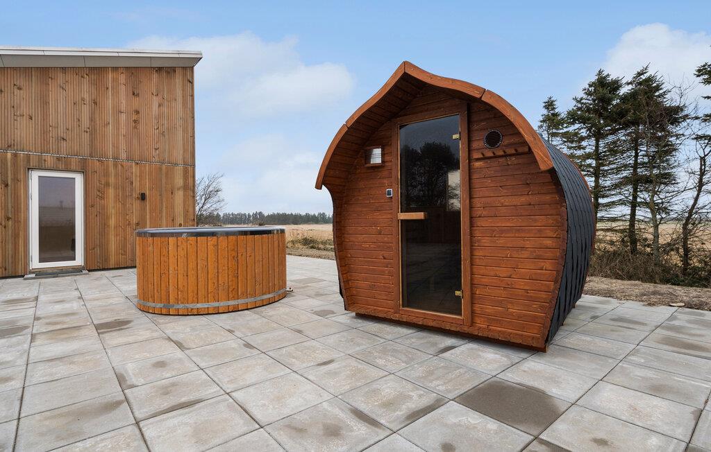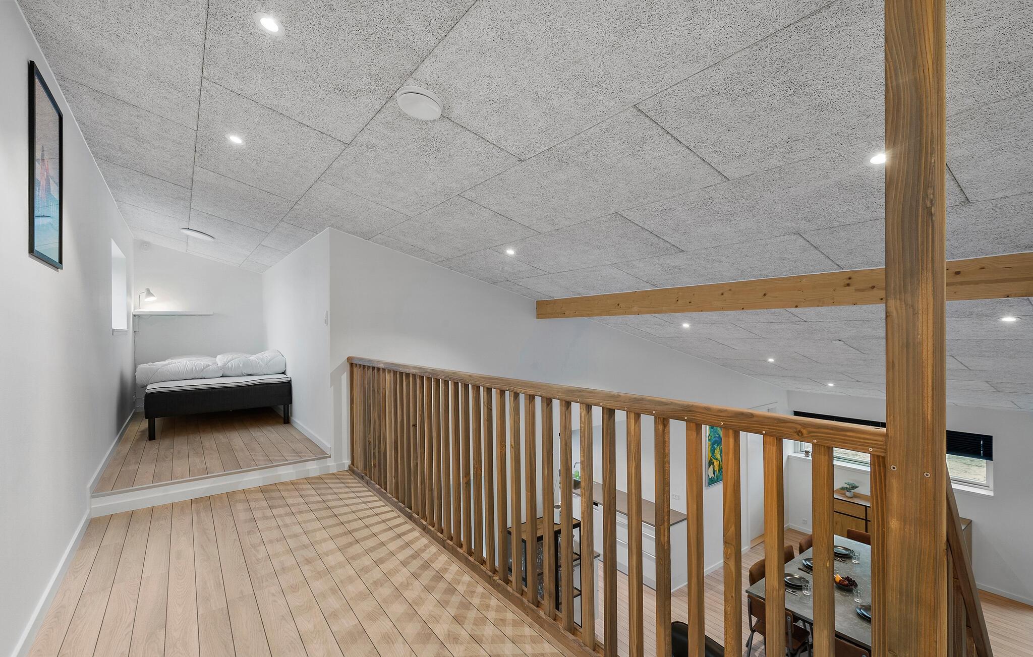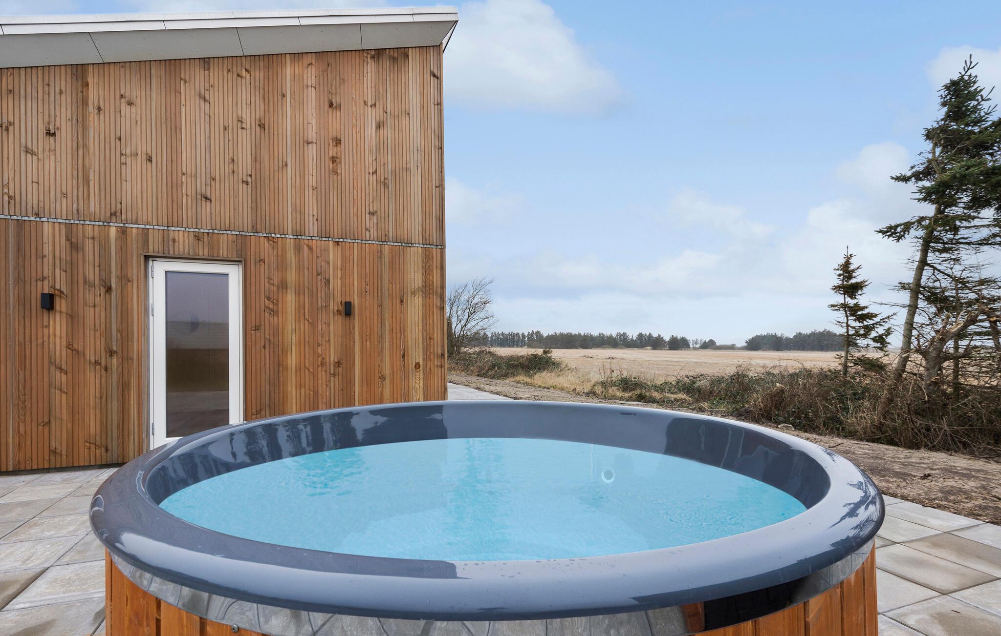 Den smagfulde indretning skaber en behagelig atmosfære, hvor I straks vil føle jer hjemme. I den åbne opholdsstue med åben førstesal kan I nyde mange gode timer sammen sammen eller nyde en stille stund i de hyggelige soveområder. Aktivitetslokalet giver jer et godt sted at samles og få et hyggeligt afbræk efter dagens udflugter. Læn jer godt tilbage i boblebadet eller nyd solen på terrassen, som har vildmarksbad og sauna. Børnene får gode rammer til at lege i haven, mens I tænder op i grillen.