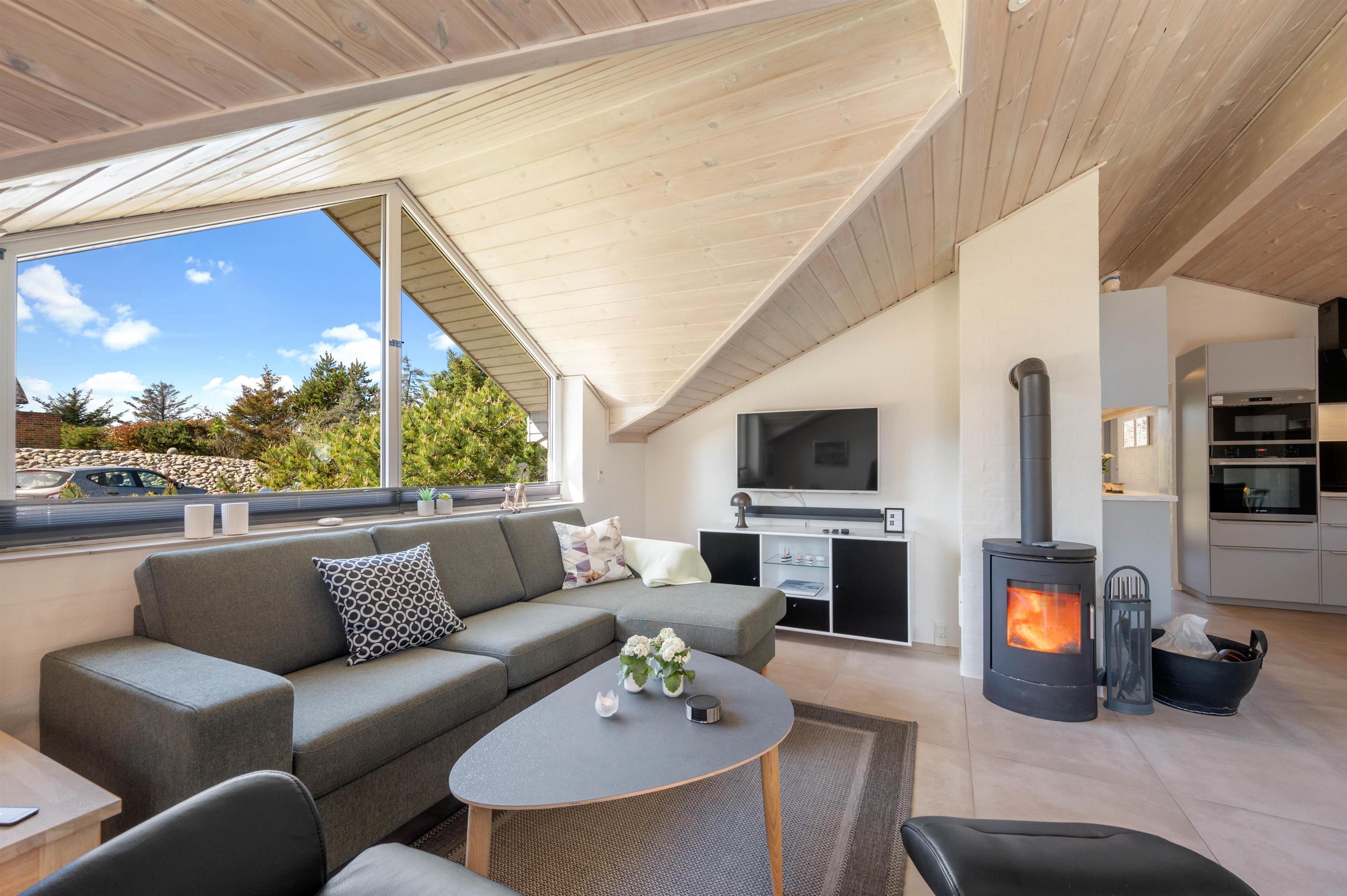 Indretningen er lys og indbydende med brændeovn, og der er ekstra luksus i form af både spa og sauna. Her er rig mulighed for at slappe af efter en dag ved Vesterhavet.