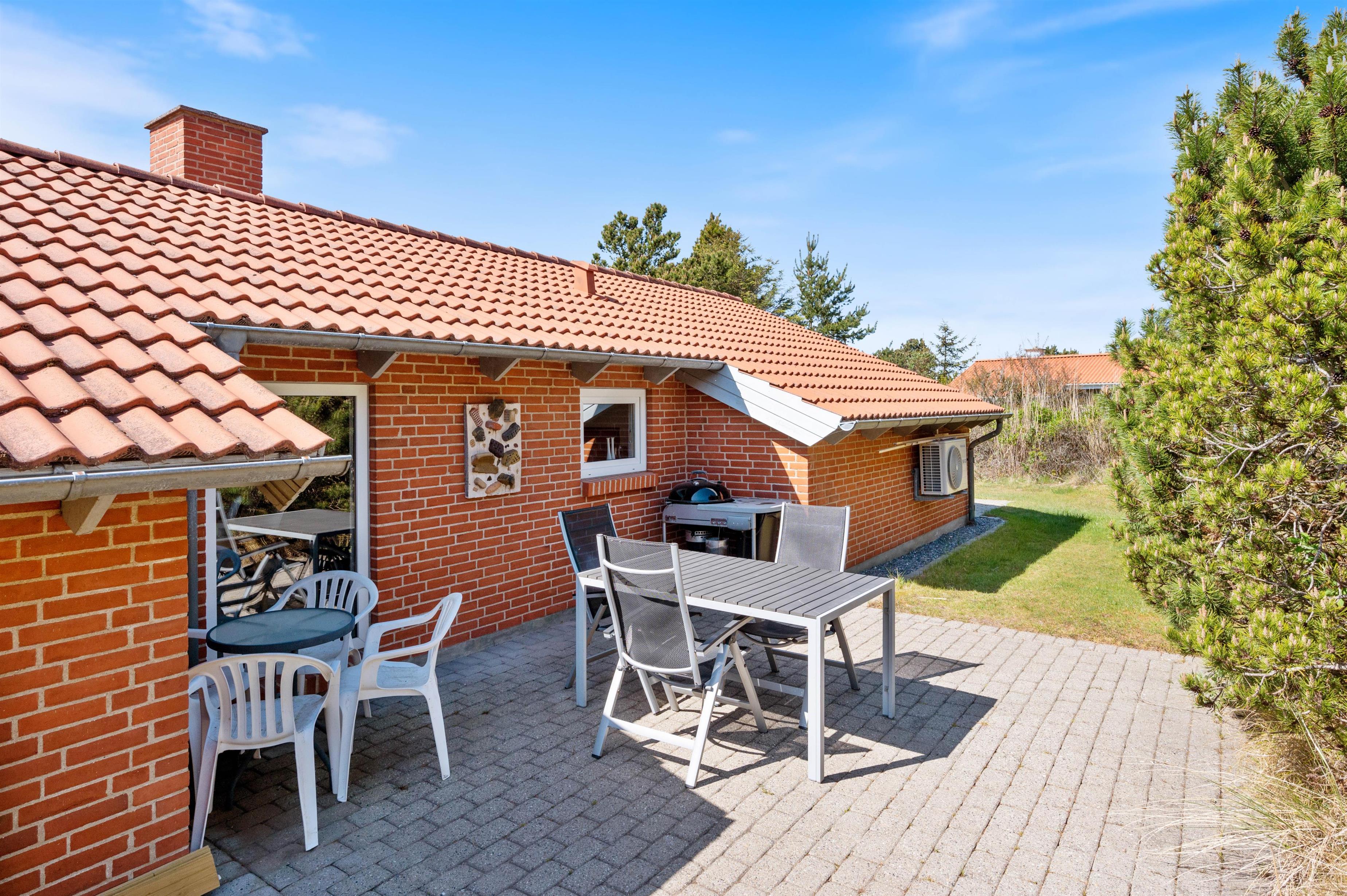 Mens børnene leger i haven og gynger på gyngestativet, kan I finde jer en god plads på en af feriehuset terrasser, hvor I kan læne jer tilbage og slappe af i havemøbler og liggestole. Om aftenen kan I tilberede en lækker middag på grillen.