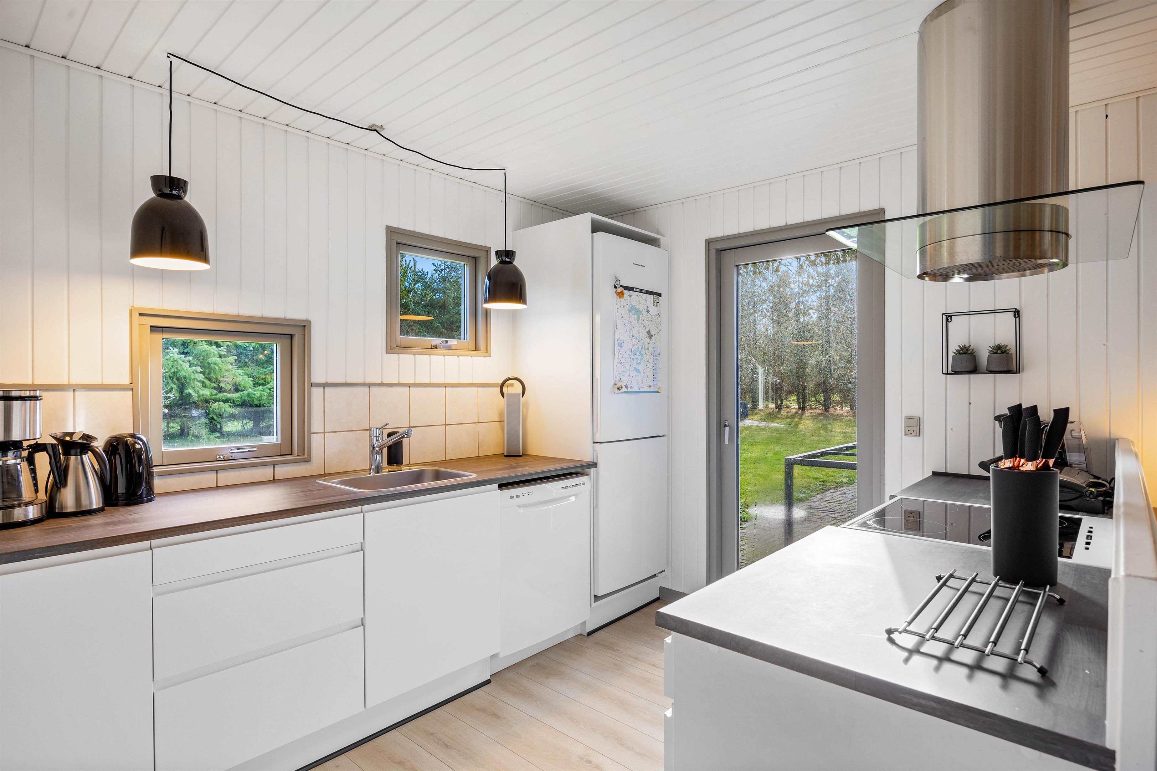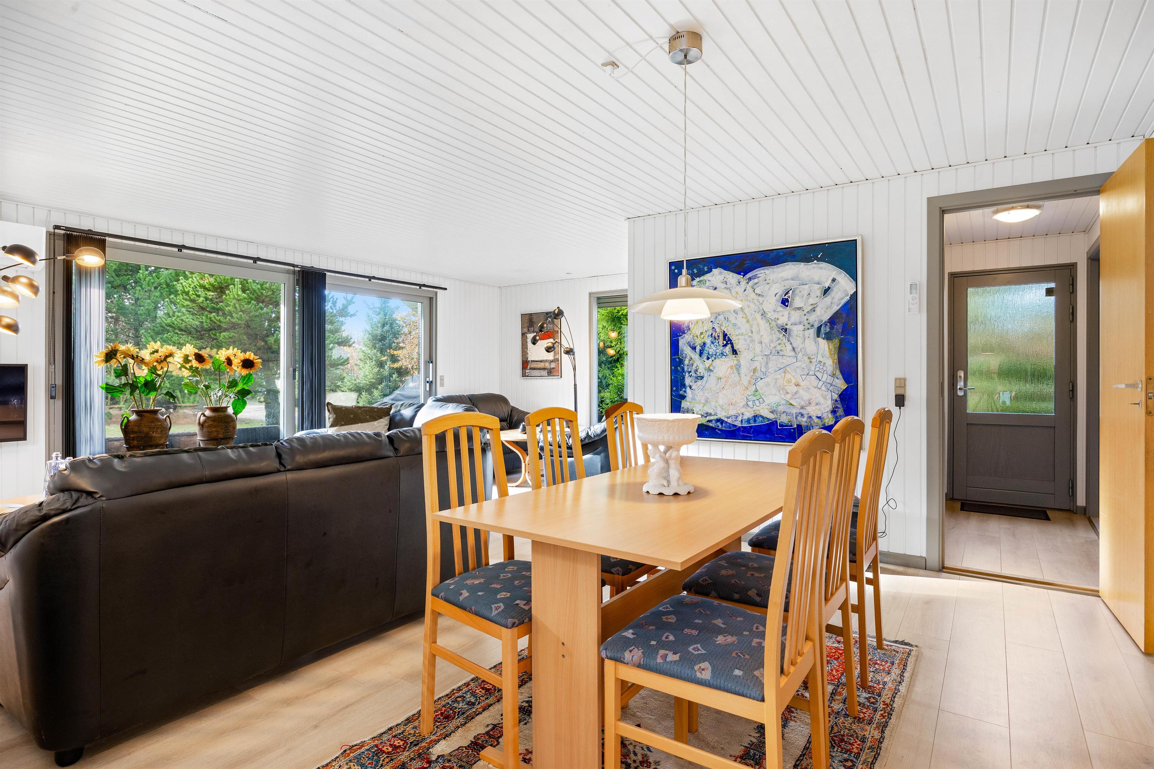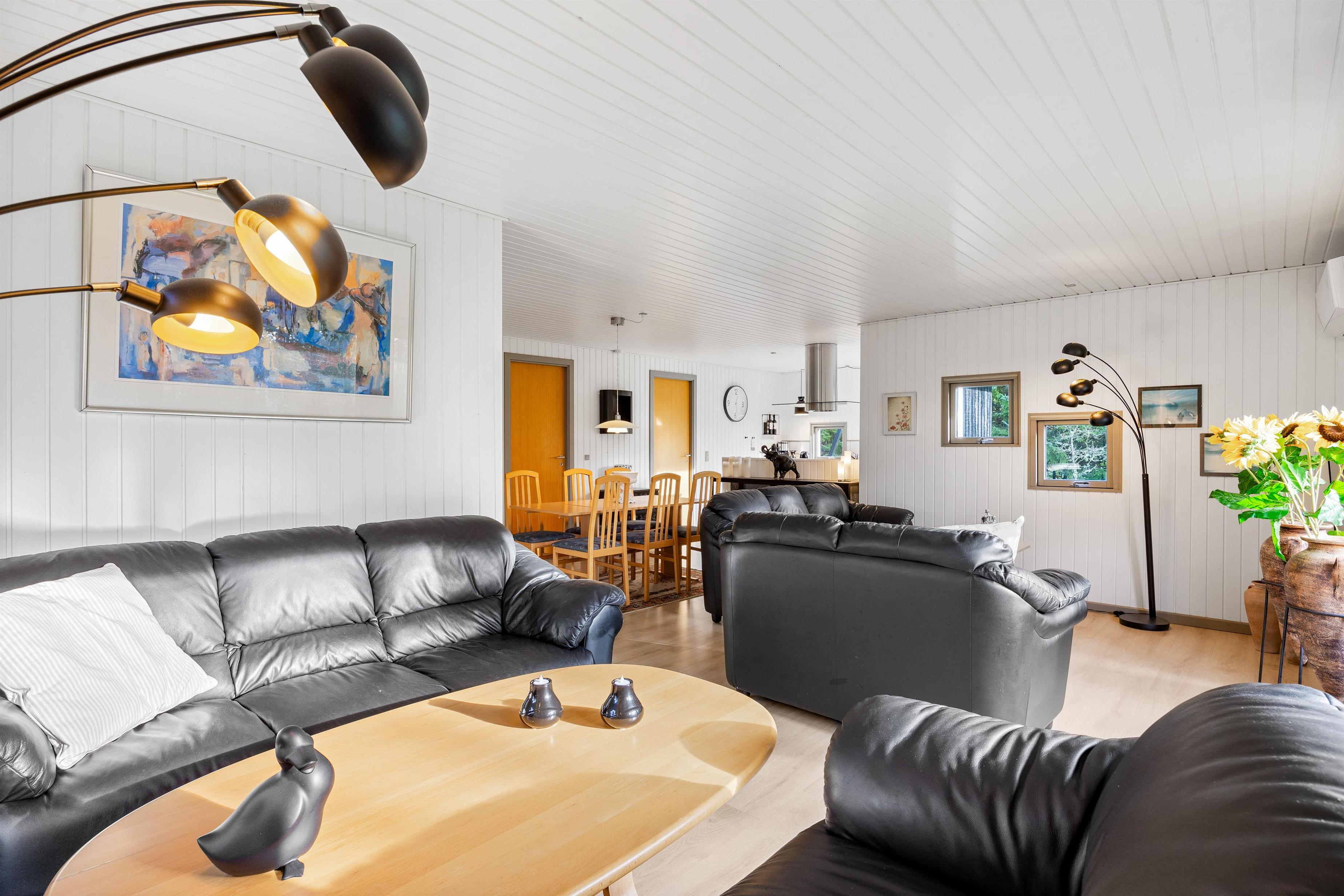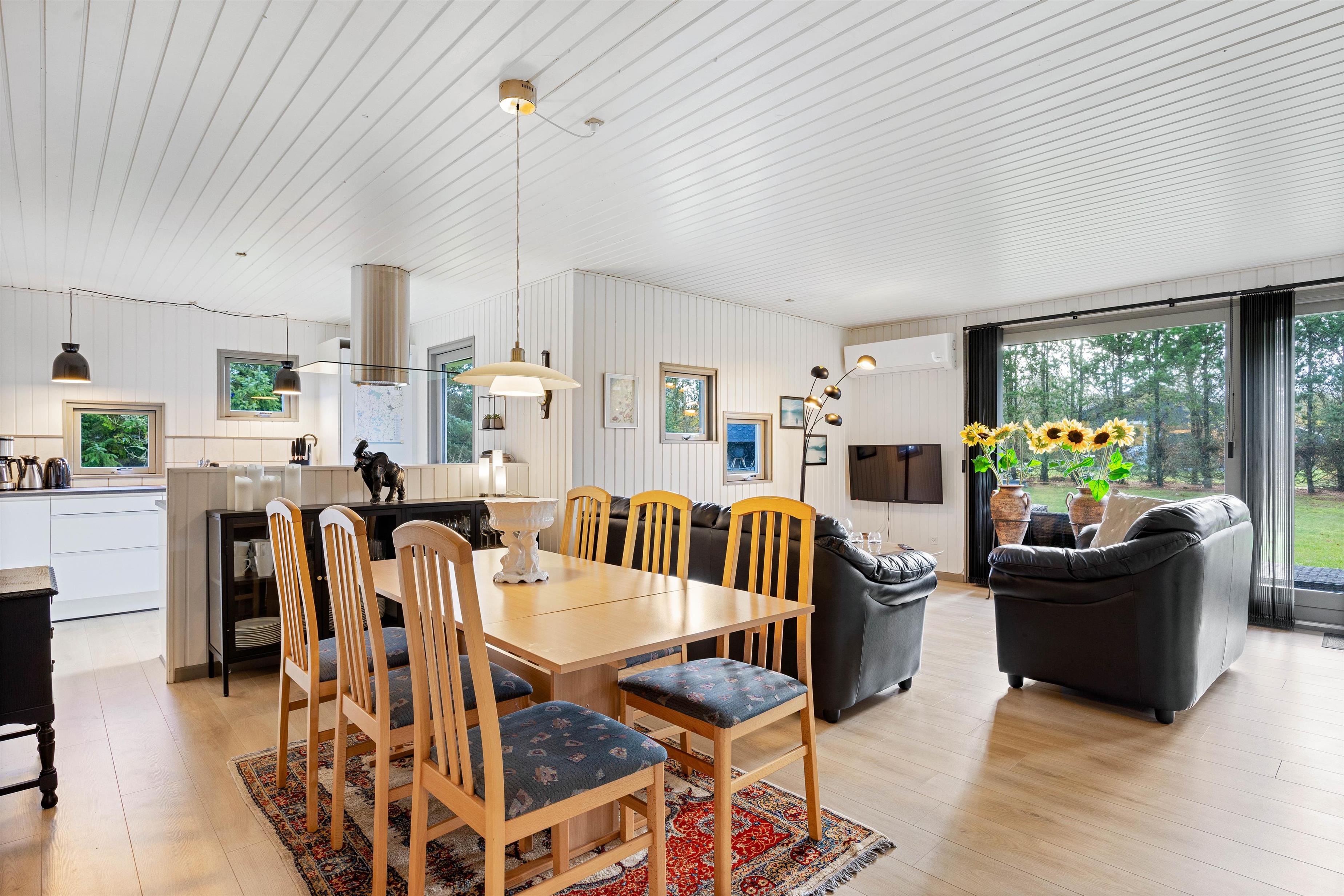 Feriehusets midtpunkt er den store stue, som forbinder køkken, opholdsstue og spiseplads. Her kan du tilbringe mange hyggelige timer med at spille forskellige spil eller lave mad. På regnvejrsdage kan I se en film sammen på fladskærms-tv'et.