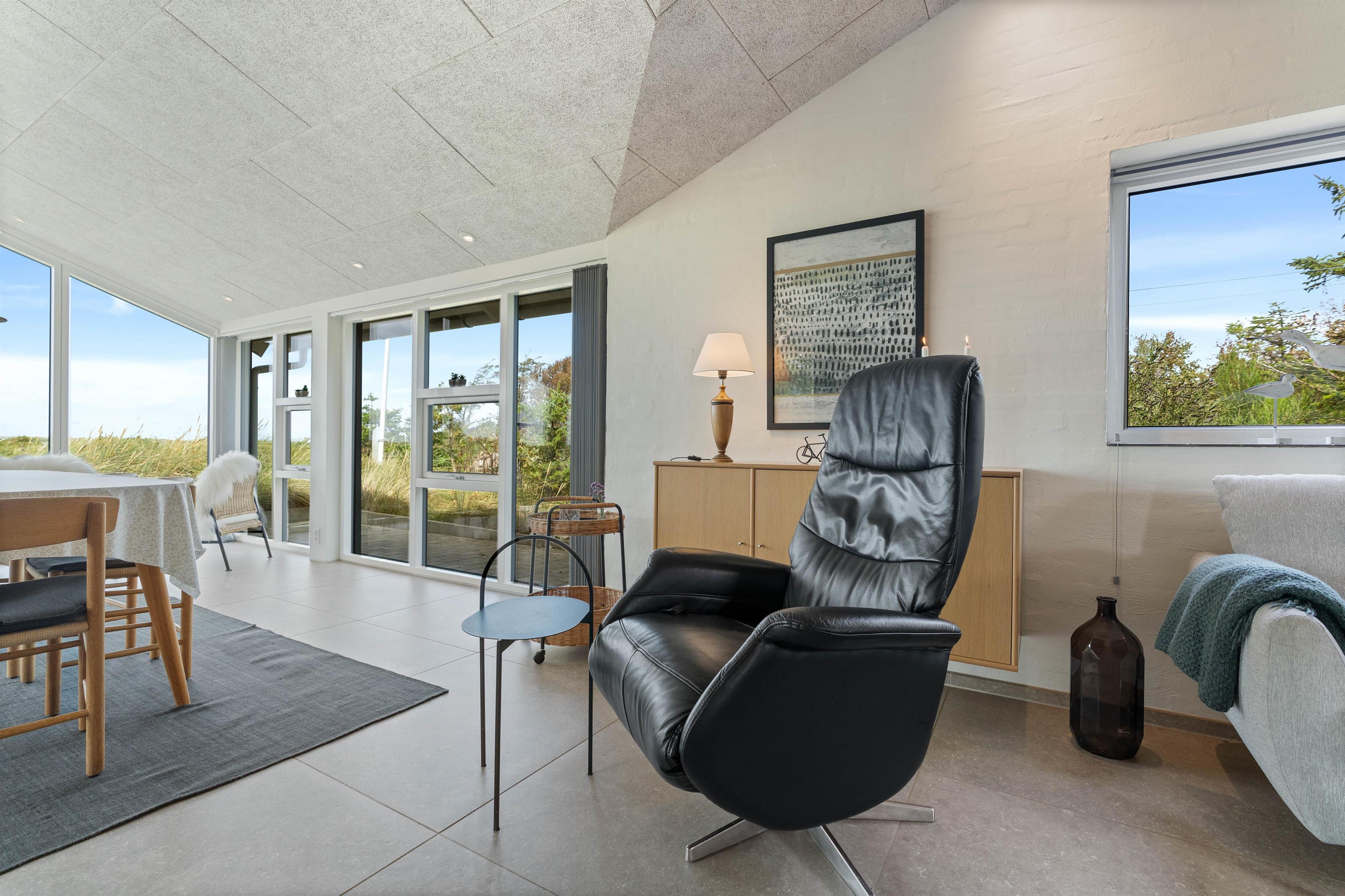 De store vinduer i opholdsrummet giver et skønt lysindfald og ikke mindst en rigtig fin udsigt til den grønne natur og et kig til både klitter og fjorden. Spisestue, stue og køkken er kombineret til ét stort fællesrum med masser af mulighed for samvær og hygge på højt plan i rolige ferieomgivelser.