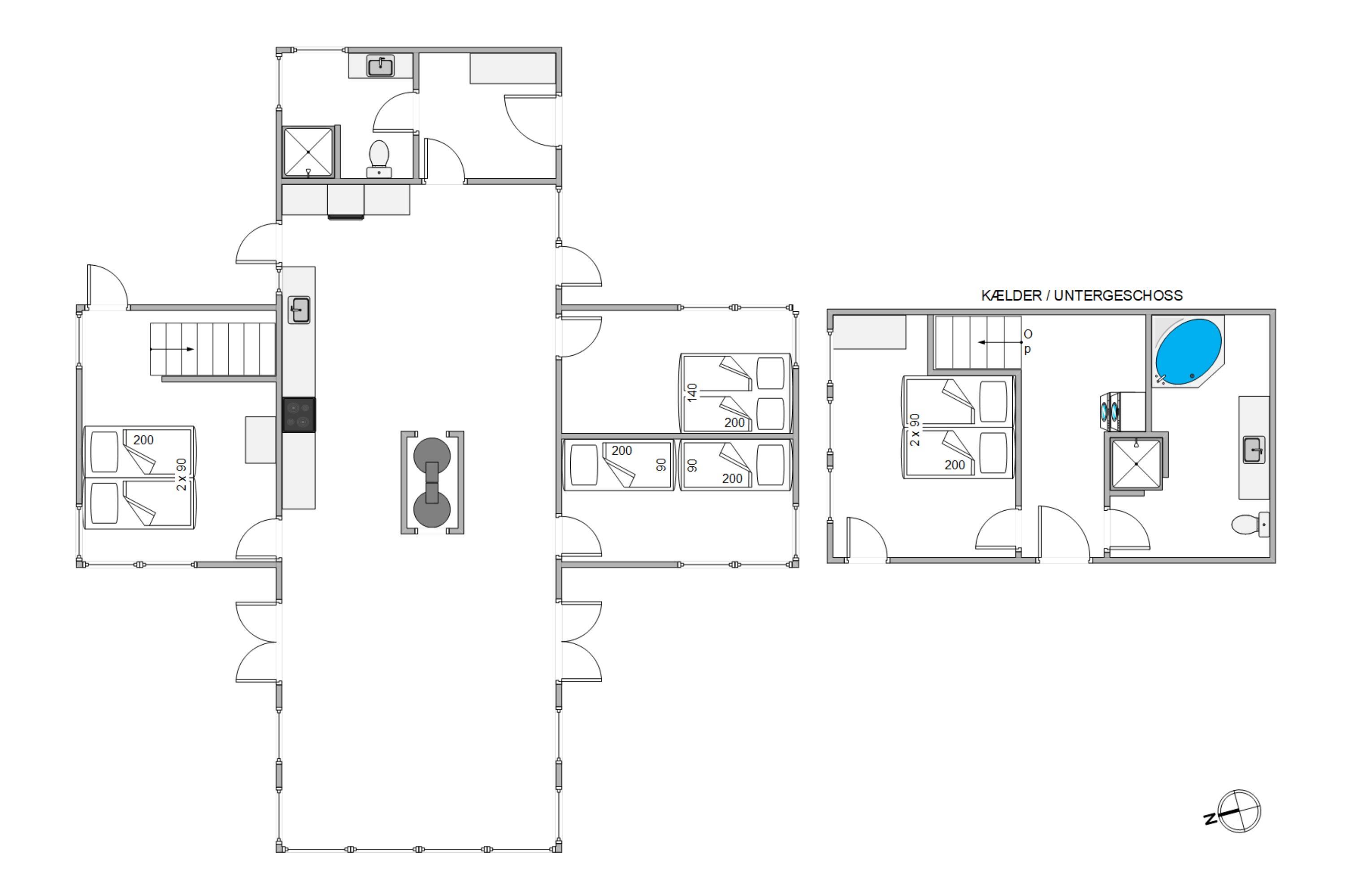 På samme etage finder I et badeværelse og 3 soveværelser, hvoraf det ene er et gennemgangsrum, så I kan komme ned i kælderen via trappen. I kælderen finder I endnu et soveværelse. Der er direkte adgang til en af terrasserne. Der er også et stort badeværelse med spa. For at gøre jeres ferie lettere er der vaskemaskine og tørretumbler i feriehuset.