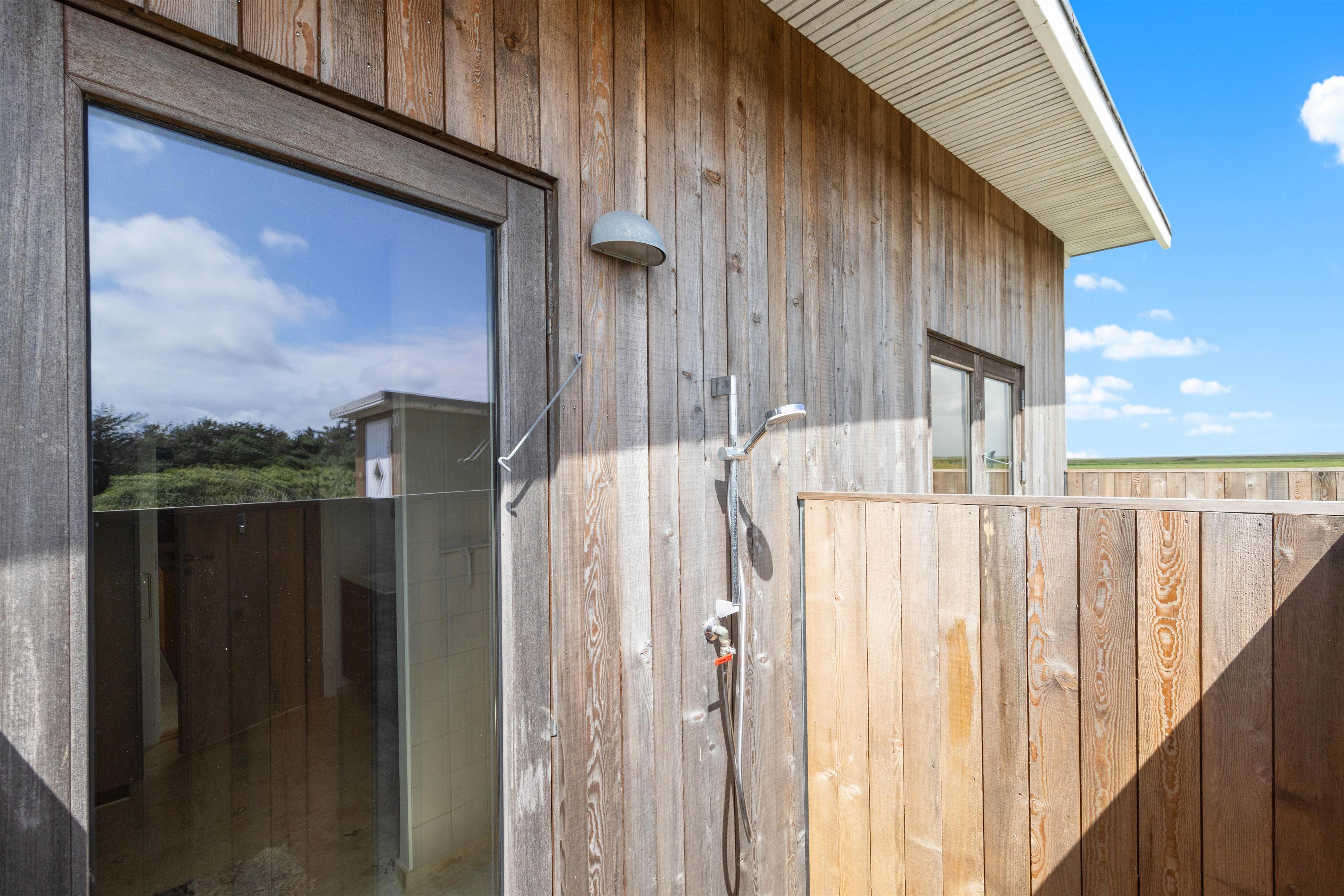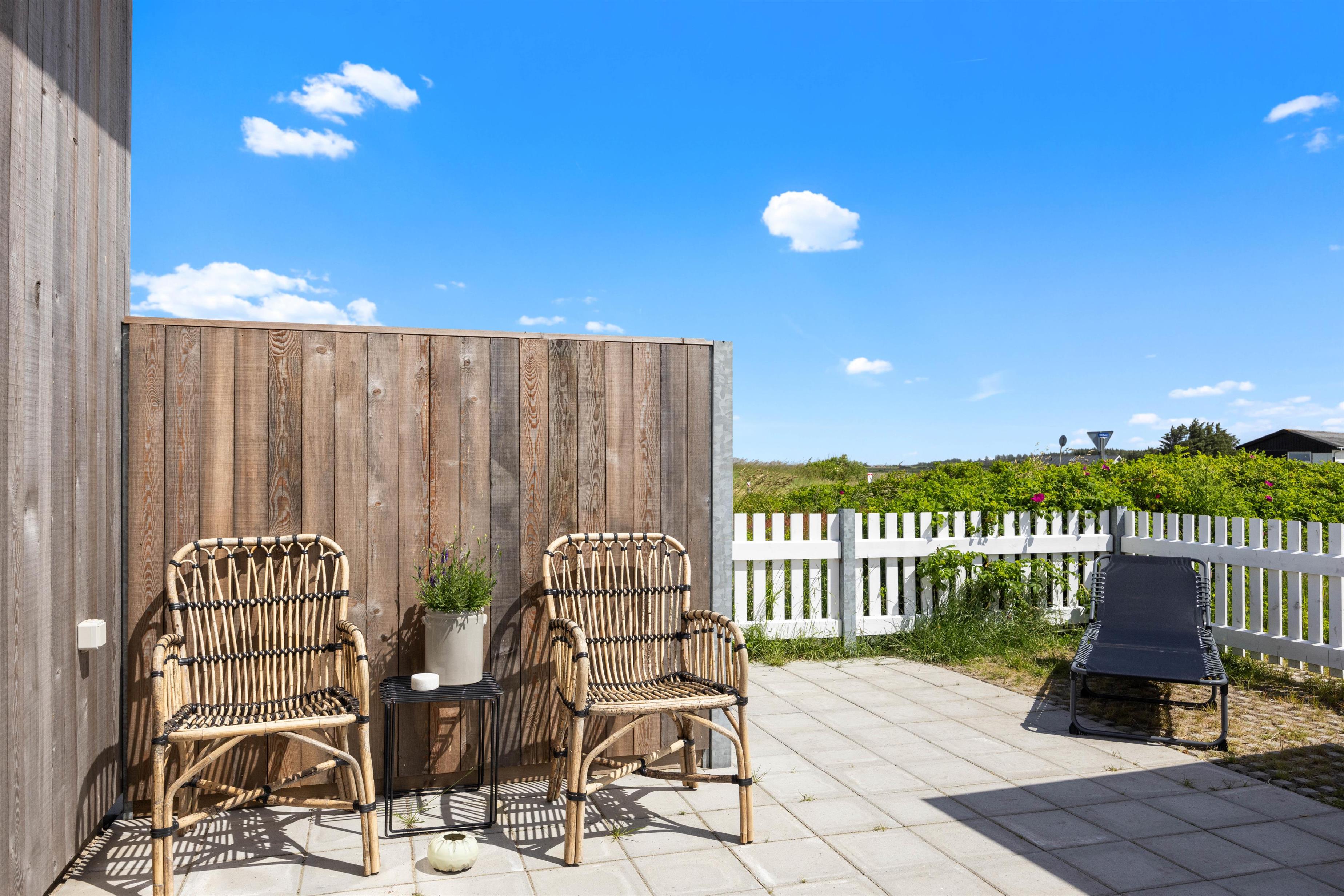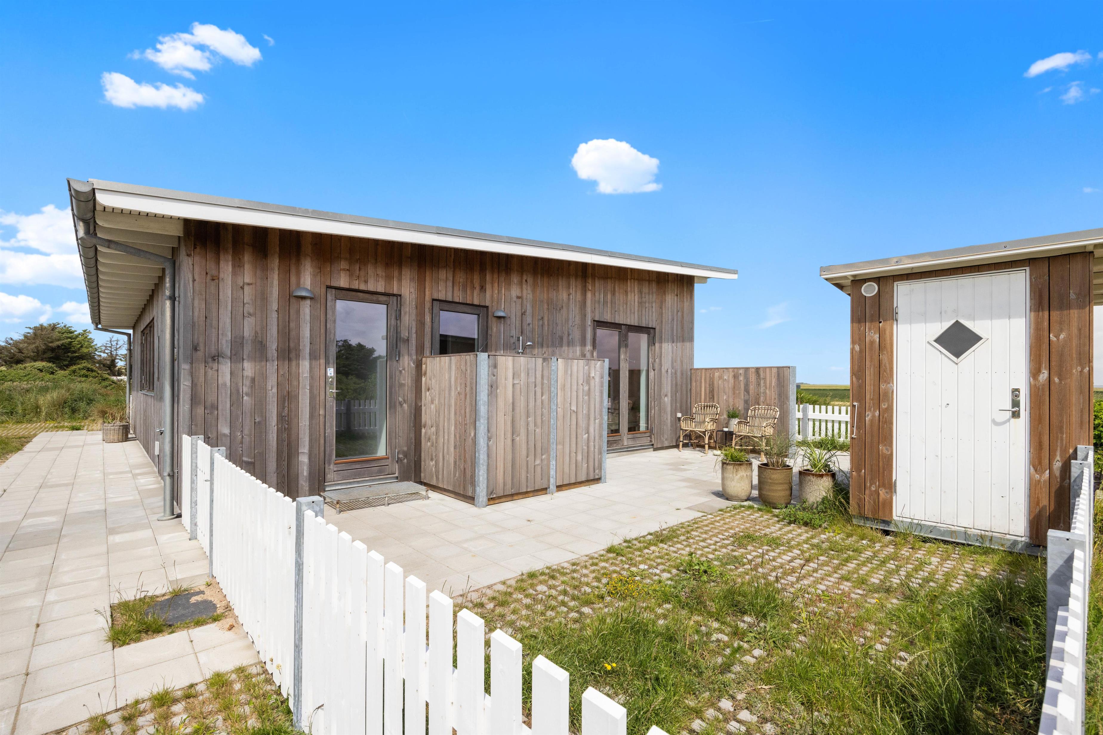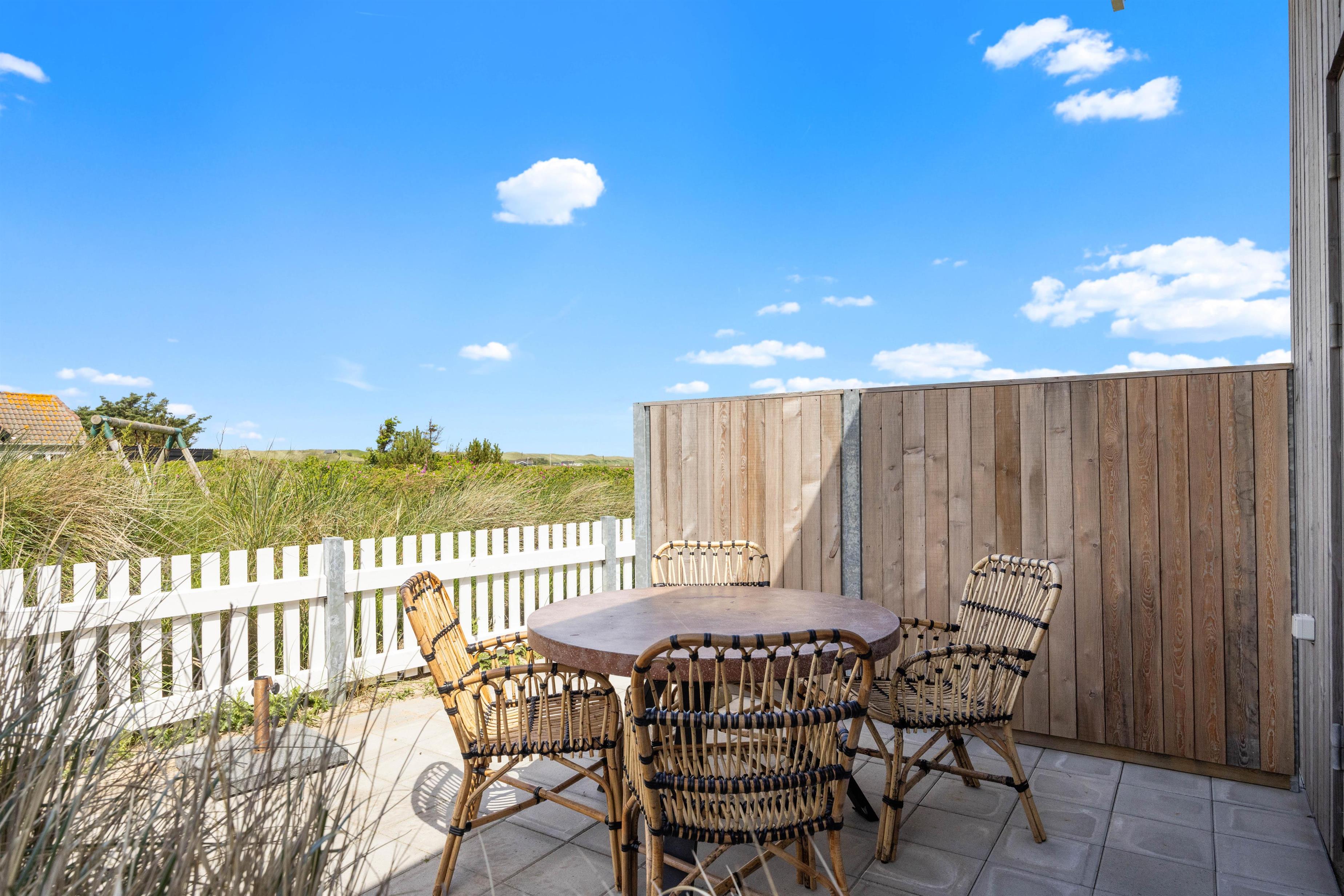 Sommerhuset er omgivet af en lukket terrasse, der løber hele vejen rundt om huset, med udgang fra både stue og soveværelse. Der er desuden havemøbler, grill og solvogn til fri afbenyttelse, så I kan nyde det gode vejr på terrassen. På terrassen finder I også en afskærmet udebruser, hvor I kan skylle sandet af fødderne om sommeren efter en dejlig lang gåtur nede på stranden i det fine hvide sand. Med kun 310 meter til havet er det oplagt at tilbringe mange feriestunder her.