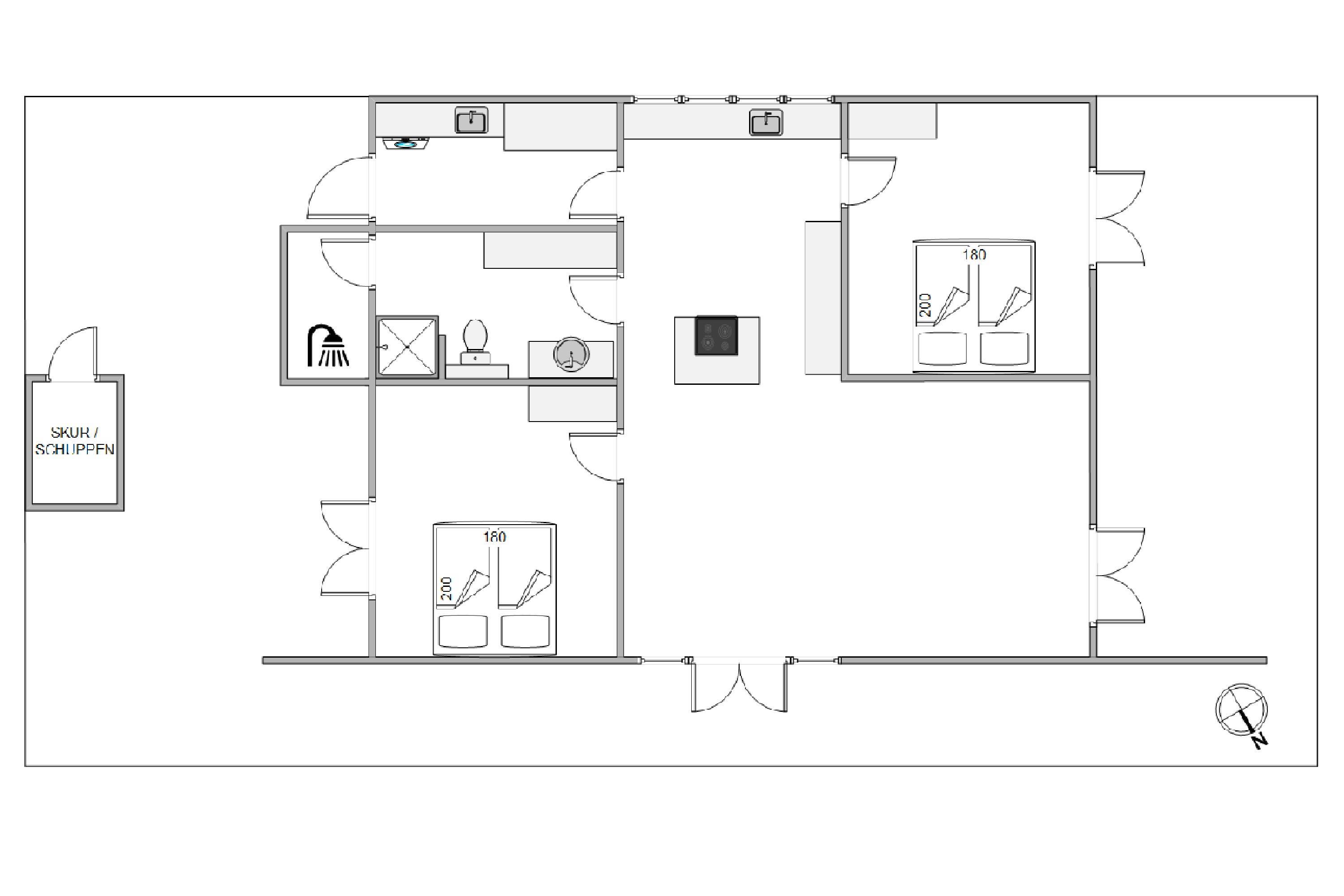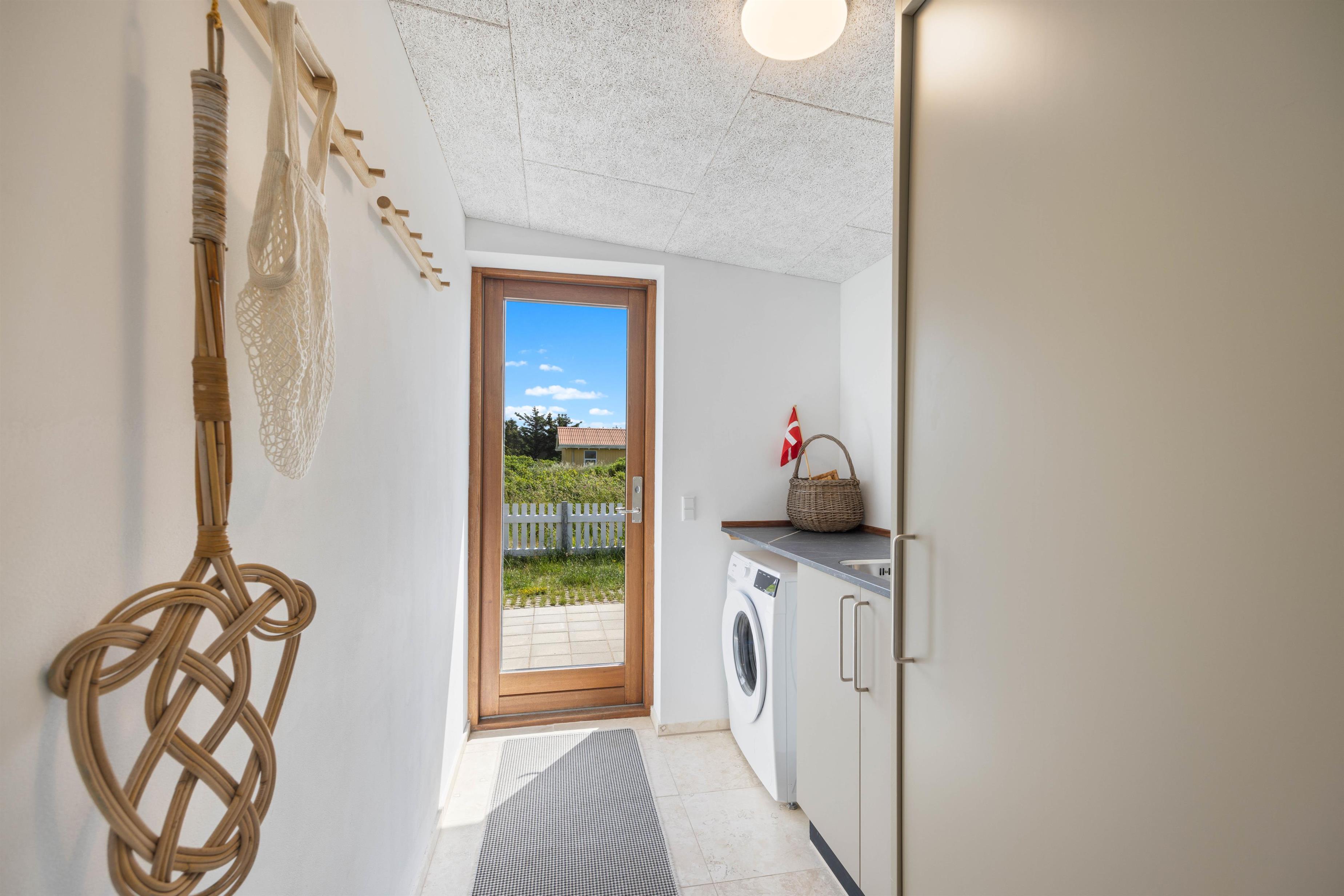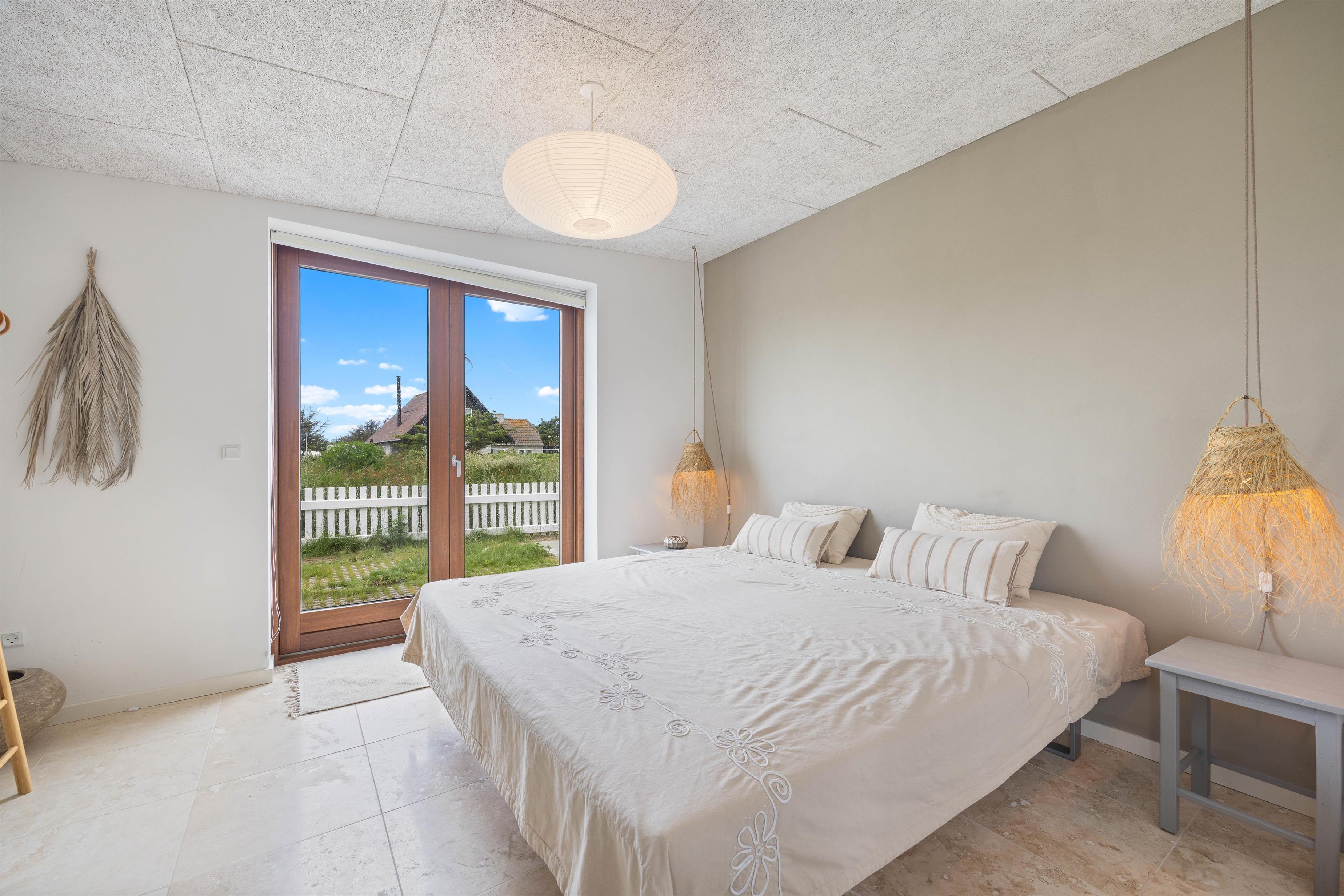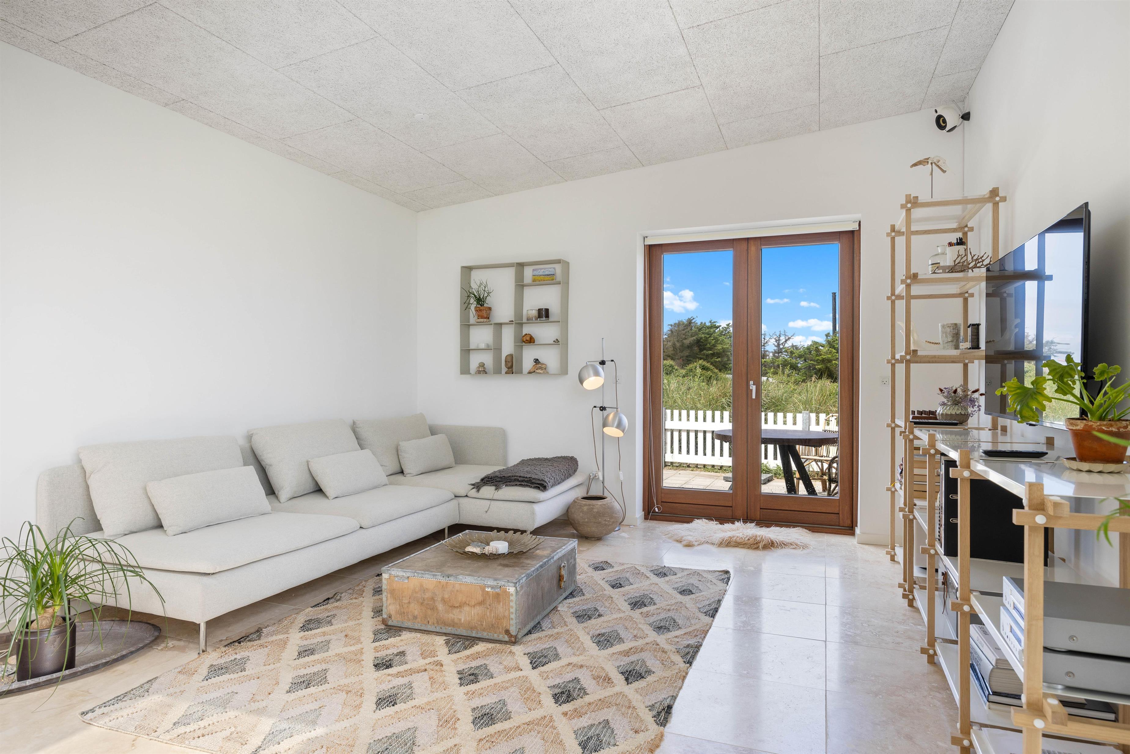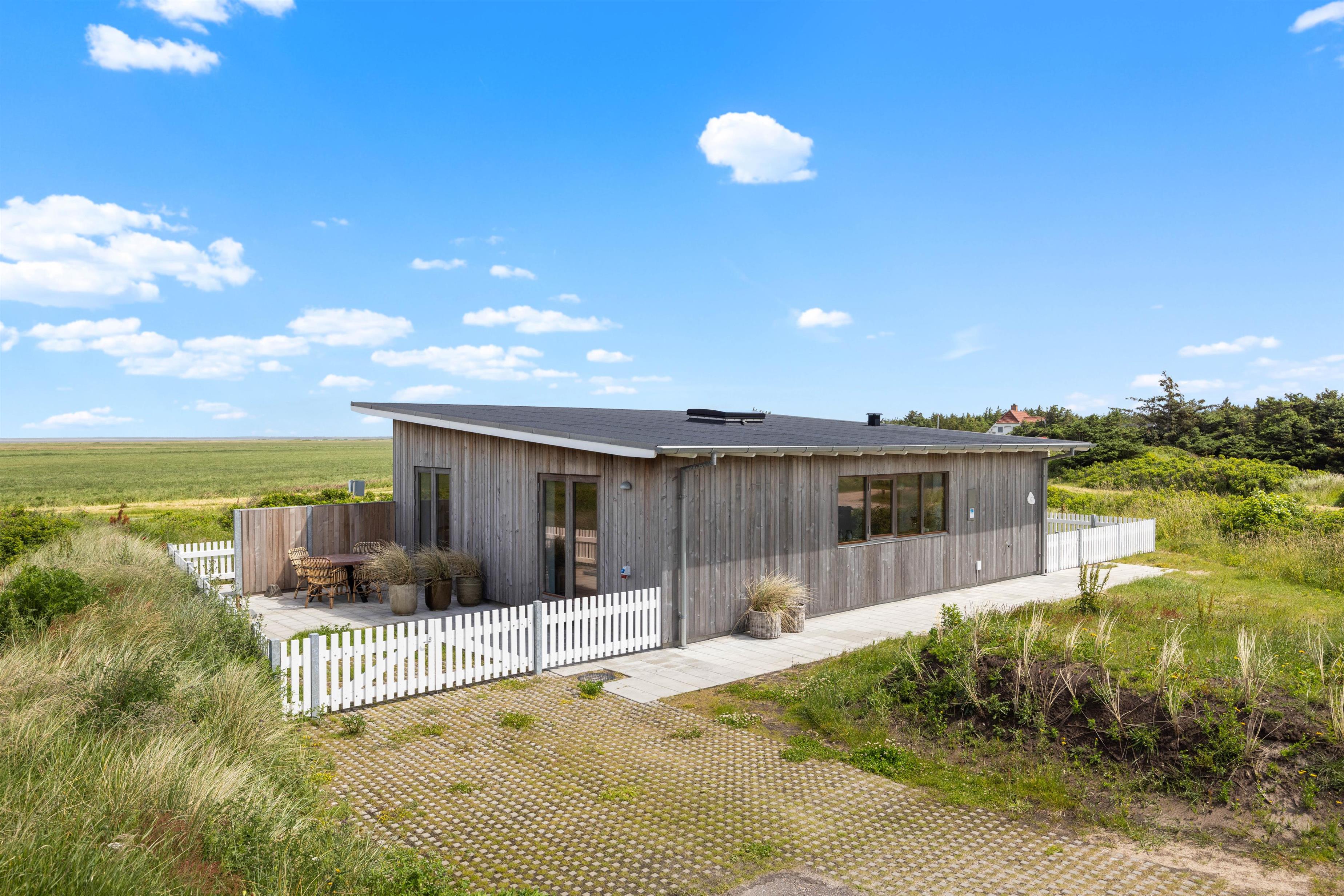 Sommerhuset er omgivet af en lukket terrasse, der løber hele vejen rundt om huset, med udgang fra både stue og soveværelse. Der er desuden havemøbler, grill og solvogn til fri afbenyttelse, så I kan nyde det gode vejr på terrassen. På terrassen finder I også en afskærmet udebruser, hvor I kan skylle sandet af fødderne om sommeren efter en dejlig lang gåtur nede på stranden i det fine hvide sand. Med kun 310 meter til havet er det oplagt at tilbringe mange feriestunder her.