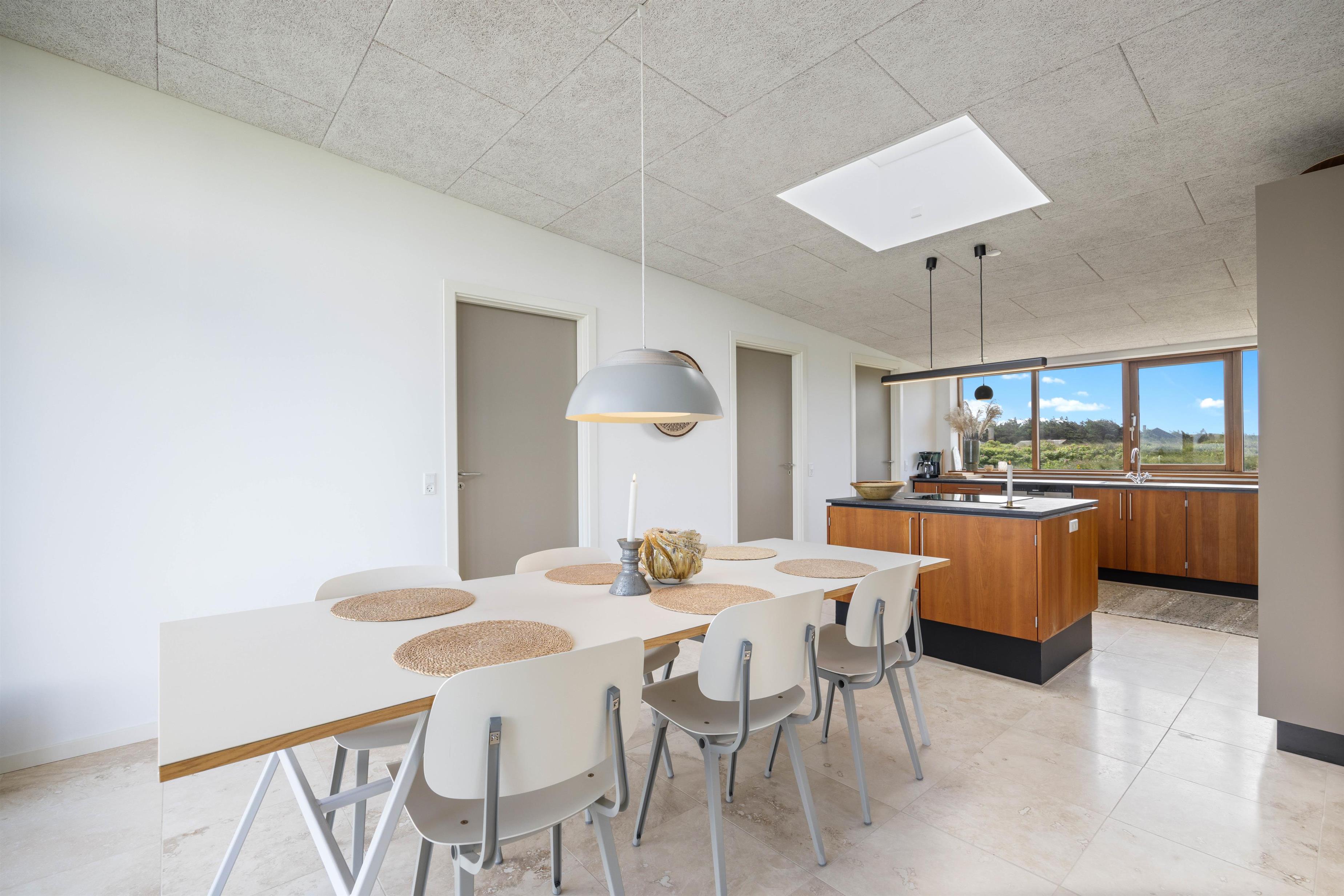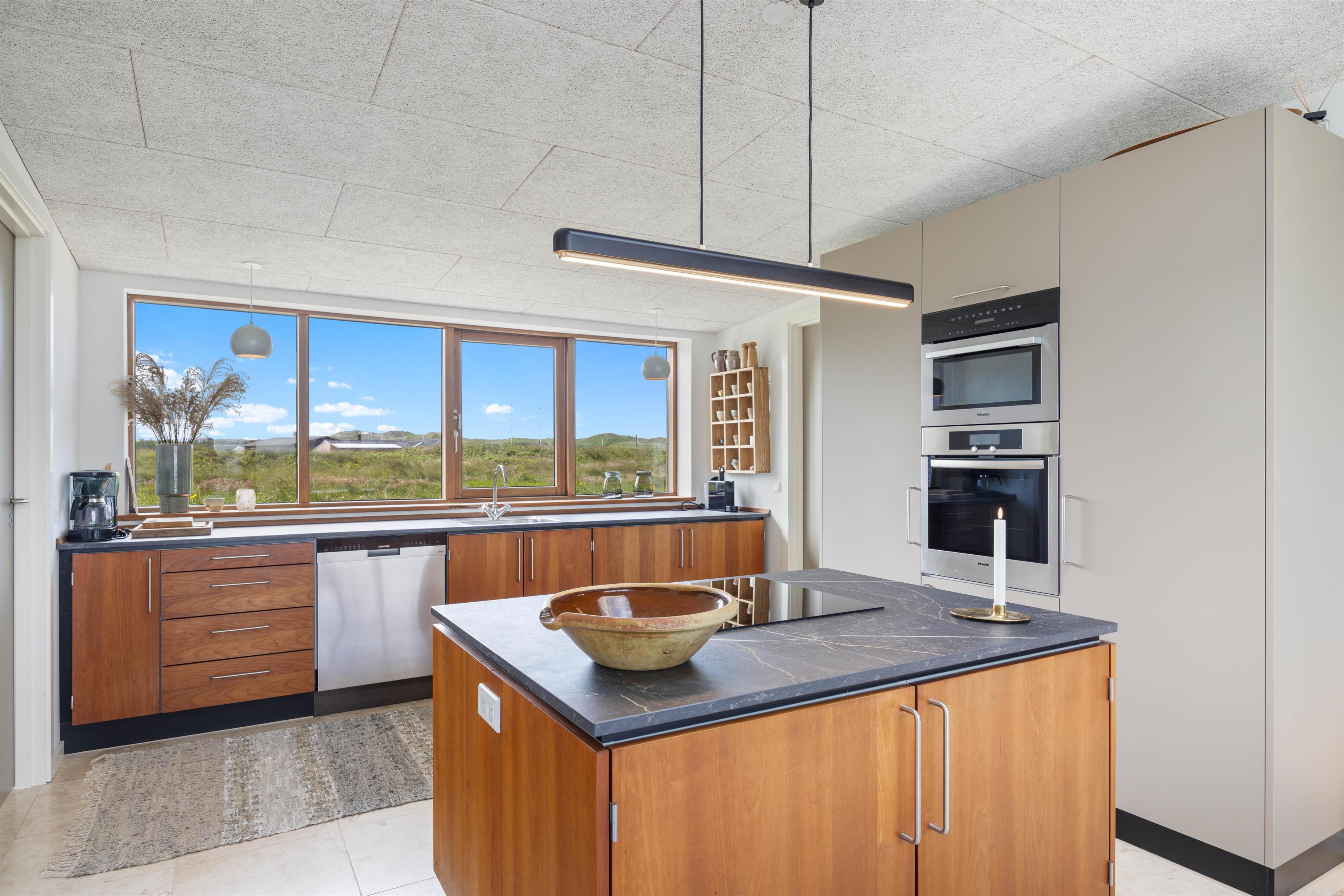 Bjerghuse 16 byder jer velkommen til en dejlig opholdsstue som er i direkte åben forbindelse med både stue og køkken. Der er 2 soverum, begge med dobbeltsenge. Interiøret er stilrent og indretningen er lys og venlig. Fra køkkenet har I en dejlig udsigt ud over klitlandskabet og det er fuldt udstyret med alt det nødvendige køkkenudstyr, I måtte ønske til at lave dejlig mad sammen på ferien - dog er der ingen emhætte. Alle kan følge med i madlavningen eller planlægningen af feriens kommende aktiviteter. Opvaskemaskinen klarer nemt opvasken efter madlavning.