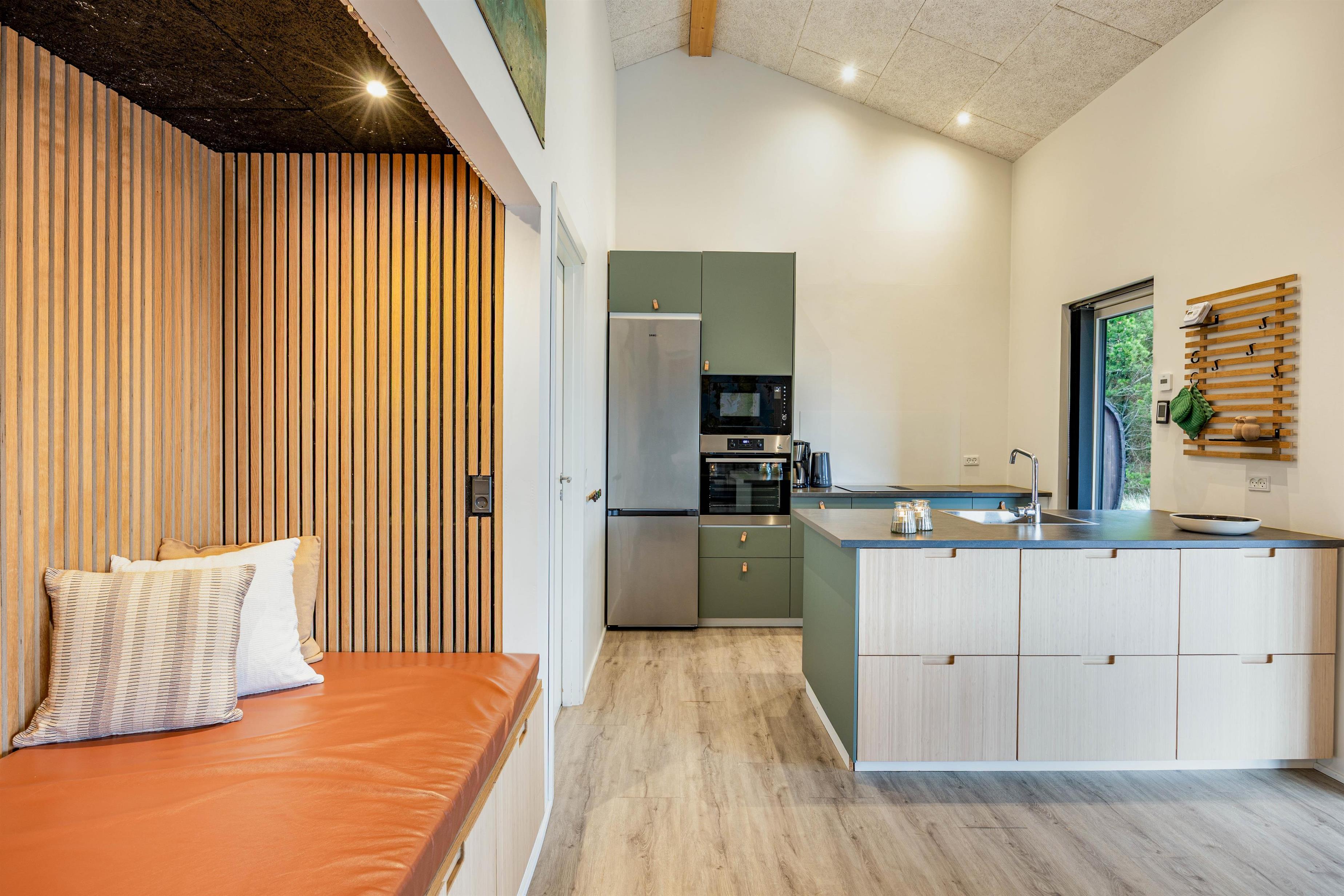 De lækre omgivelser byder jer straks velkommen. Her er der virkelig taget godt imod jer som gæster. Stue og køkken er i åben forbindelse, og der er indbygget en hyggekrog, som gør det muligt at samle hele familien i husets hjerte. Brændeovnen i stuen værner om hyggen, og foran den kan hele familien samles. Muligheden for en mere miljøvenlig opvarmning finder I også i husets luft-til-vand varmepumpe. Desuden kan I benytte det hurtige internet til at streame jeres yndlingsfilm.