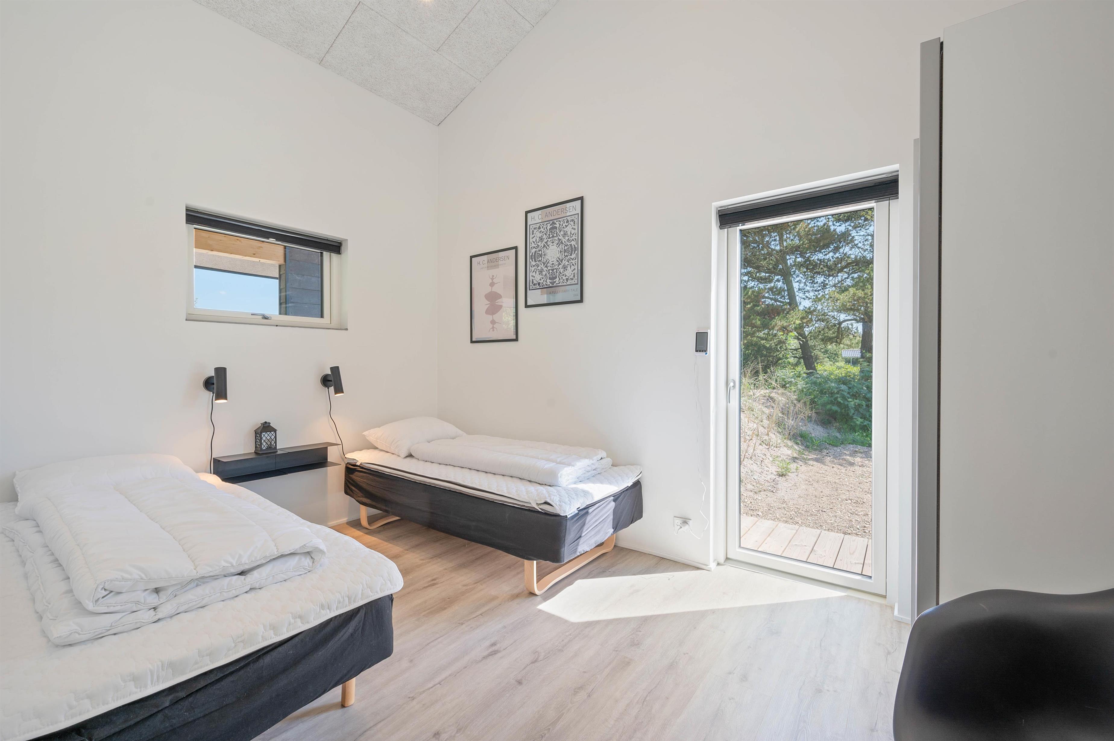 Dette sommerhus har hele 2 topmoderne badeværelser, hvor begge er udstyret med gulvvarme. Det er oplagt, hvis I er 2 familier, der holder ferie sammen, da hver familie kan få sit eget badeværelse. De 6 sovepladser er fordelt på 3 soveværelser, hvor 2 har dobbeltseng, og ét værelse har enkeltmandssenge – et oplagt værelse til teenagerne.