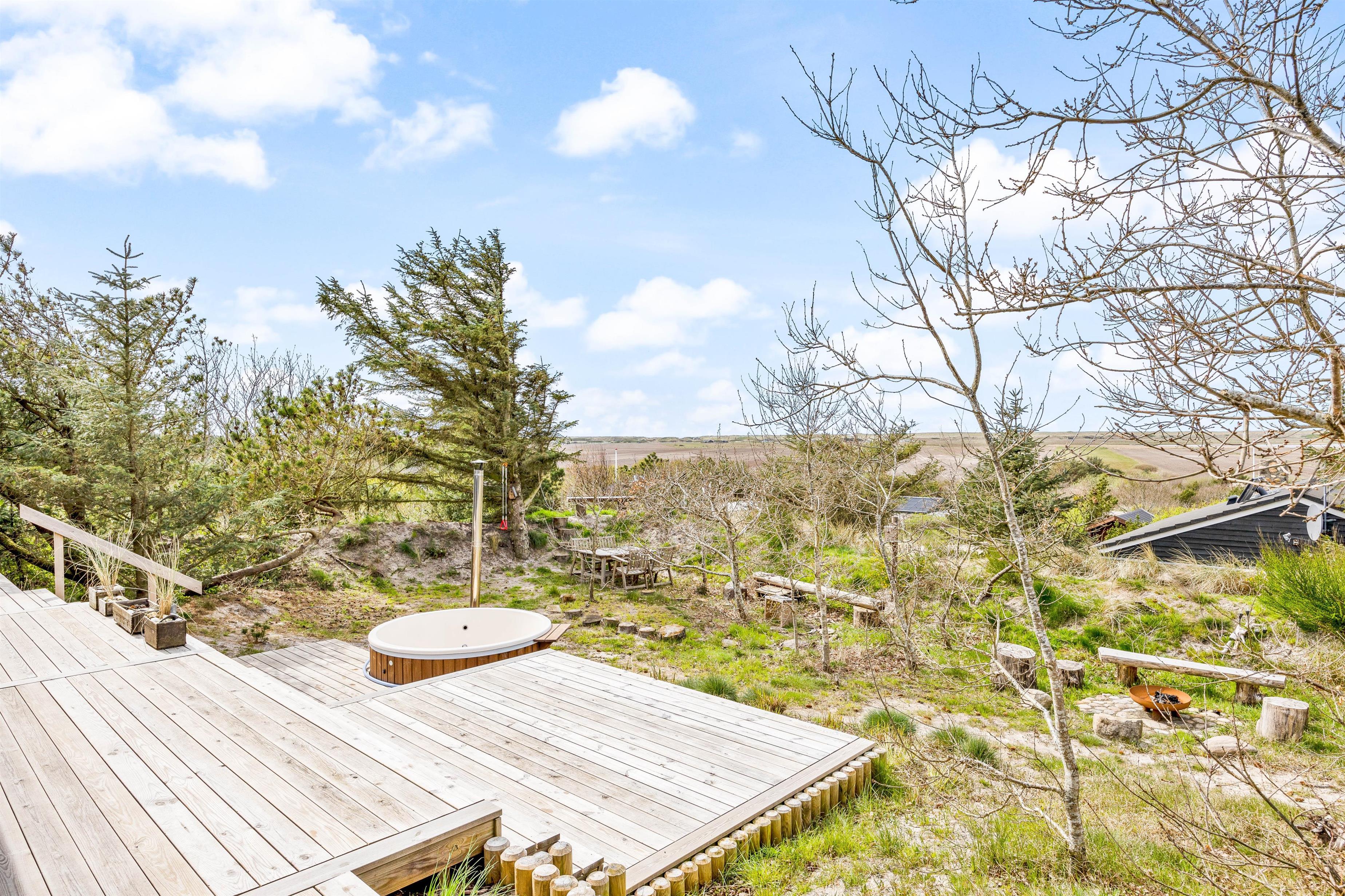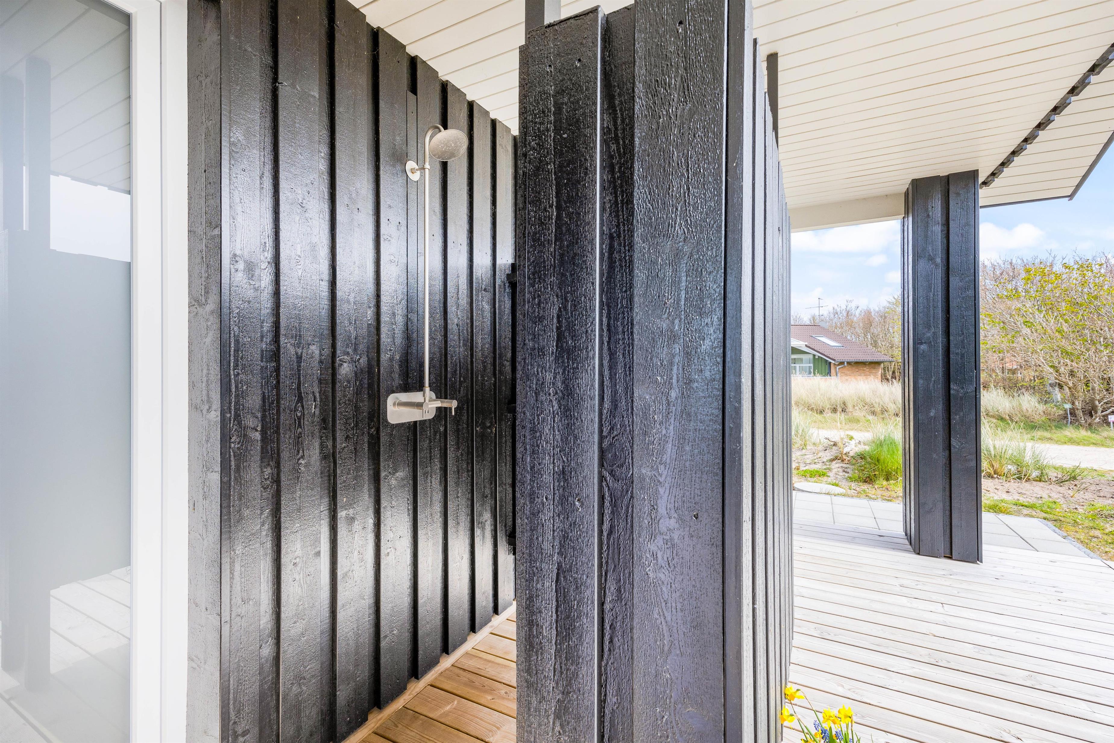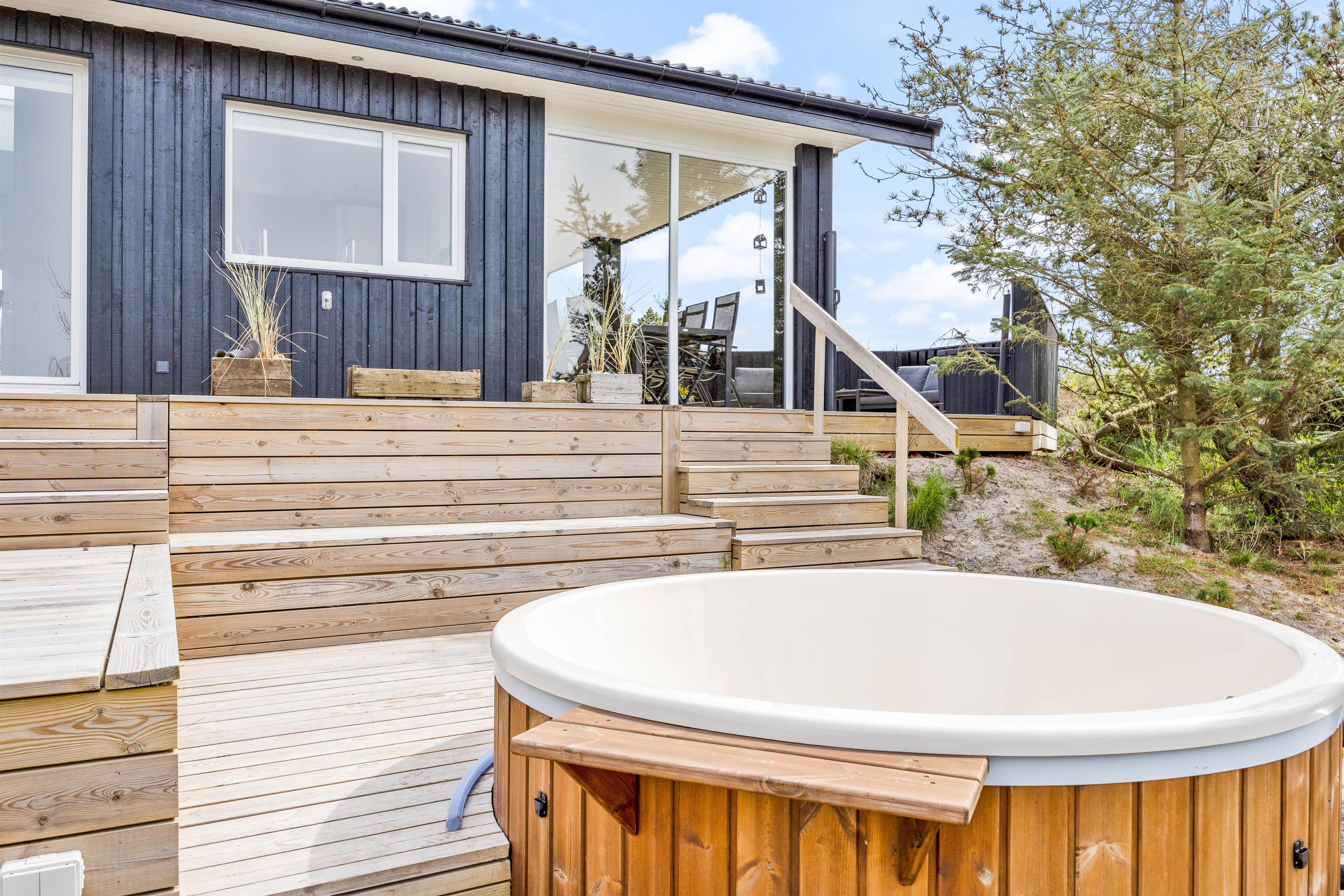 Den store træterrasse indbyder til udeliv med flere hyggekroge, spiseplads og grillområde. Den luksuriøse udendørs spa har plads til fem personer og giver mulighed for afslapning under åben himmel – perfekt efter en lang dag i naturen. En praktisk udendørs bruser (tilgængelig fra april til november) gør det nemt at skylle sand og salt af efter strandture.