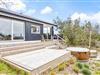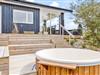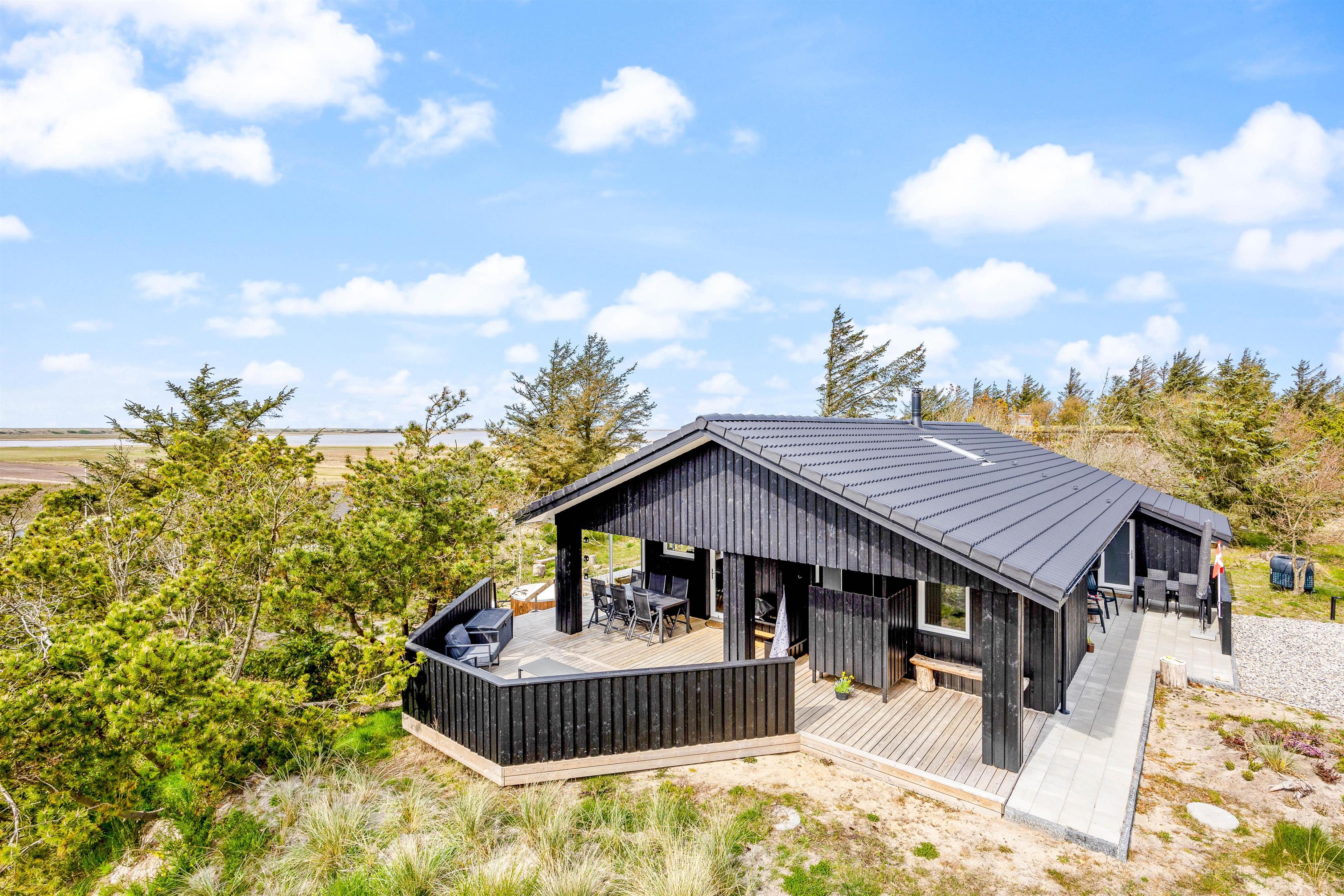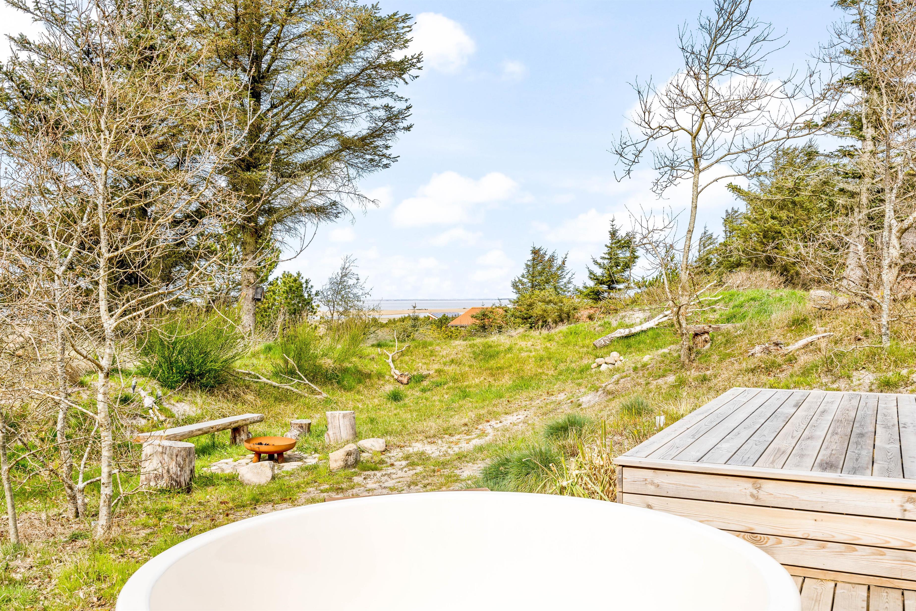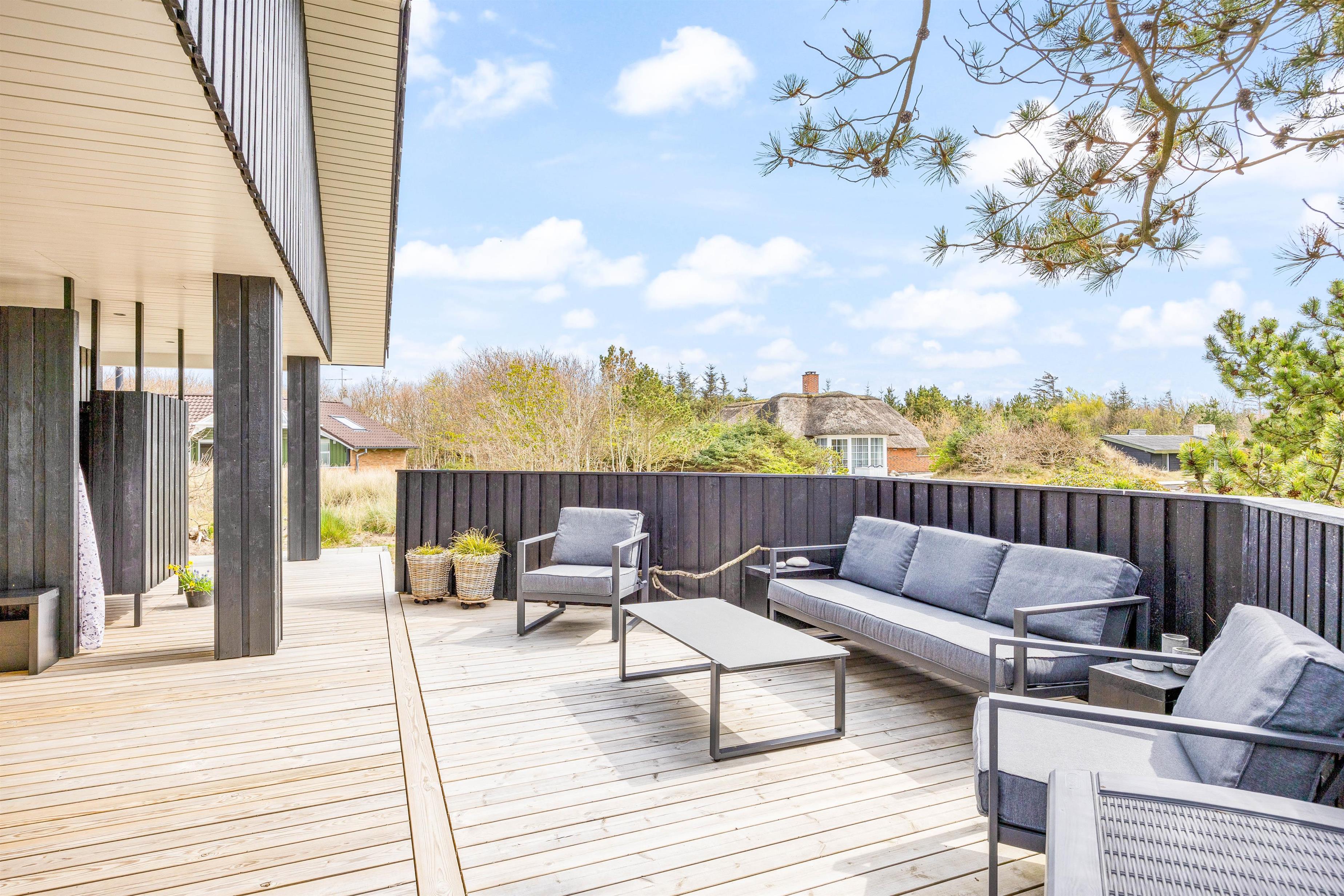 Den store træterrasse indbyder til udeliv med flere hyggekroge, spiseplads og grillområde. Den luksuriøse udendørs spa har plads til fem personer og giver mulighed for afslapning under åben himmel – perfekt efter en lang dag i naturen. En praktisk udendørs bruser (tilgængelig fra april til november) gør det nemt at skylle sand og salt af efter strandture.