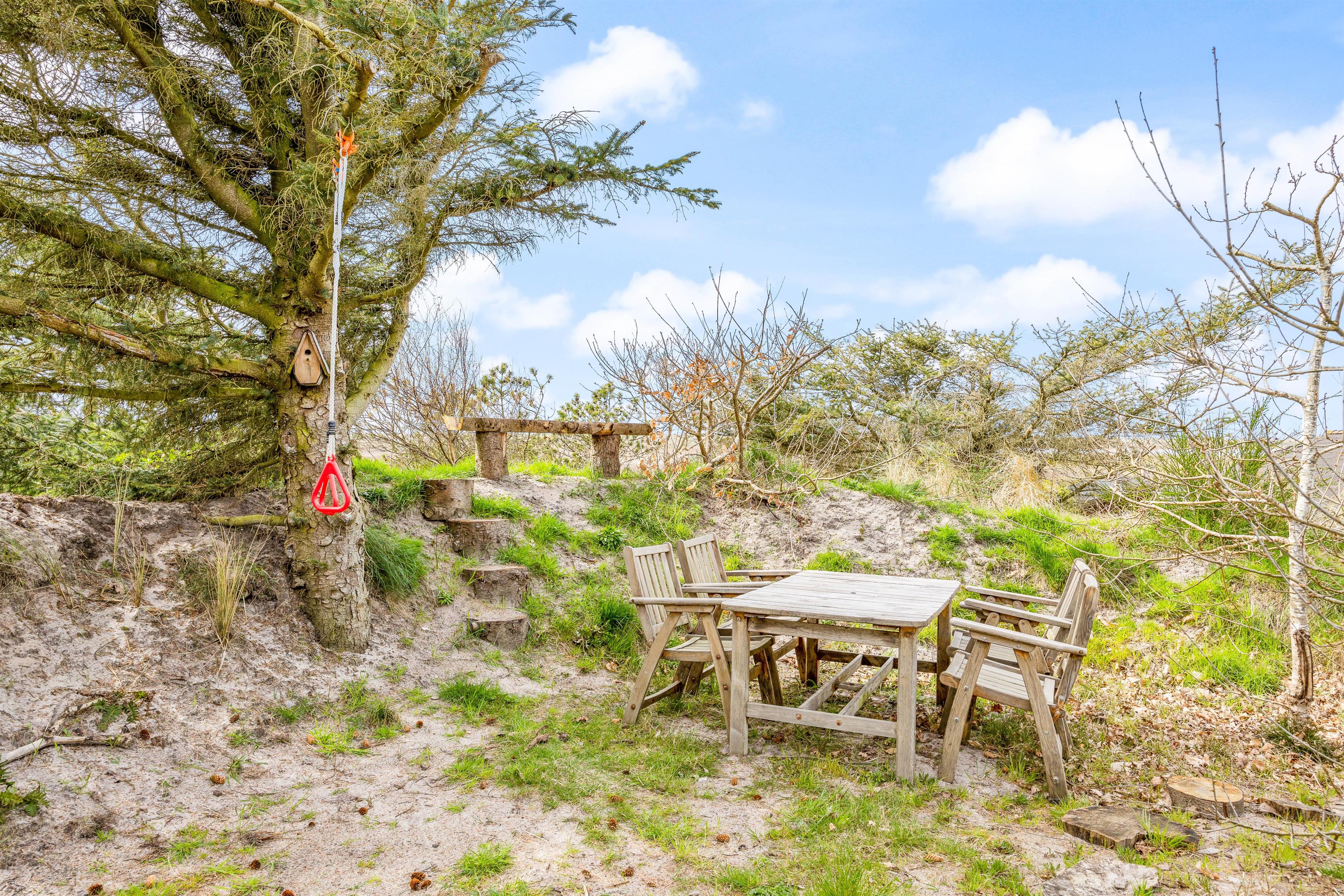 Haven er børnevenlig med en gynge og en kuperet grund, som opfordrer til leg og udforskning. Om aftenen er terrassen et oplagt sted at nyde solnedgangen med et glas vin og udsigt til det åbne landskab.