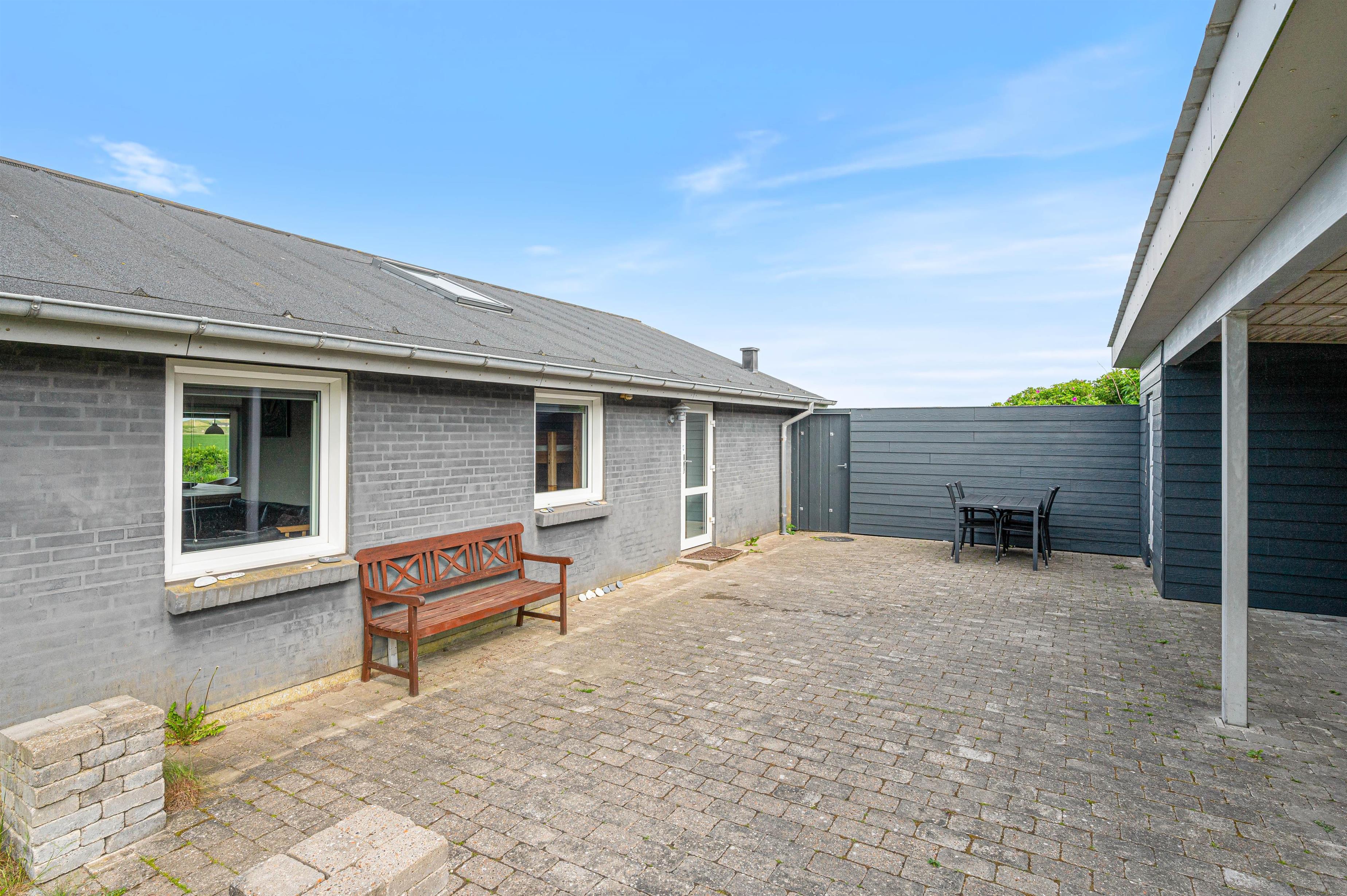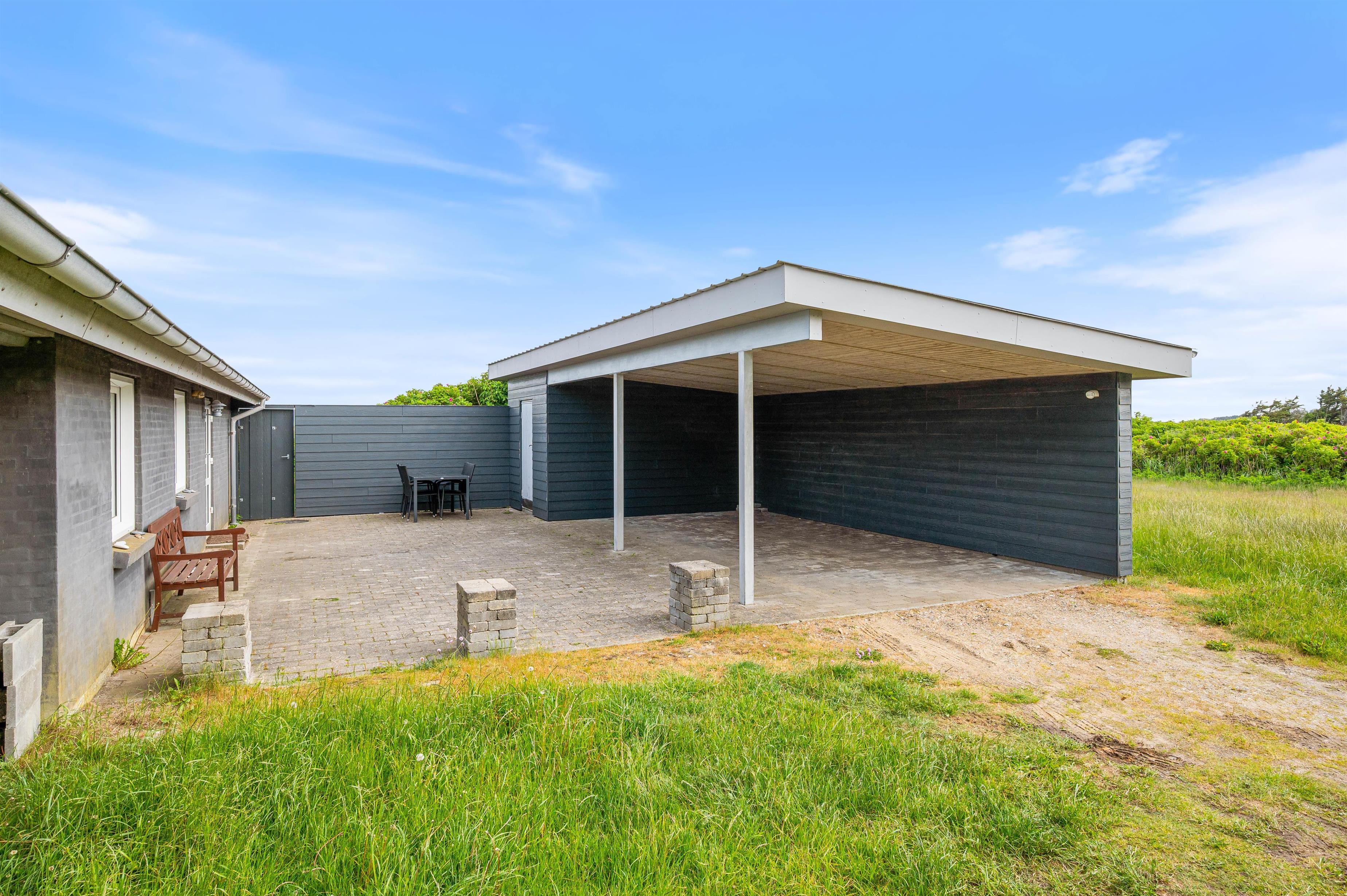 Rundt om sommerhuset finder I to dejlige terrasser – en sydvestvendt træterrasse med glasafskærmning og en fliseterrasse beliggende ved siden af carporten. Her er der altid mulighed for at finde en læfyldt plads i solen, uanset tidspunkt på dagen. Når aftenen falder på, kan I tænde op i grillen og nyde aftensmaden under åben himmel, mens I slapper af i husets hyggelige havemøbler og lader feriestemningen sænke sig.