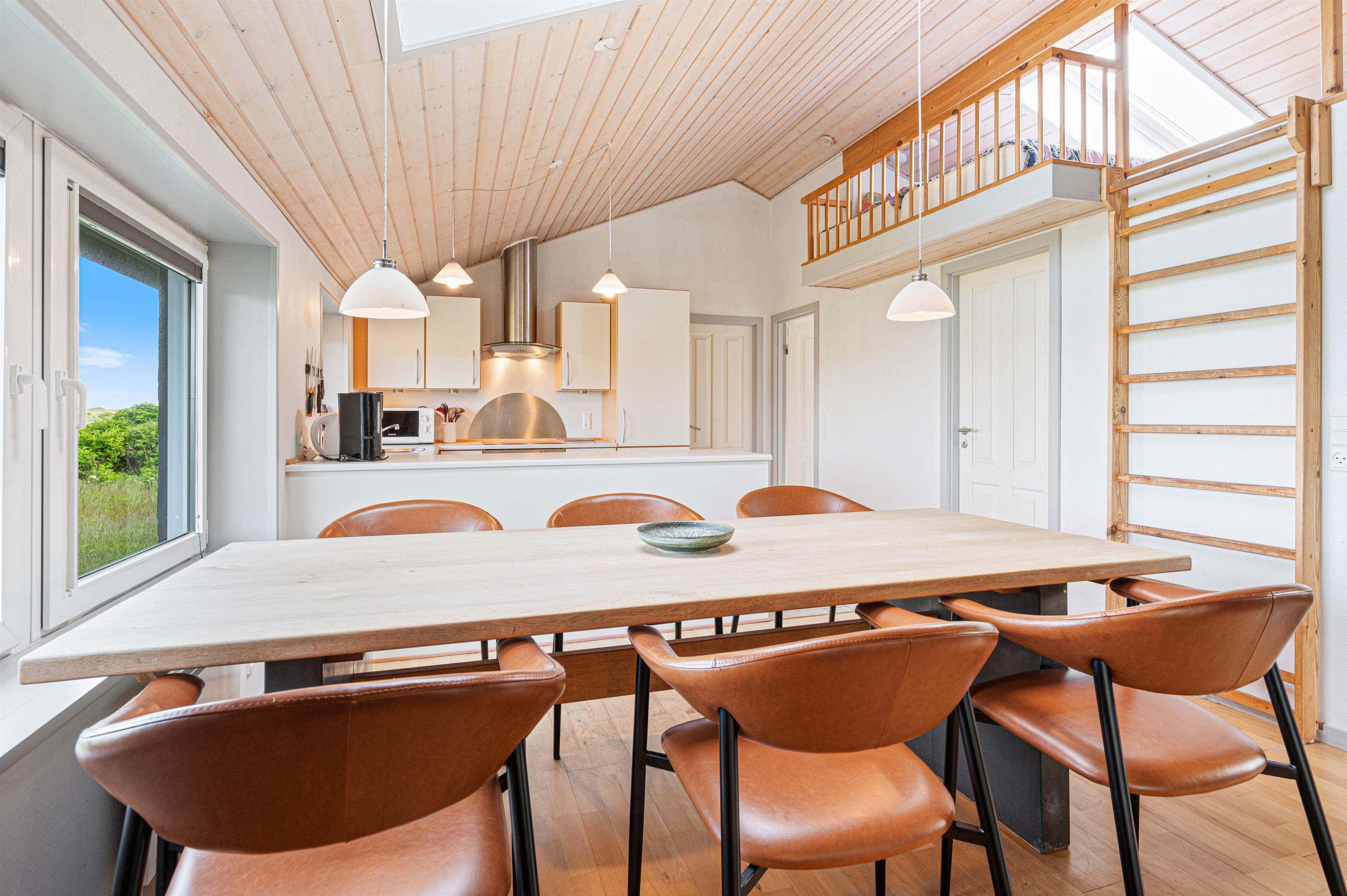 Det åbne køkken er veludstyret med opvaskemaskine, mikroovn og et kombineret køle-/fryseskab – alt, hvad I behøver for en komfortabel ferie i sommerhus. En energibesparende varmepumpe sikrer en behagelig temperatur i hele huset året rundt.
