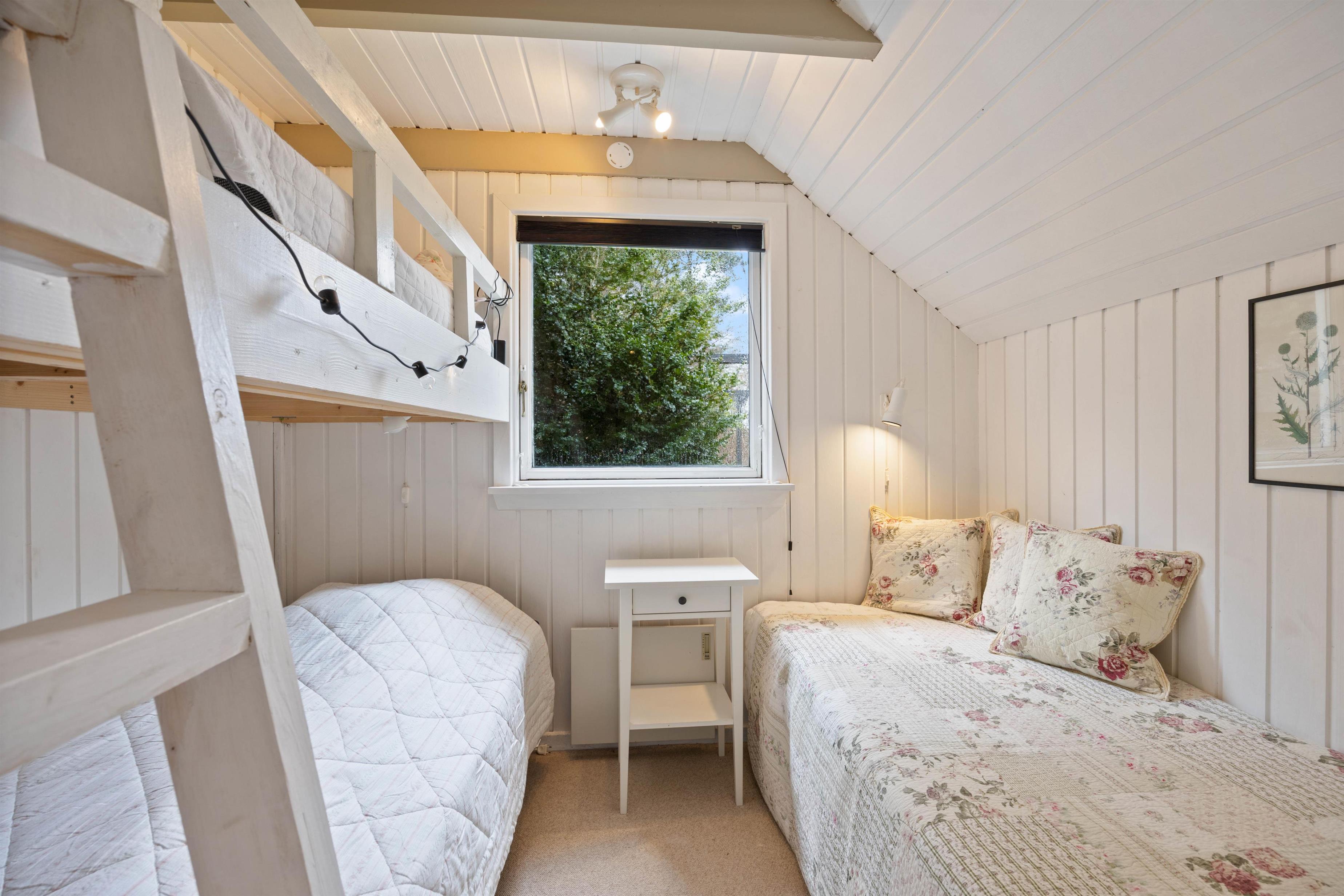 Sommerhusets 3 soveværelser går ud fra opholdsstuen og indgangspartiet. Det ene af de tre soveværelser er udstyret med en dobbeltseng, mens I finder 2 enkeltsenge i det 2. soveværelse. Det sidste soveværelse er udstyret med 1 køjeseng og1 ekstra enkeltseng, hvis nogen ikke ønsker at sove i køjesengen ovenpå.