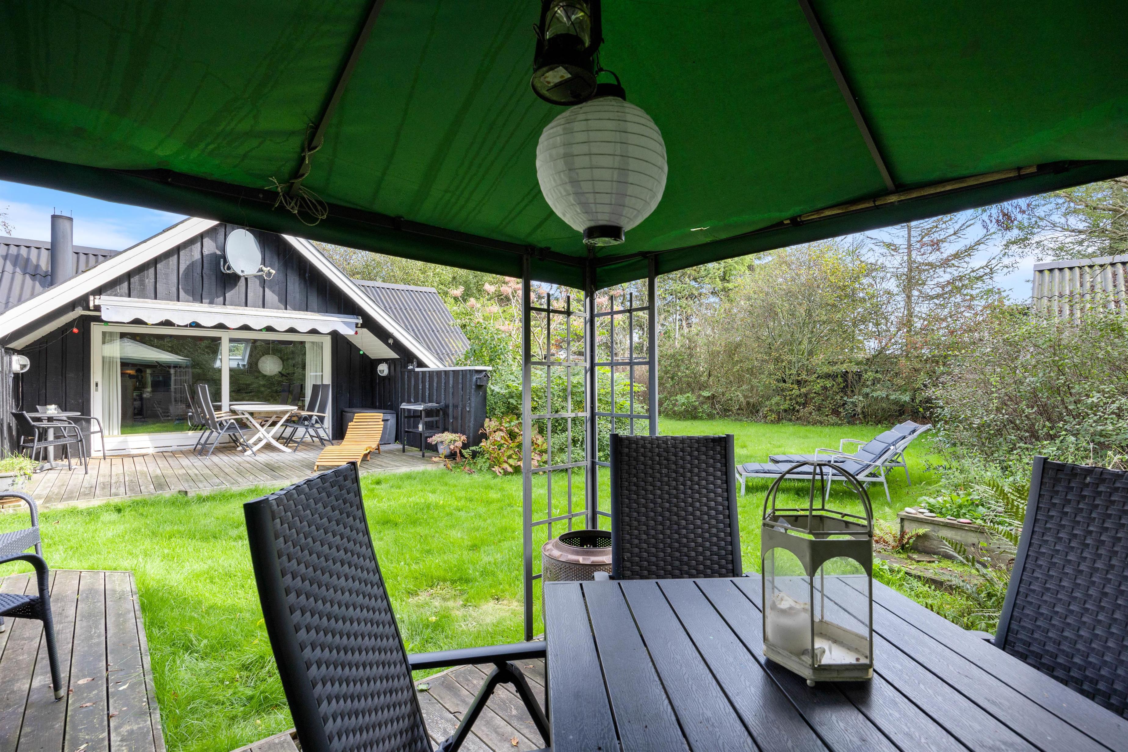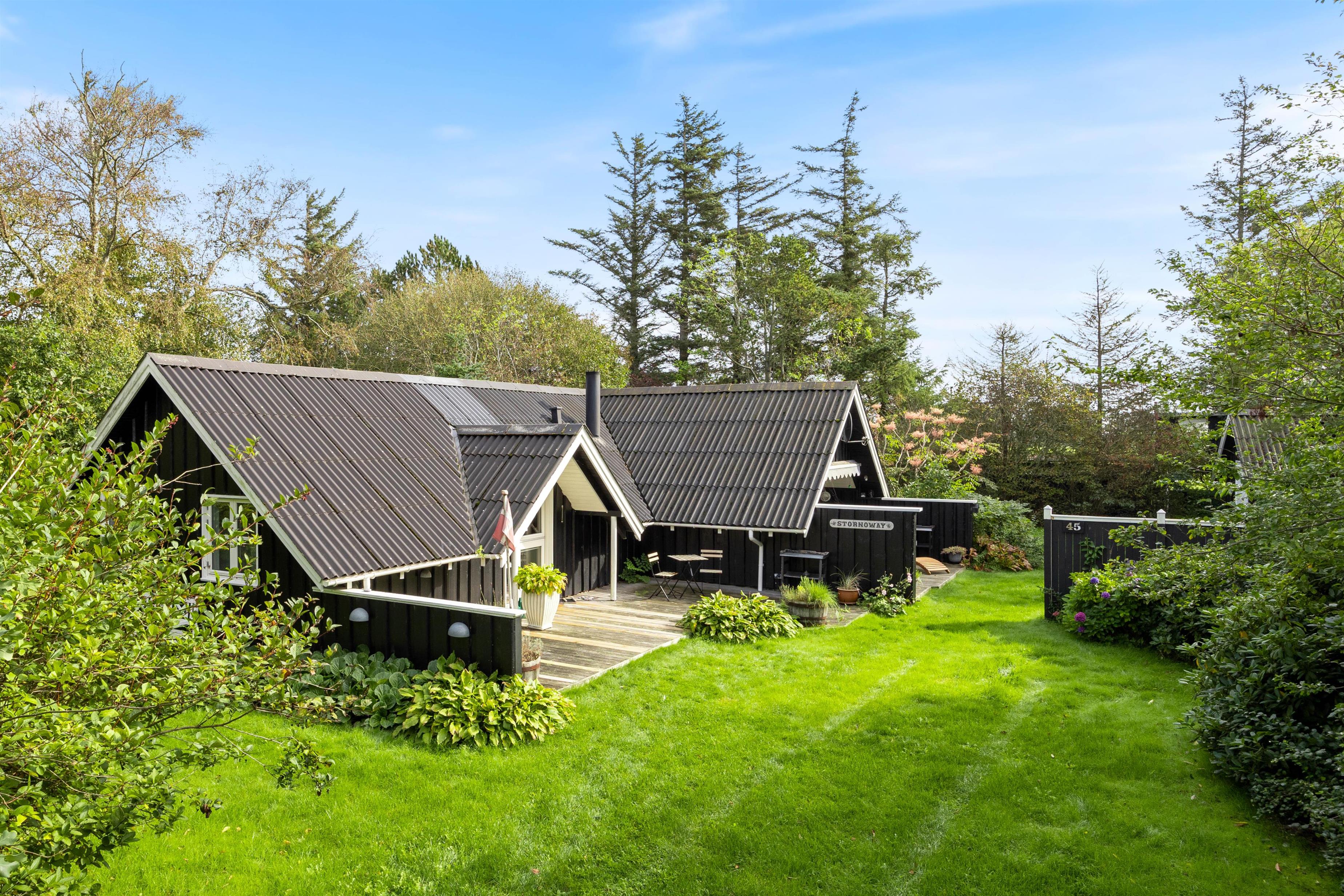 Sommerhuset på Hagevej 45 i Fjand står på en græsklædt plænegrund på ca. 1301 m2, som er omgivet af træer og buske. Her har jeres børn og hund masser af plads til at lege og boltre sig på. Mens jeres børn løber rundt og udforsker grunden, kan I gøre det behageligt på terrassen med en god bog, en kold drink og nyde vejret. Hvis vejret ikke er så godt, er en del af terrassen overdækket, så I stadig kan nyde den friske havluft.