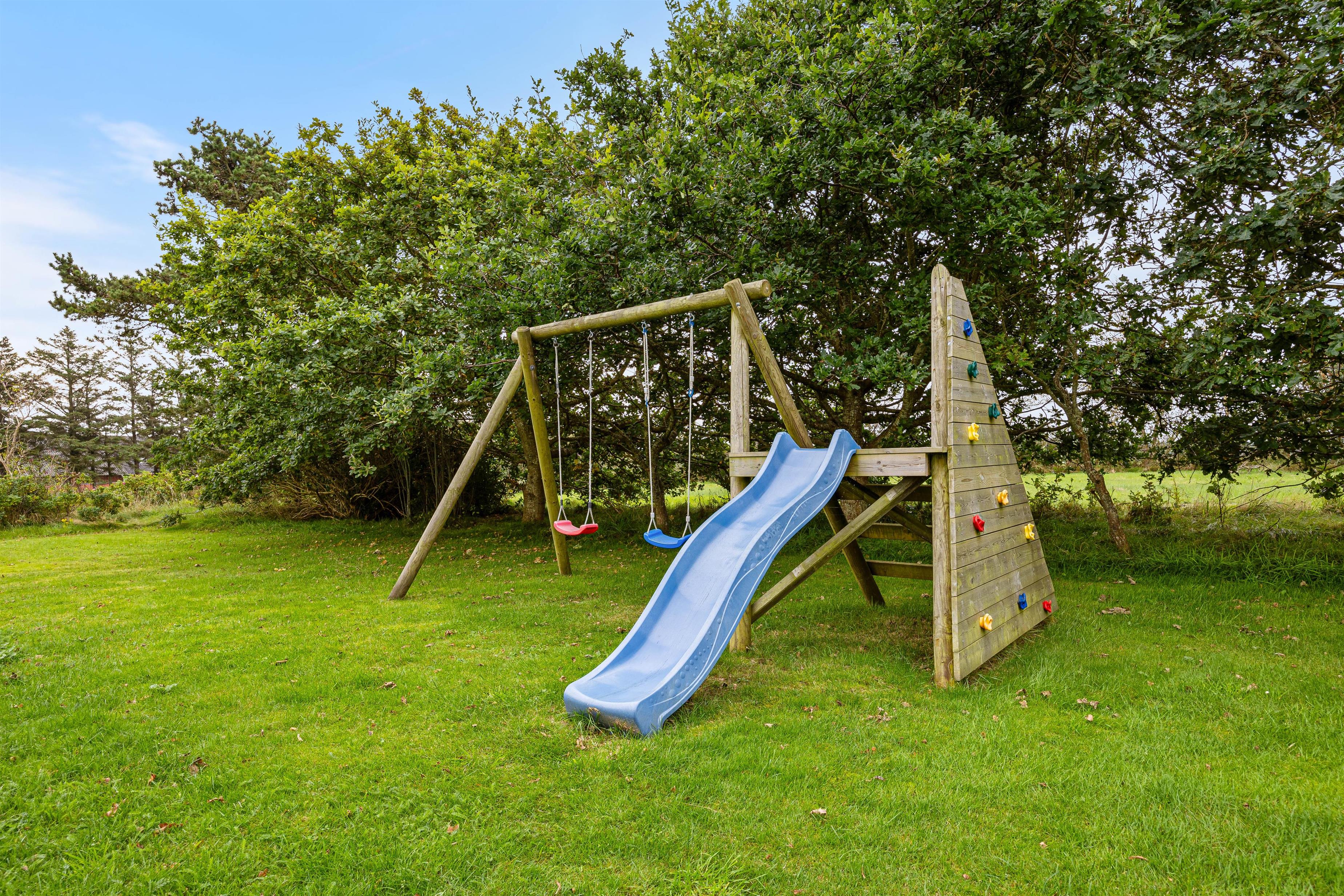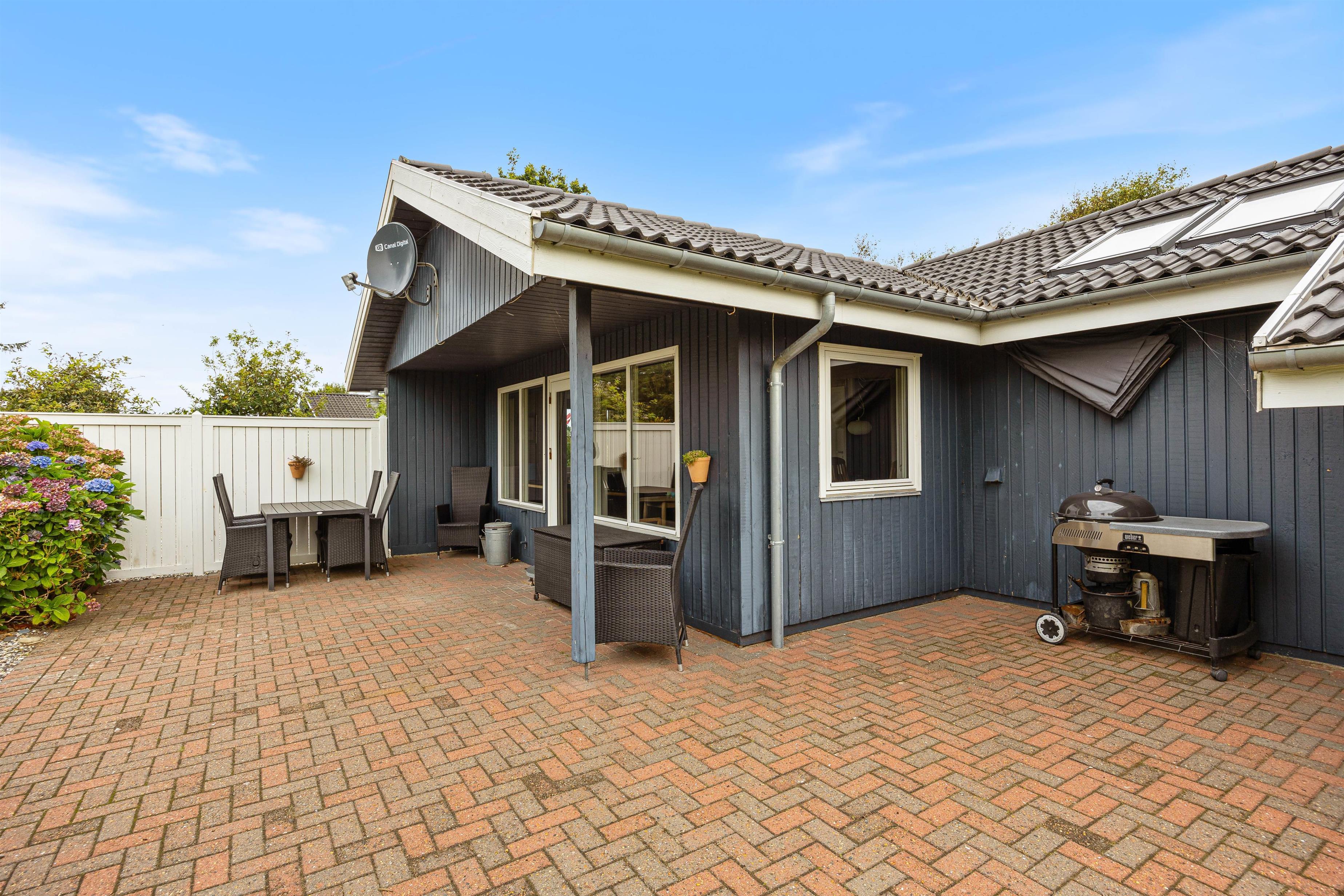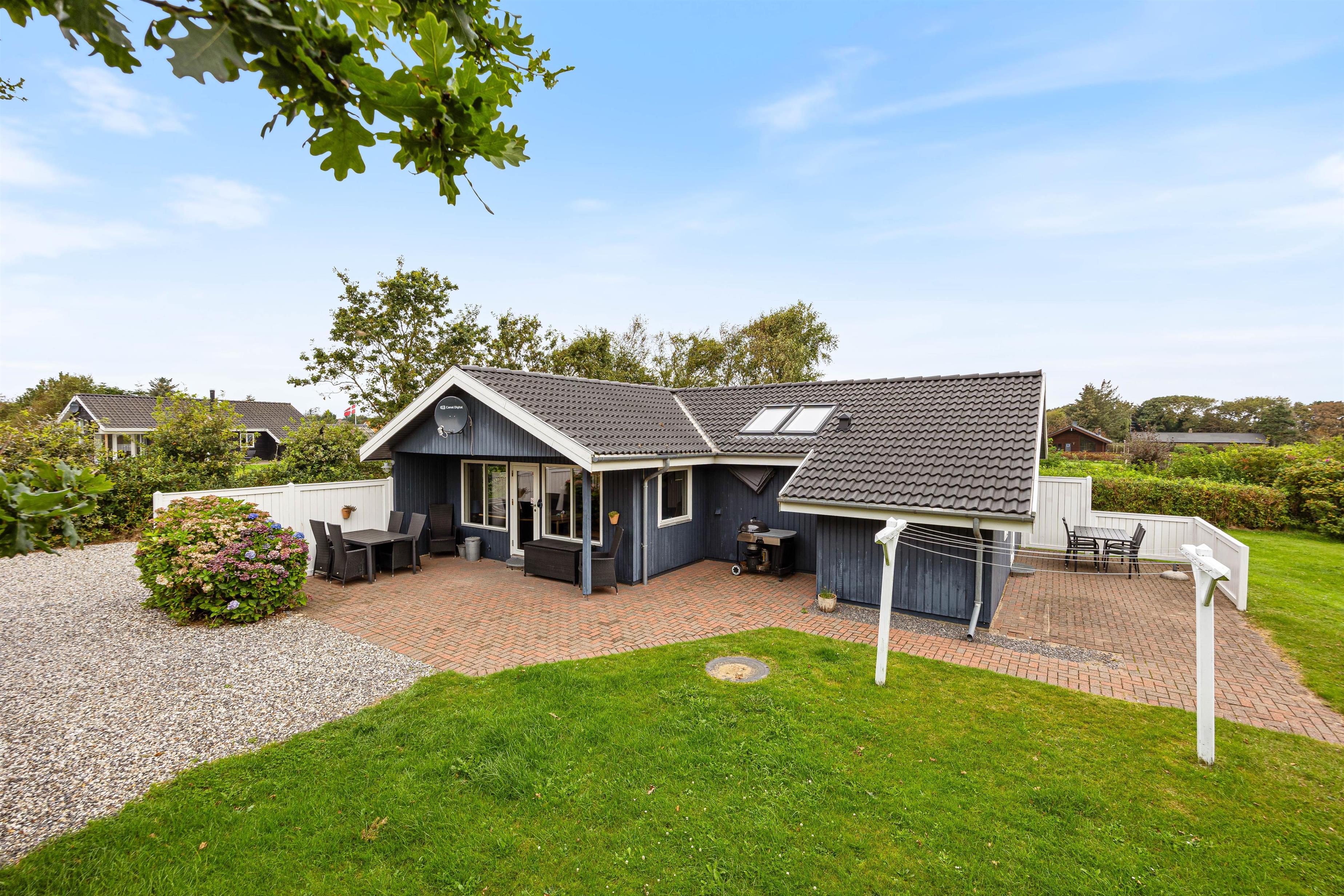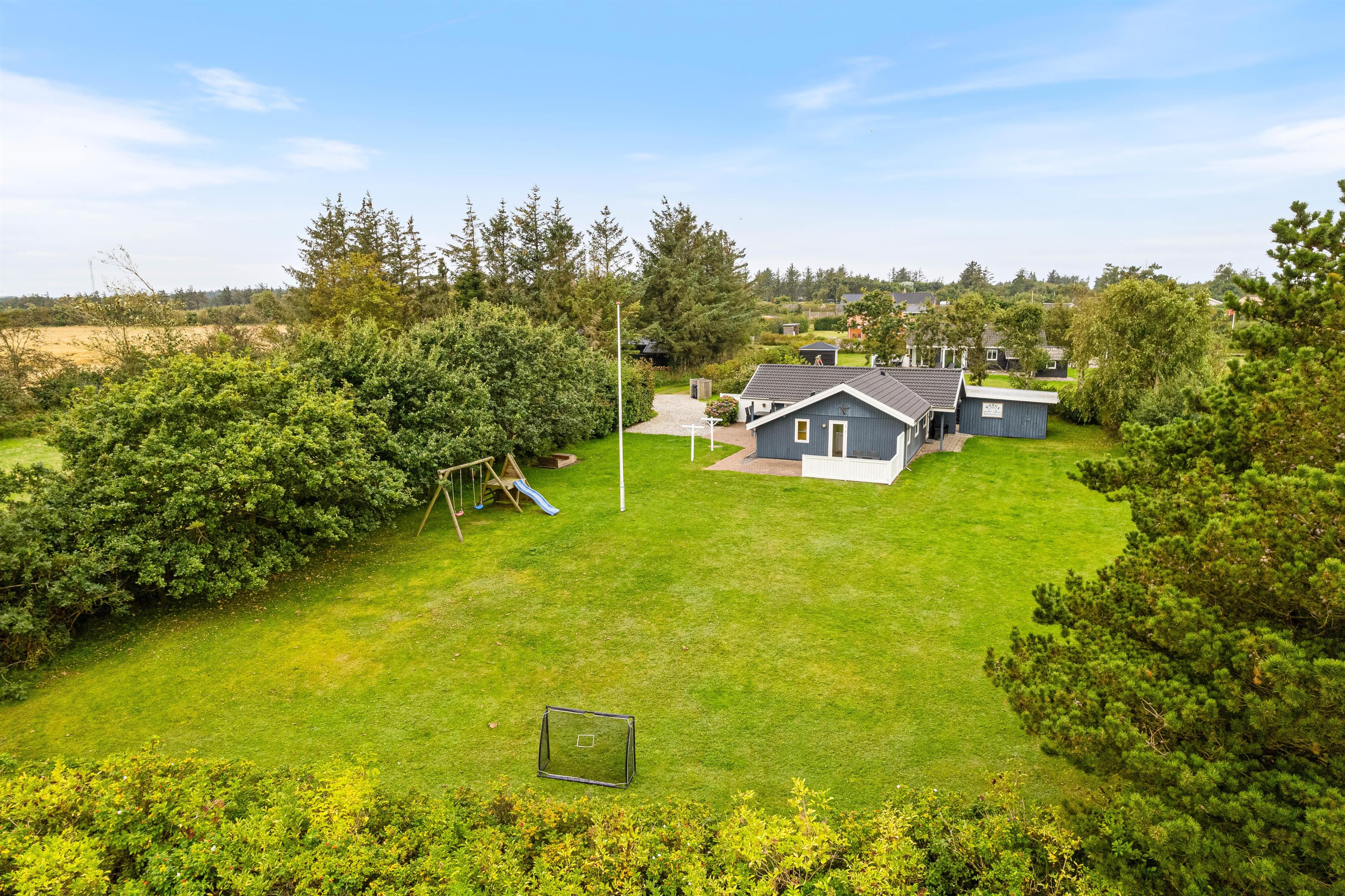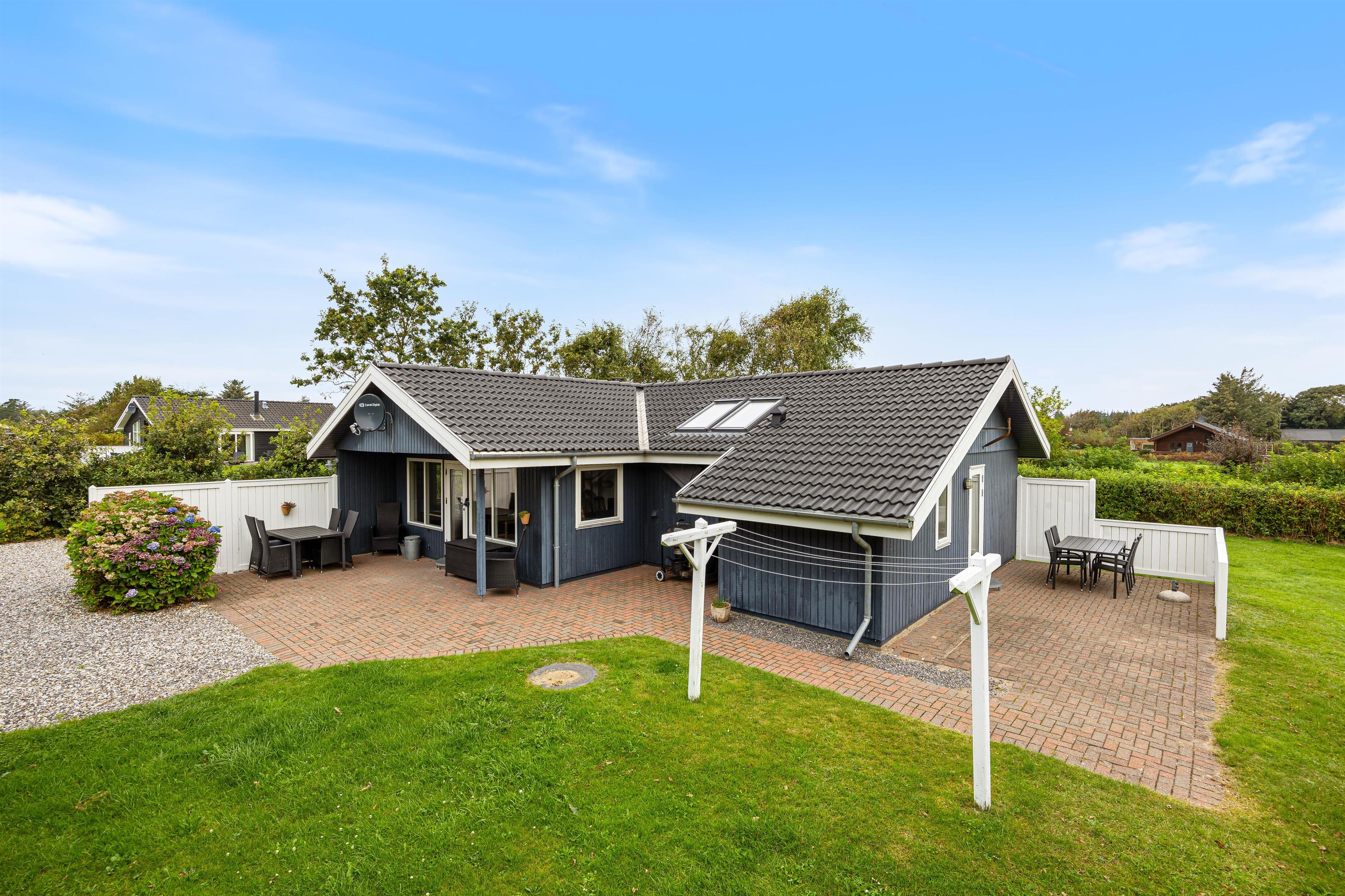 Feriehuset på Helmklitvej 210 i Fjand ligger på en 1.886 kvadratmeter stor græsplæne, som giver børn og hunde masser af plads til at lege og løbe rundt på, så der rigtig kan blive brændt krudt af. Især gyngen i haven vil helt sikkert være et hit hos de små. Mens børnene spiller bold, kan I hygge jer på den delvist afskærmede og overdækket terrasse eller gøre klar til en hyggelig grillaften.