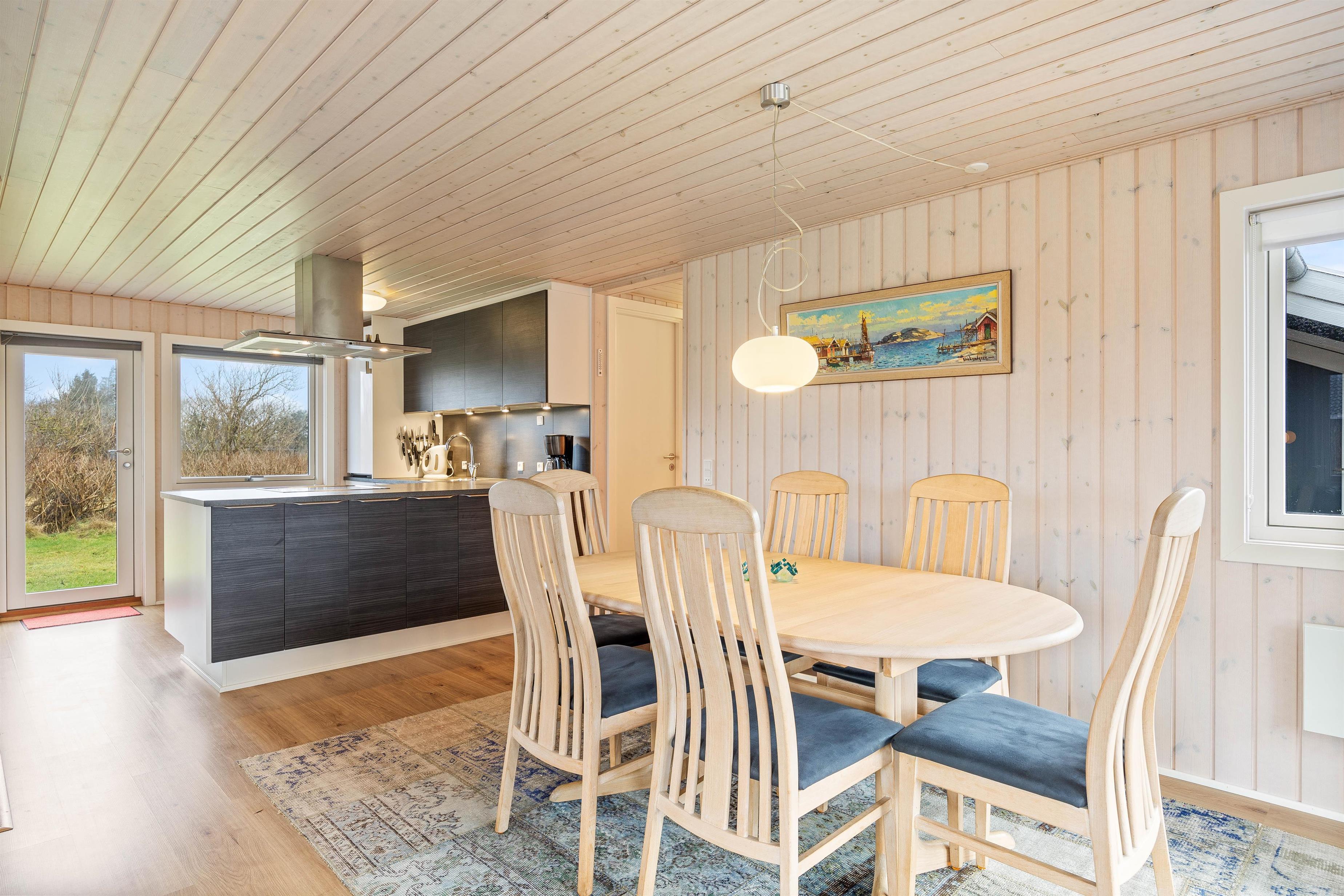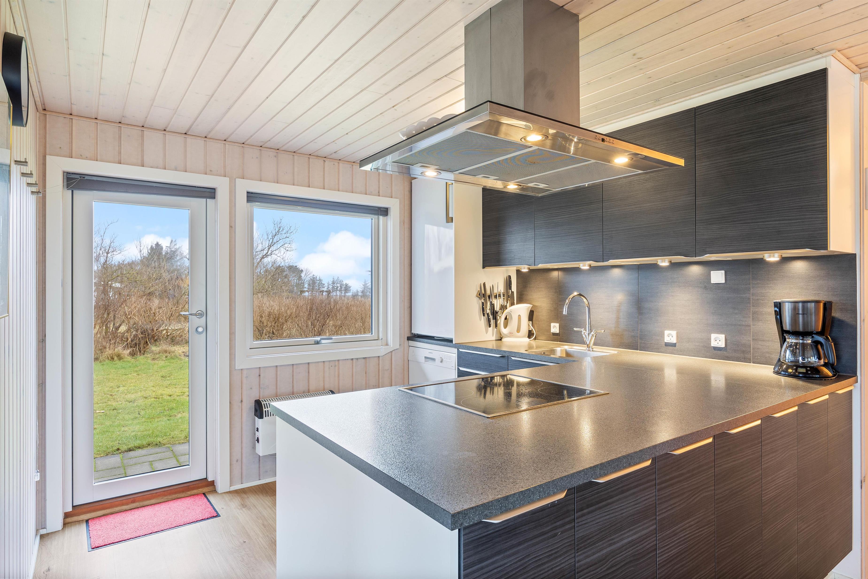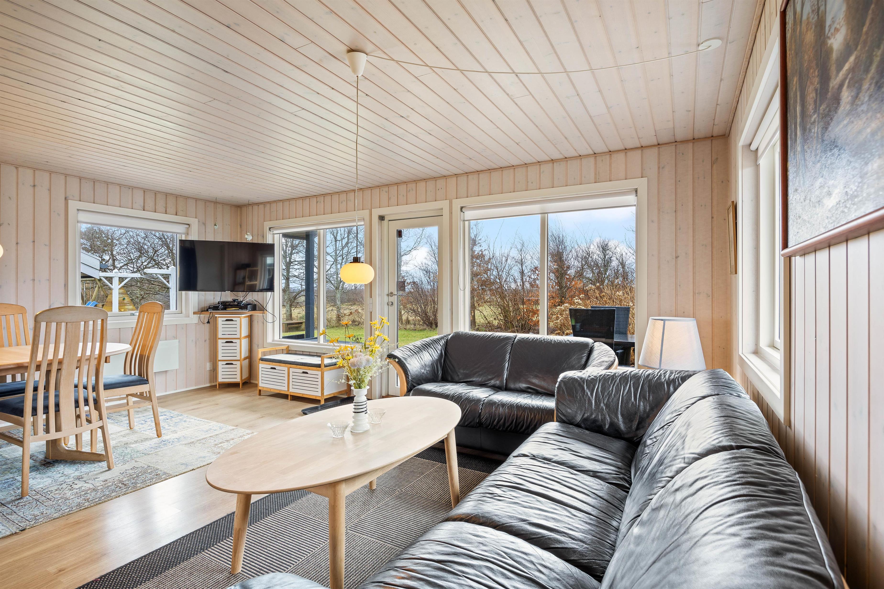 Når I træder ind i feriehuset, bliver I mødt af et hyggeligt interiør med træpaneler på vægge og lofter, som emmer af klassisk feriehusstemning. Feriehusstemningen forstærkes især, når man tænder op i brændeovnen i stuen og lytter til ildens knitren. Køkken, stue og spiseplads ligger i forlængelse af hinanden, så I kan tilbringe tid sammen, mens nogen står for madlavningen, og andre planlægger resten af ugens aktiviteter. I stuen finder I 1 smart-tv.