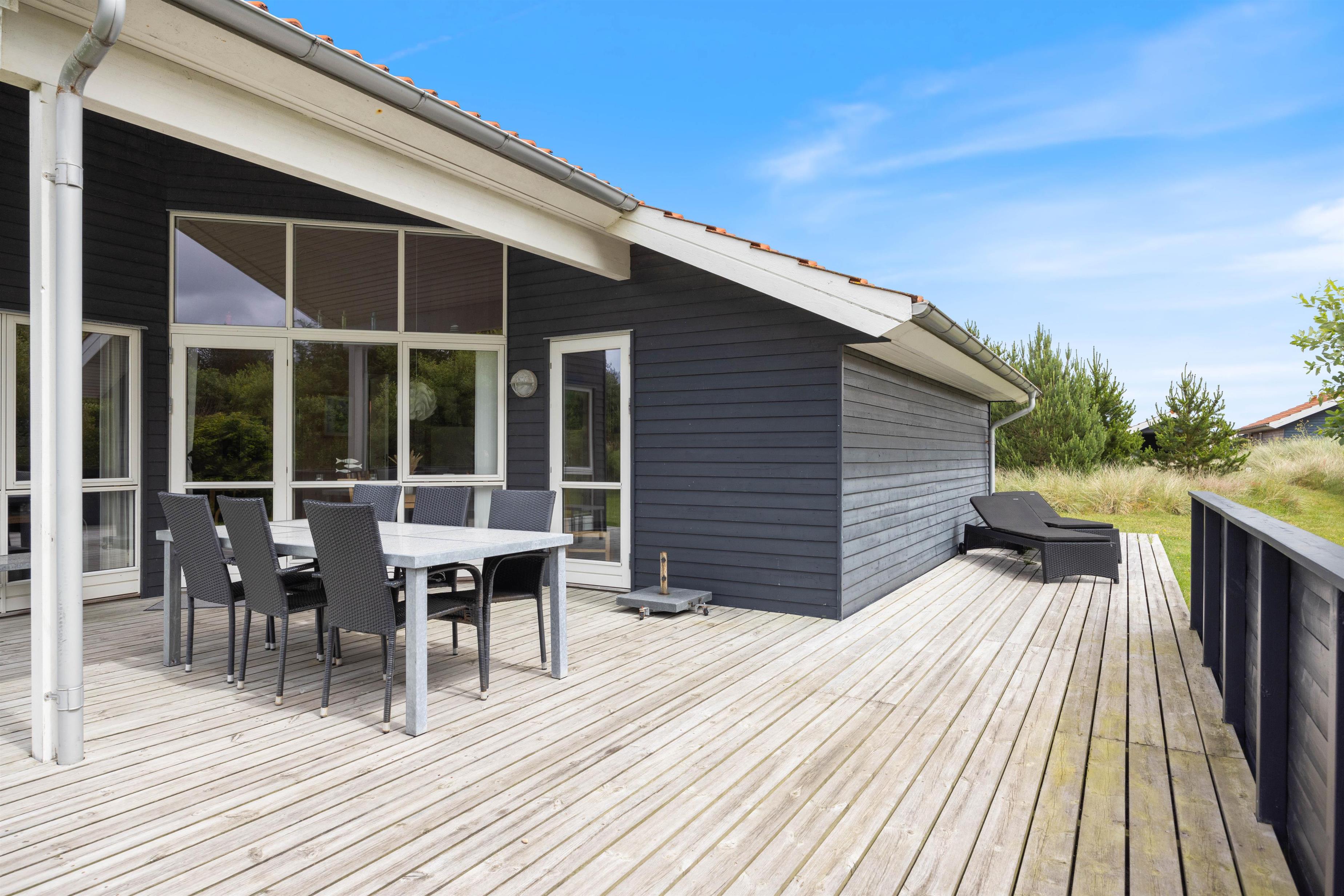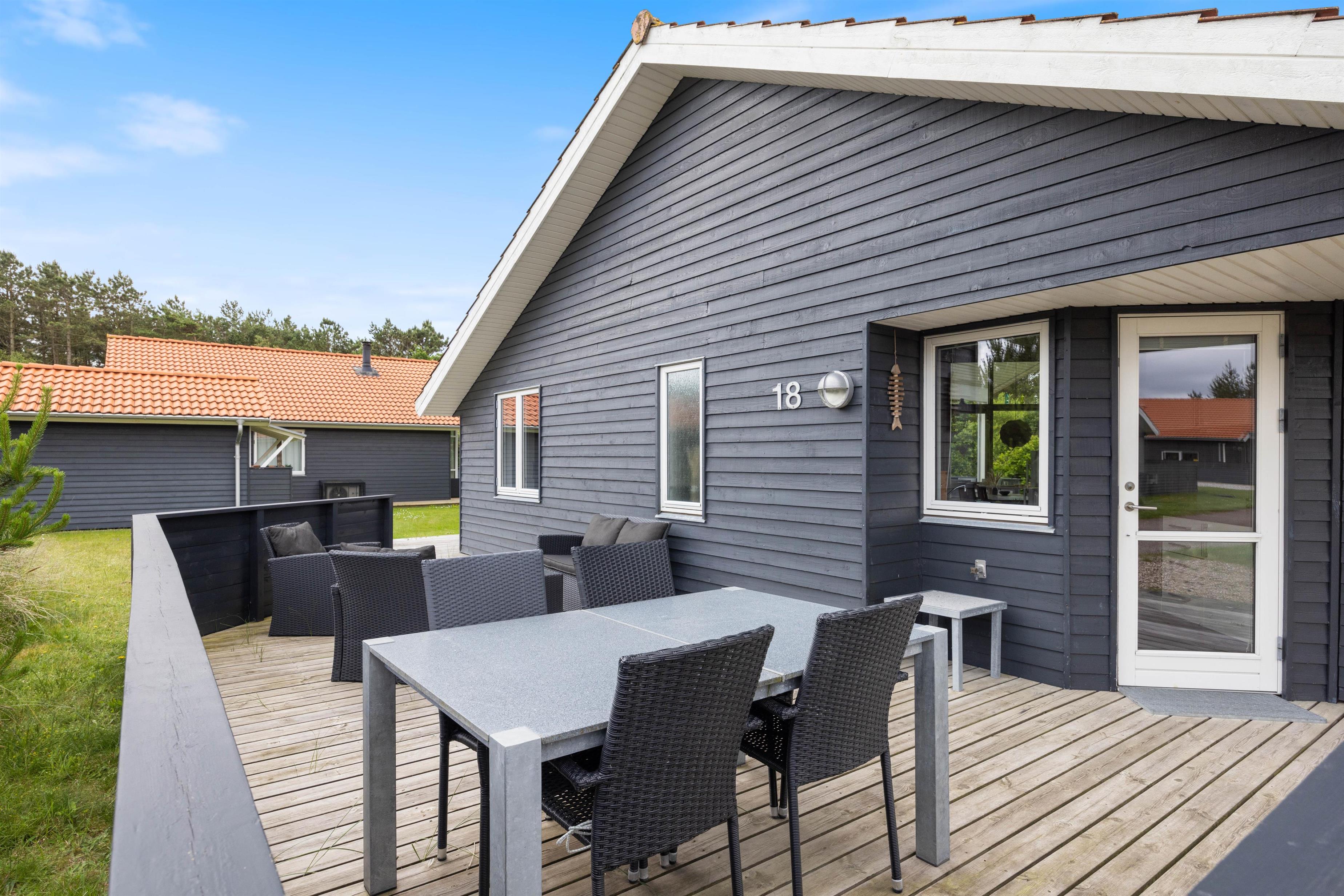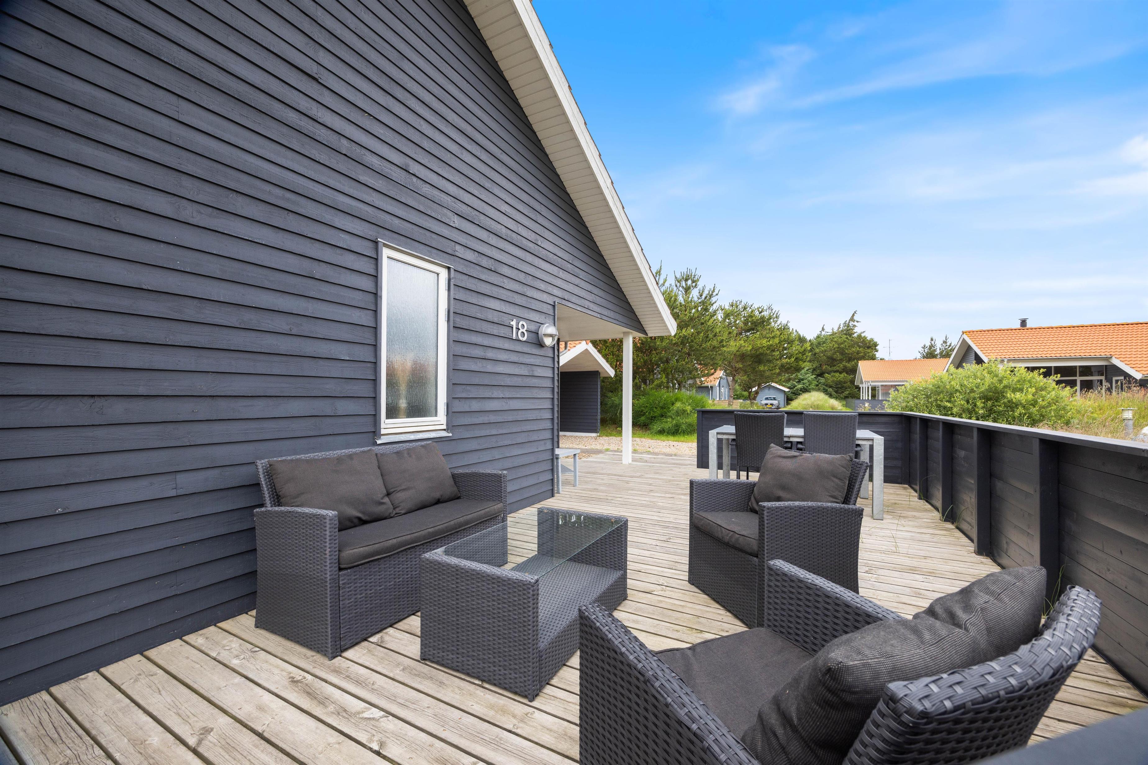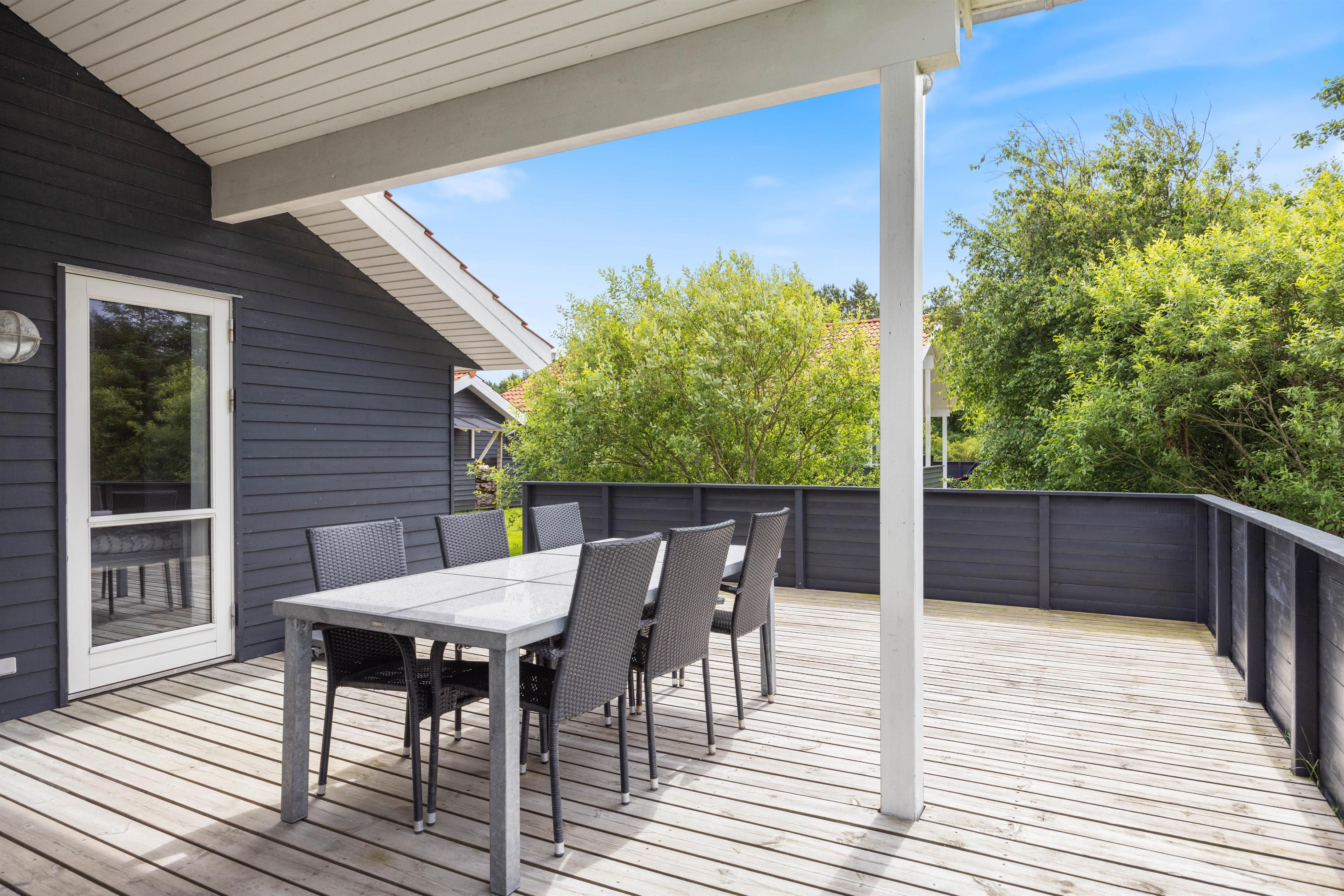 Sommerhuset på Fjand Strand 18 i Fjand, har en stor overdækket og afskærmet terrasse, hvor I har rig mulighed for at tilbringe en masse timer, hvis det danske sommervejr indbyder til det. På sommerhusets terrasse finder I havemøbler, liggestole og en grill, så her har I rig mulighed for bare at nyde, at I har ferie sammen.