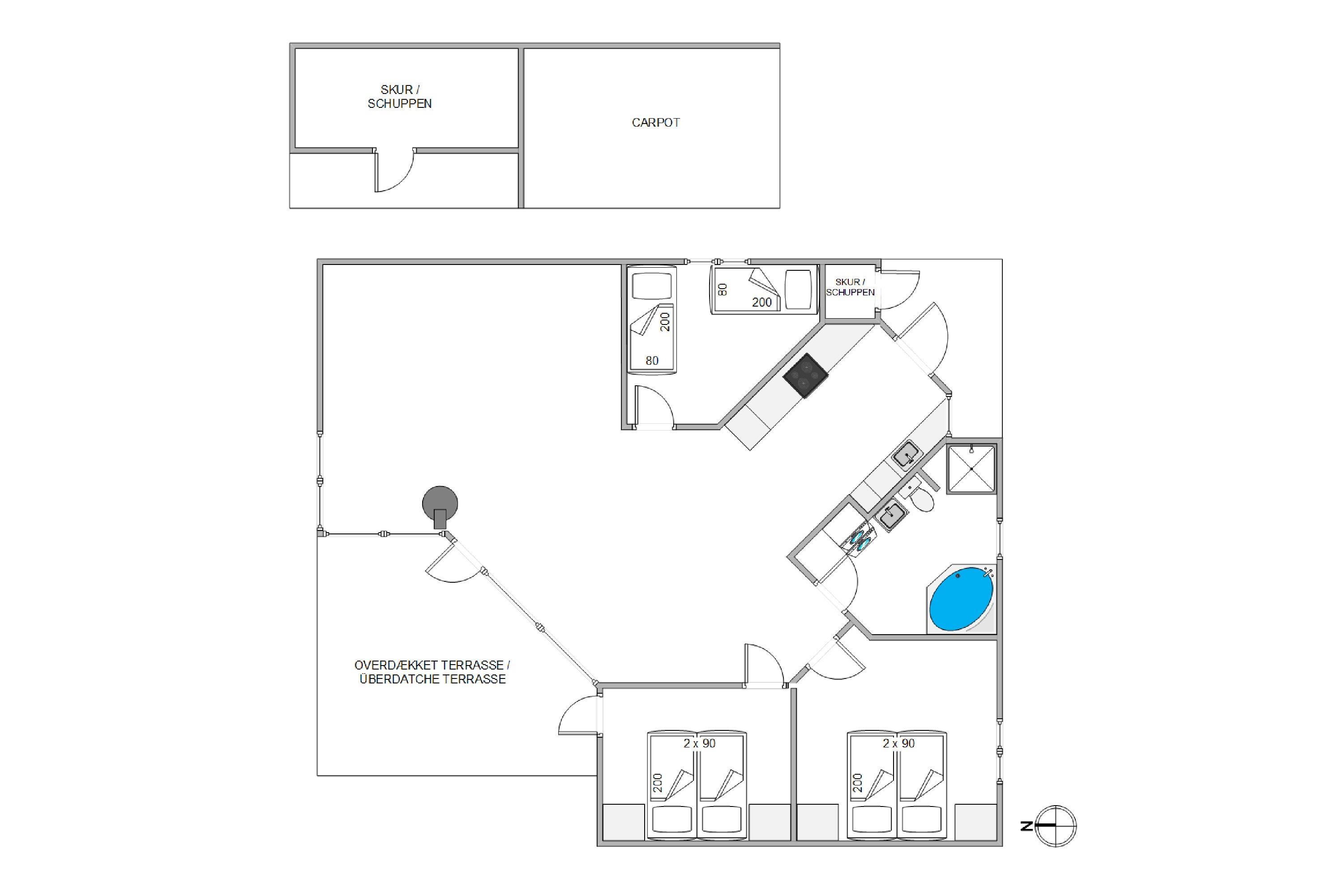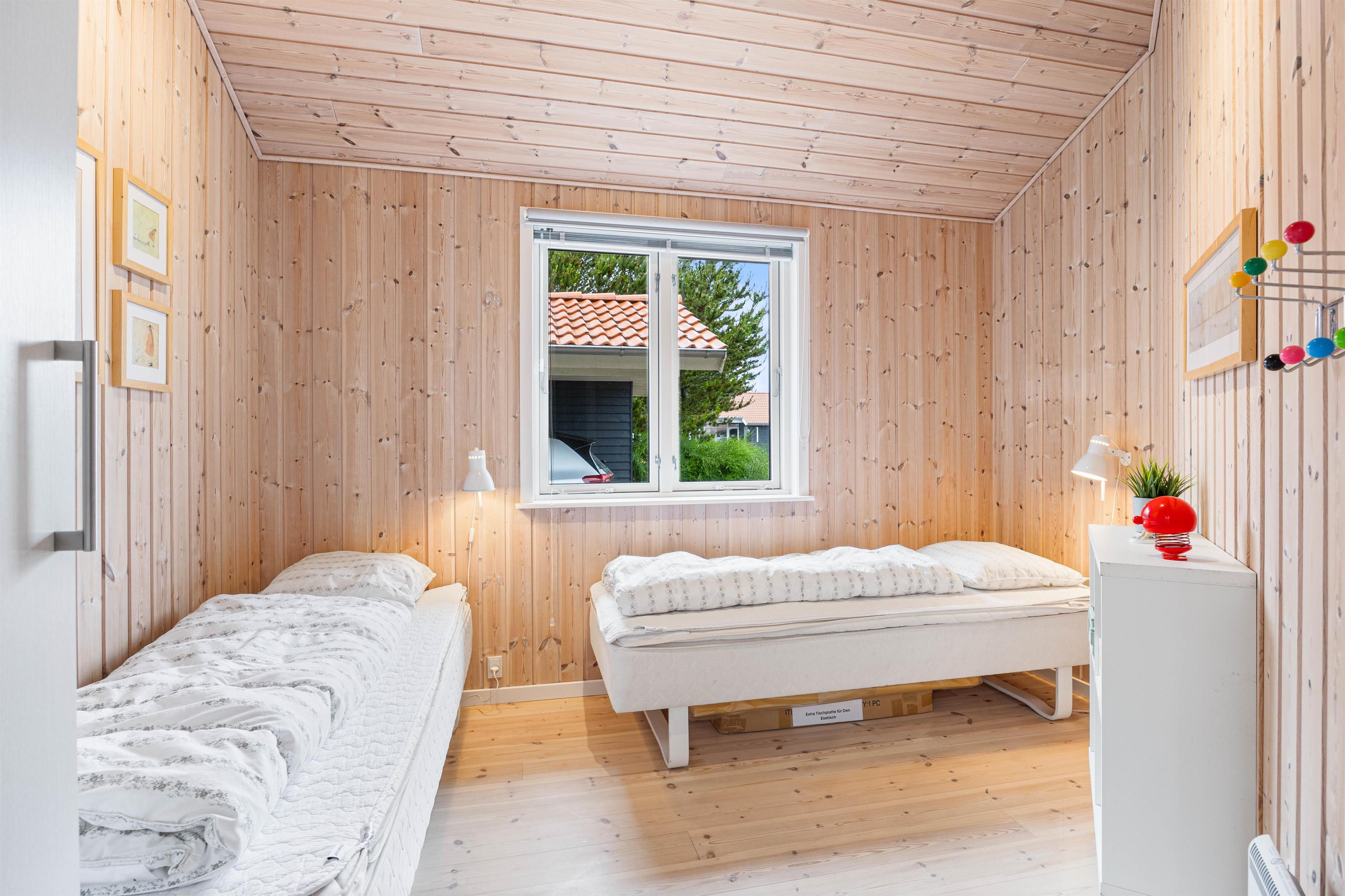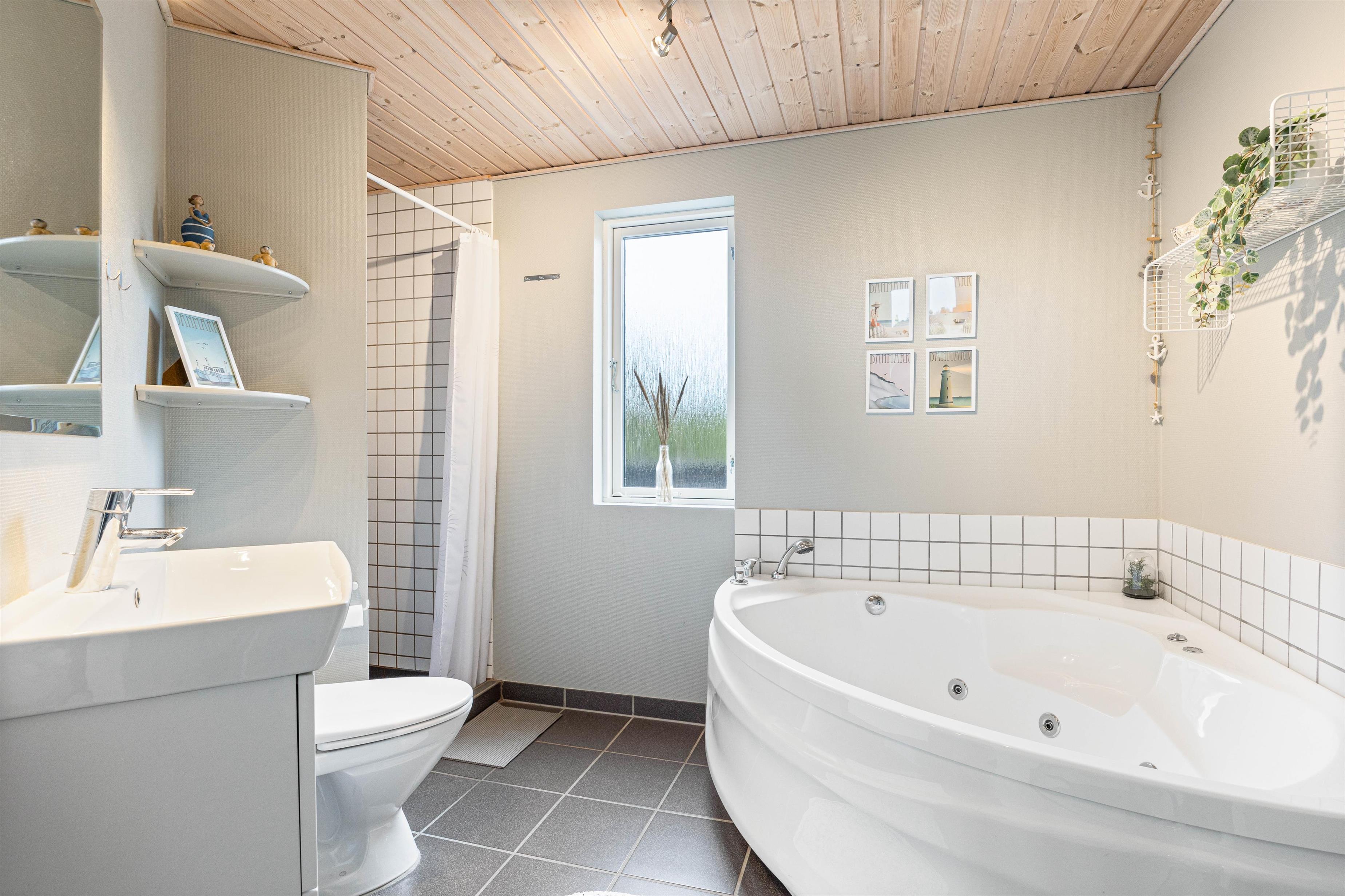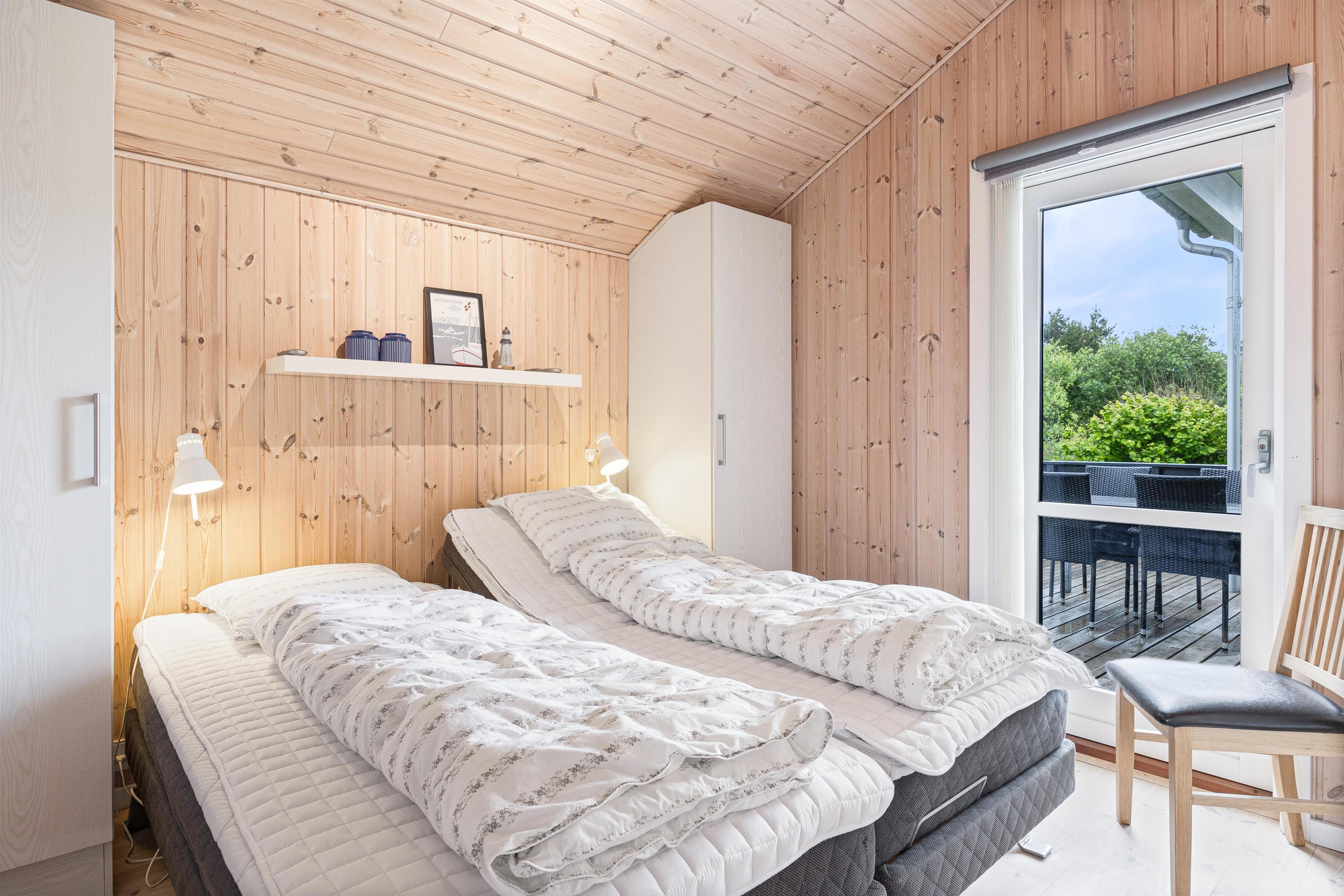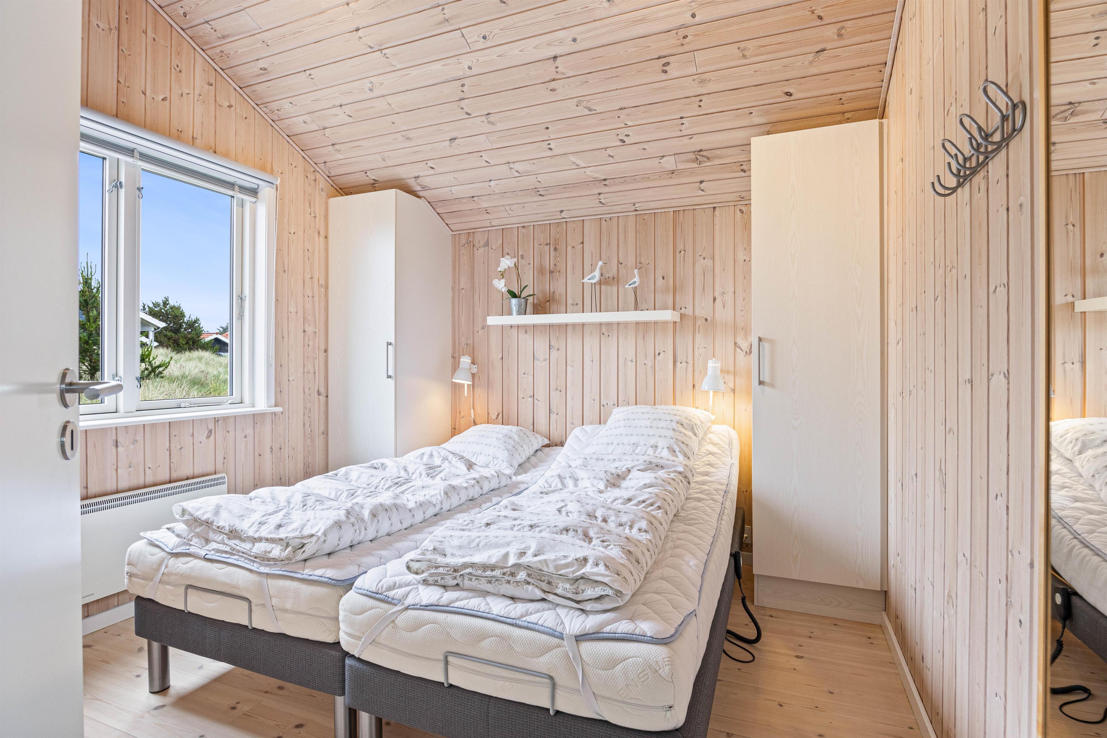 I sommerhuset finder I 3 rigtig gode soveværelser, hvoraf 2 af soveværelserne hver er indrettet med 2 enkelte elevationssenge, og det sidste værelse er indrettet med 2 almindelige enkeltsenge. På sommerhusets badeværelse, finder I et spabad, som I kan blive varmet rigtig godt igennem i.