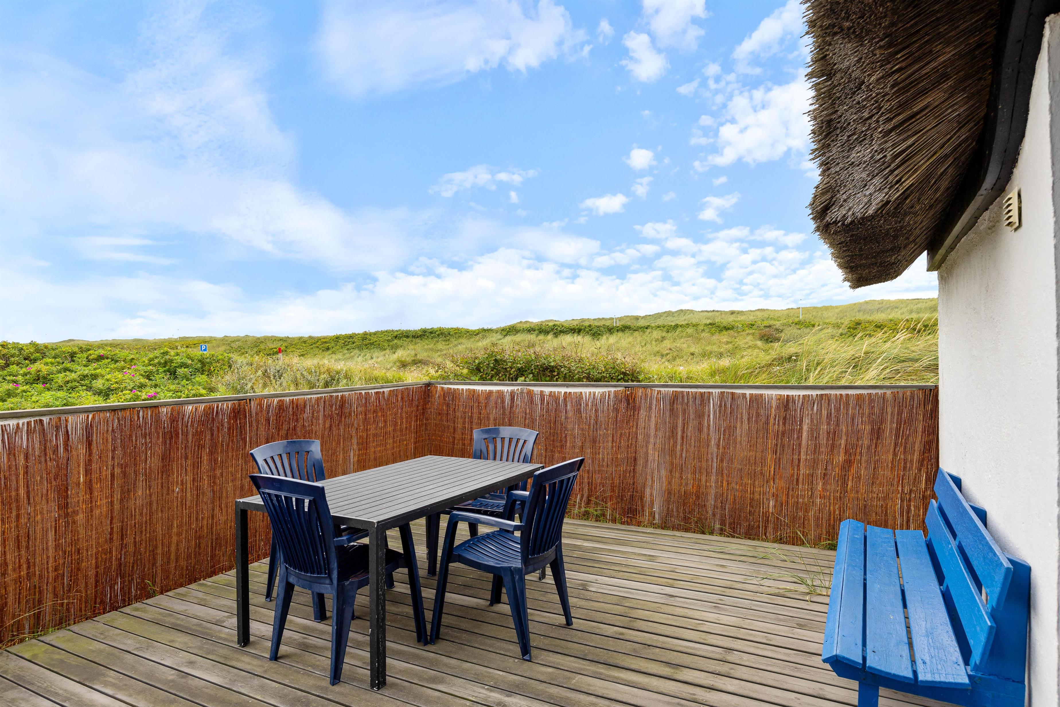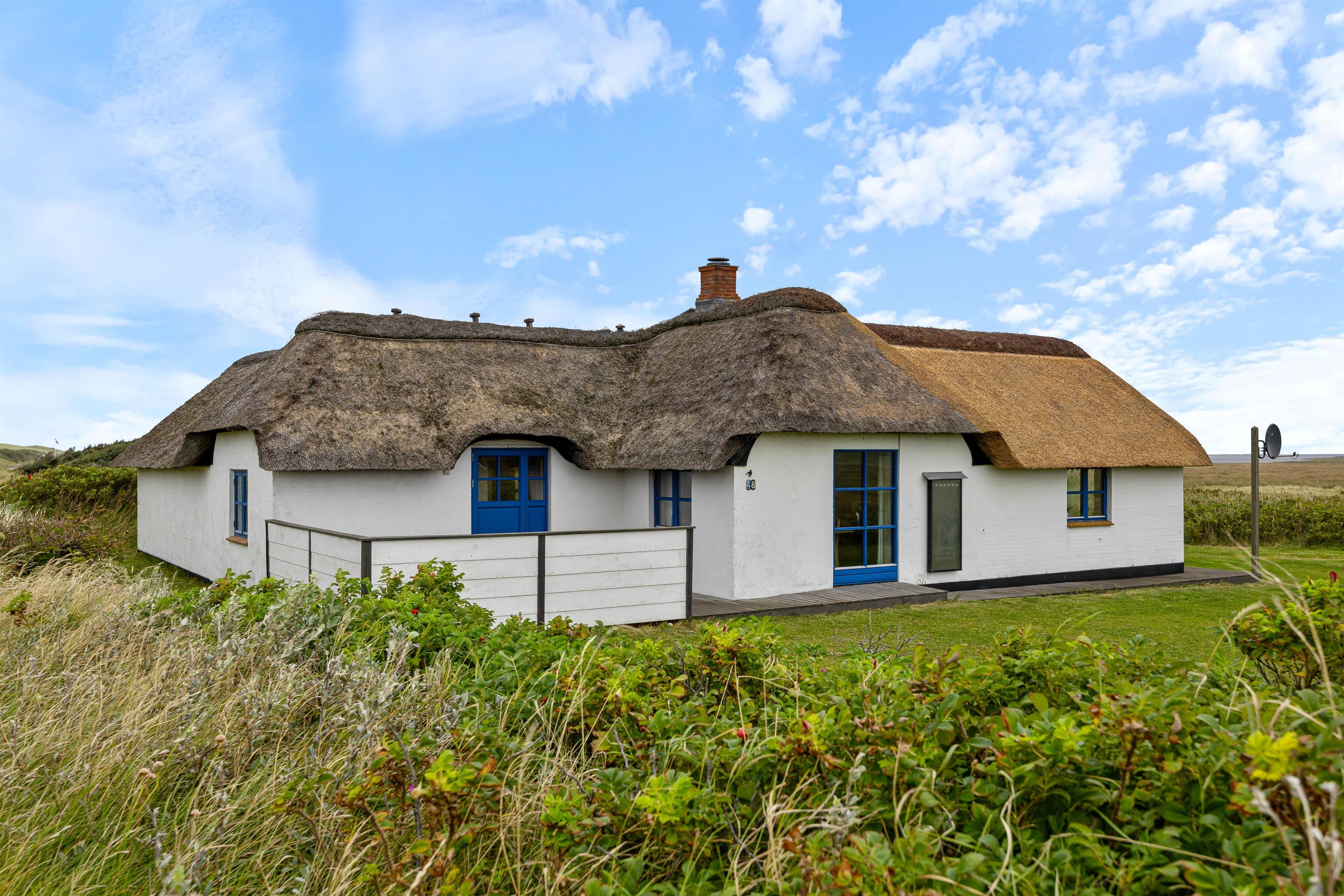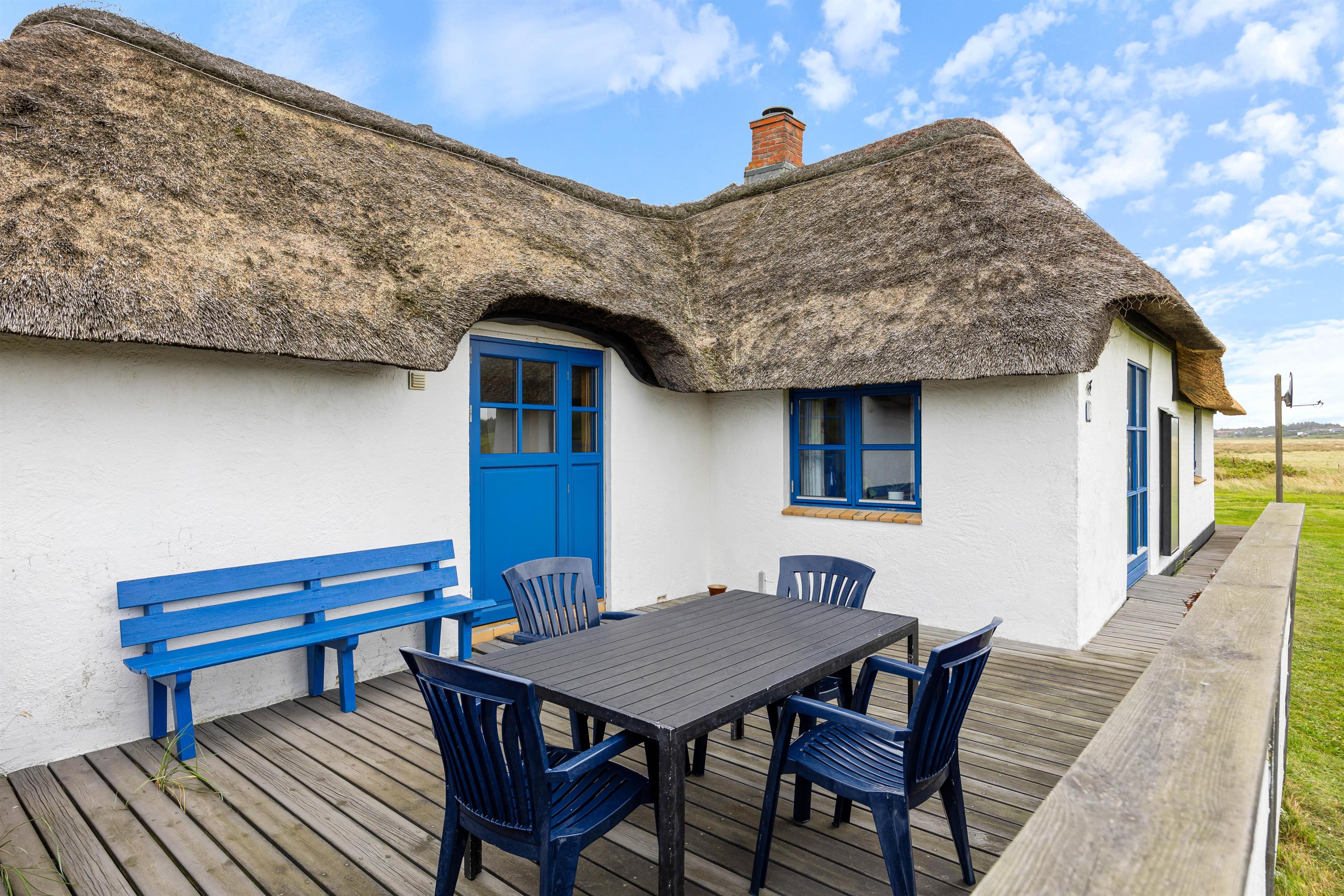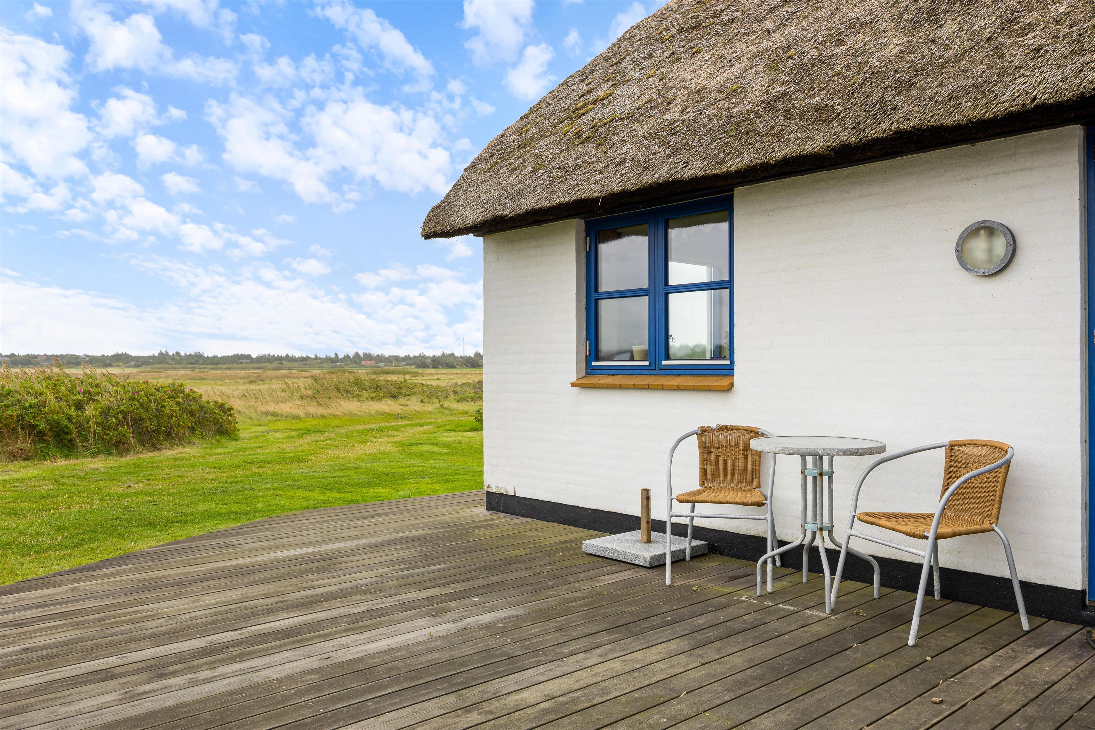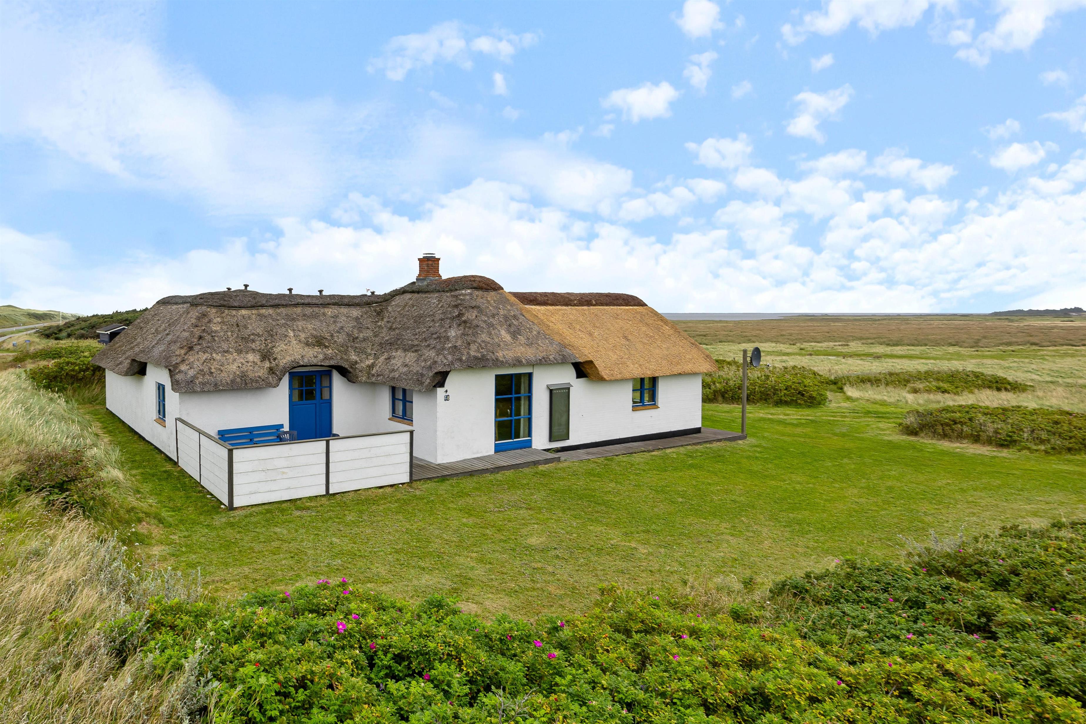 Det stråtækte feriehus med den hvide facade og de blåmalede vinduer og døre byder jer velkommen, så snart I ankommer. Feriehusets indre byder på en hyggelig atmosfære. I køkkenet er der en opvaskemaskine, så opvasken kan klares, mens I lader batterierne op efter en lang gåtur ved Vesterhavet. Når I kommer tilbage efter en lang gåtur, kan I tænde op i brændeovnen og lytte til ildens knitren.
