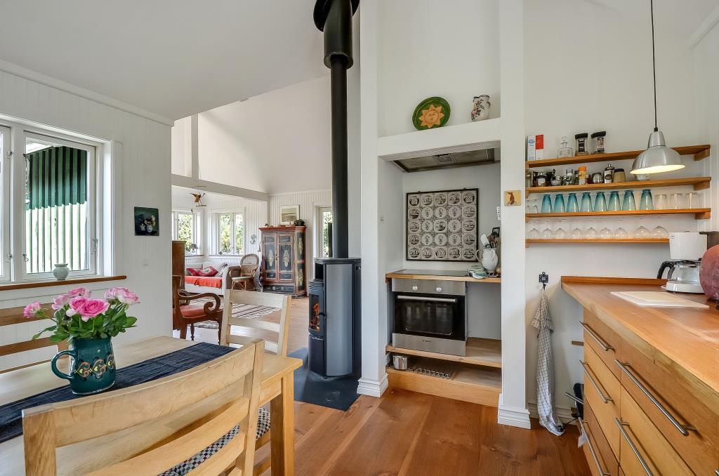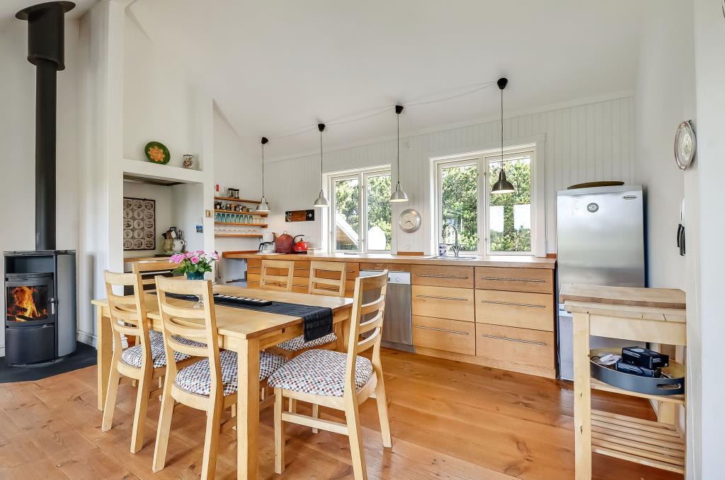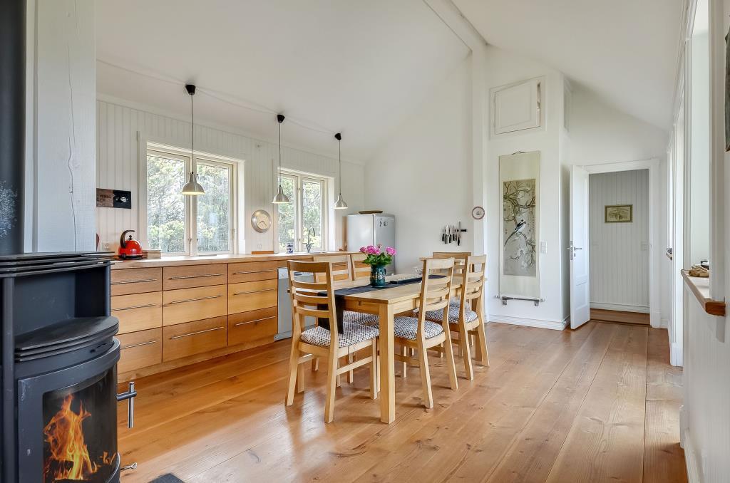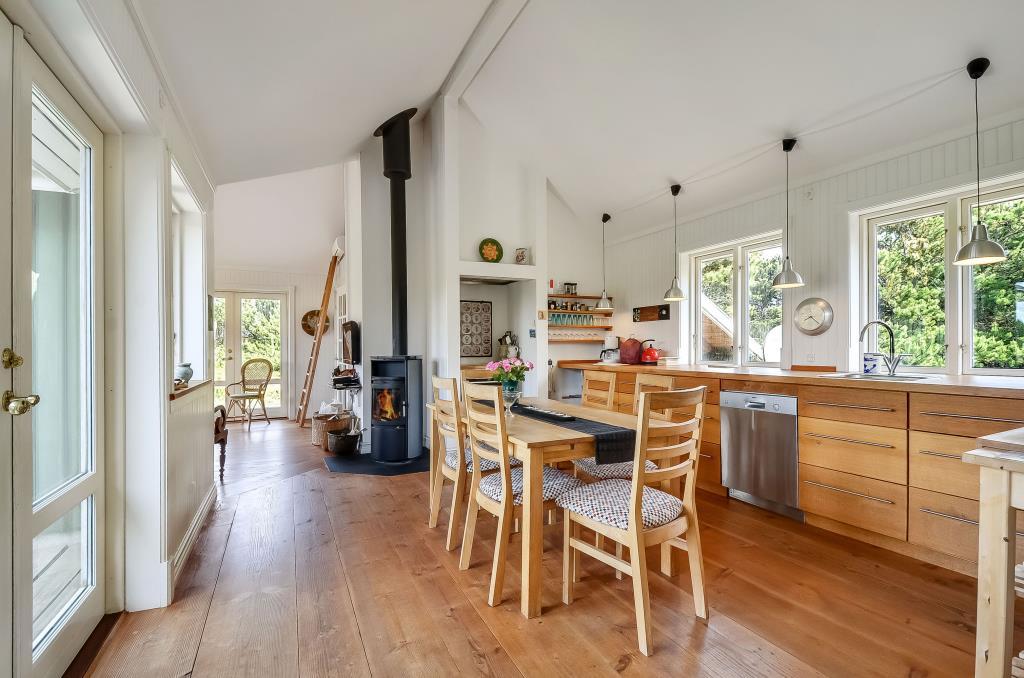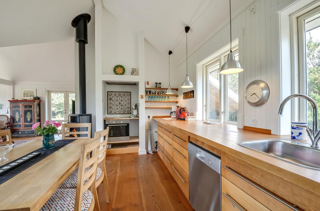 Feriehuset er på 100 m² og indrettet i en spændende stil med et åbent og hyggeligt opholdsrum, hvor køkken, spiseplads og stue smelter sammen til ét.