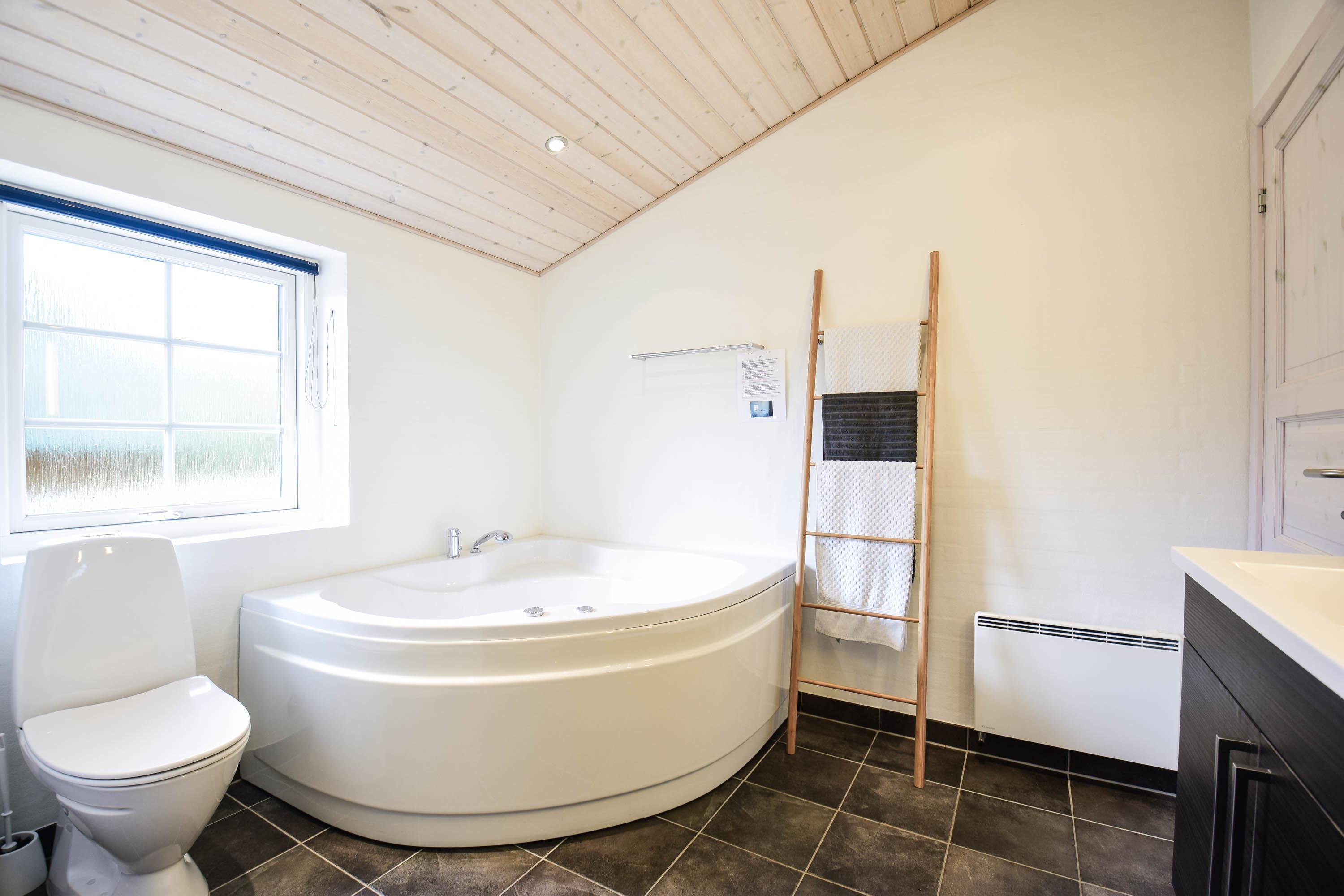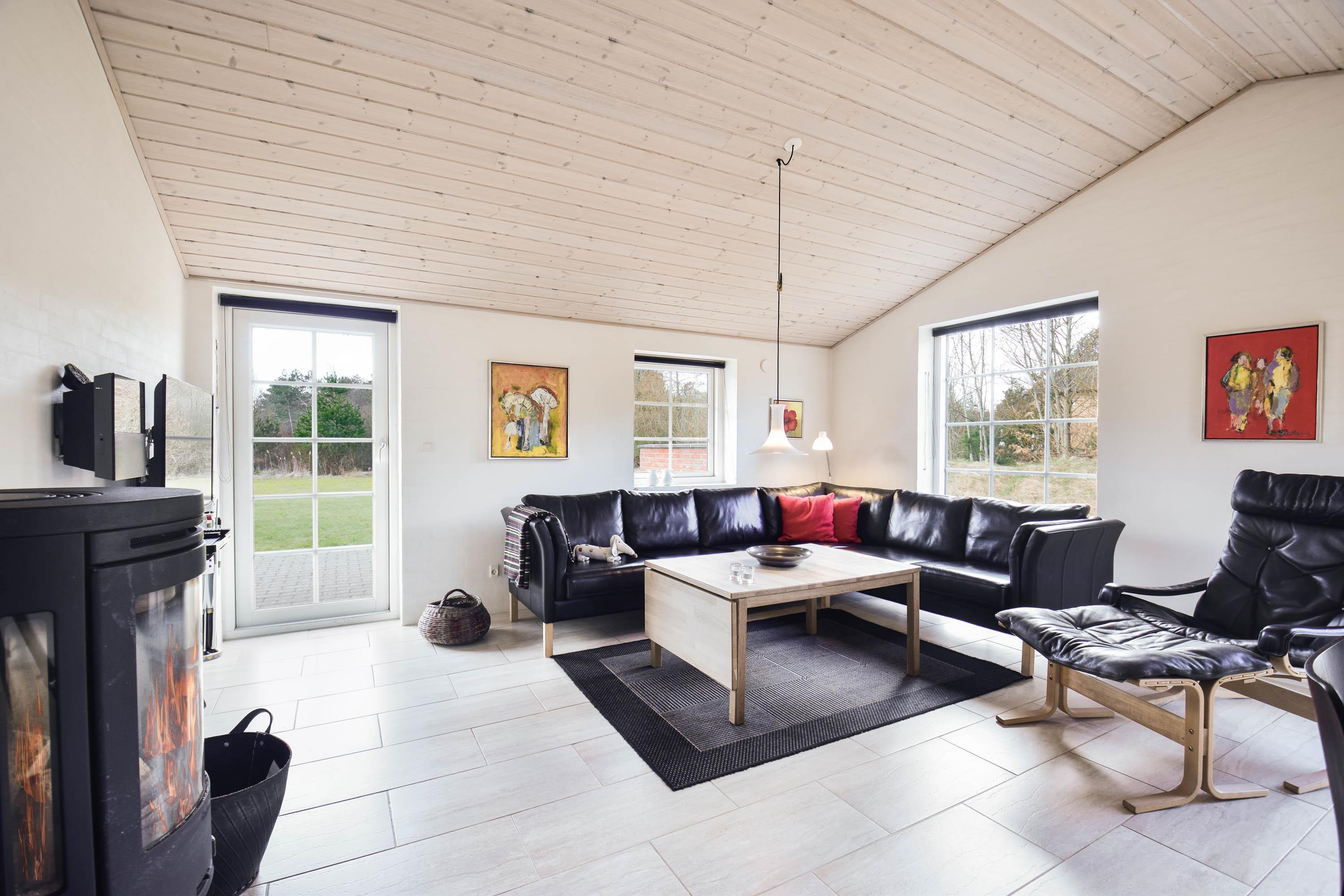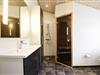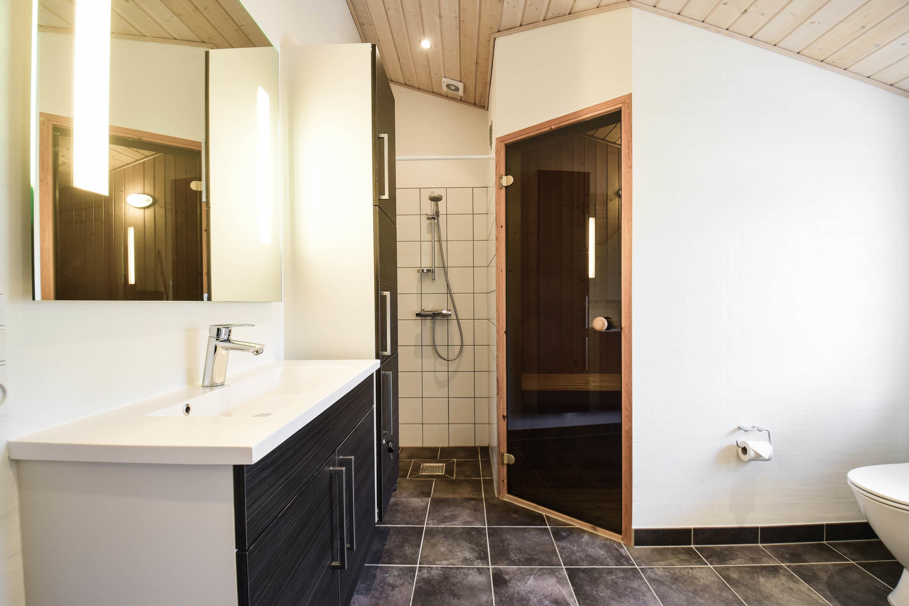 Indretning: Lyst køkken/ alrum med brændeovn og udgang til dejlig terrasse, 1 værelse med to gode senge, 2 soveværelser med faste skabe og dobbeltseng. Husets flotte badeværelse er indrettet med både bruseniche, spa og sauna. Fra husets entre er der tillige adgang til et lille ekstra badeværelse.