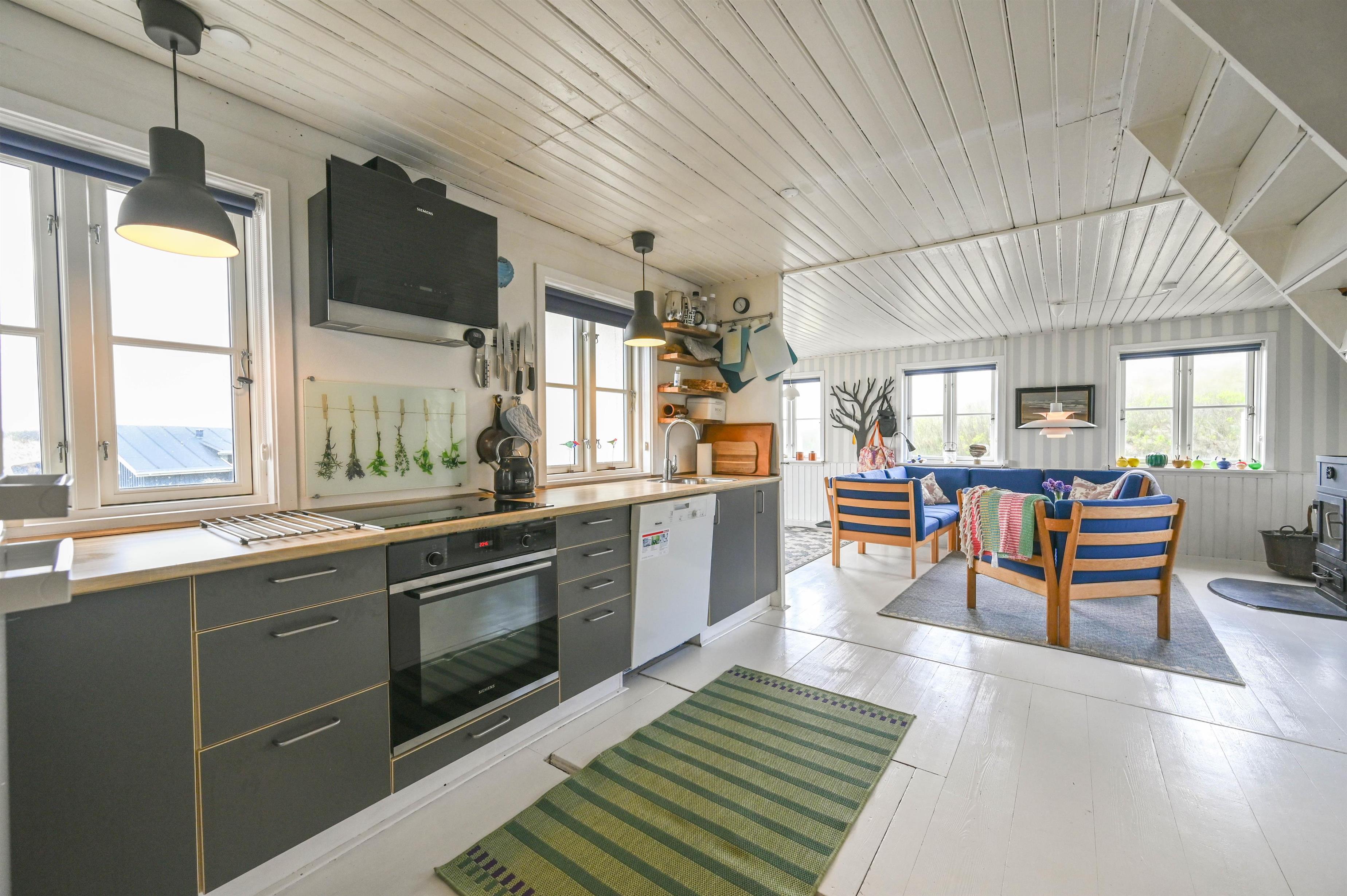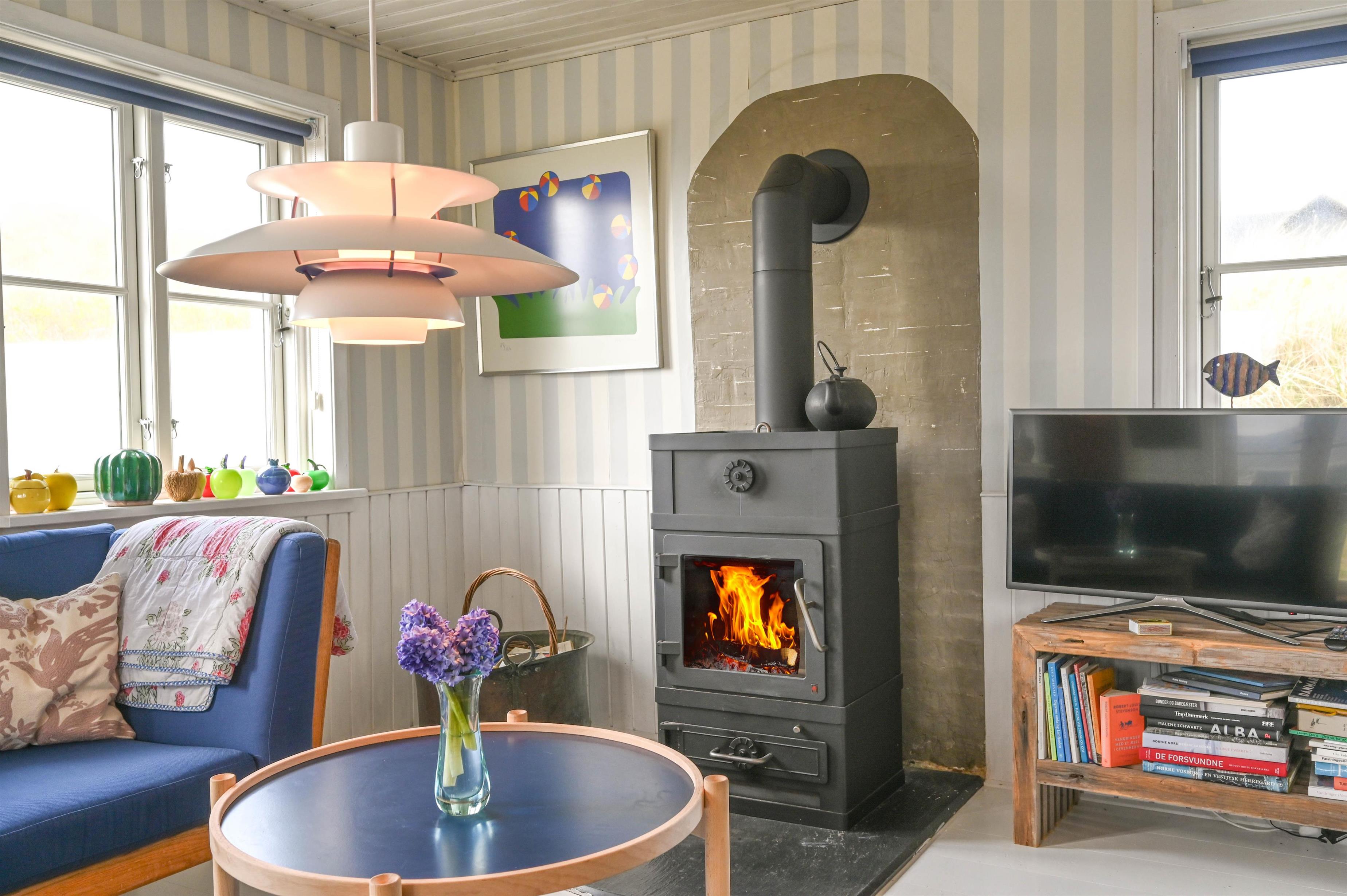 I stueplan finder I et lyst køkken i åben forbindelse med stuen, hvor der er både spiseplads, sofahjørne og brændeovn, som skaber den helt rigtige feriestemning på kølige aftener.