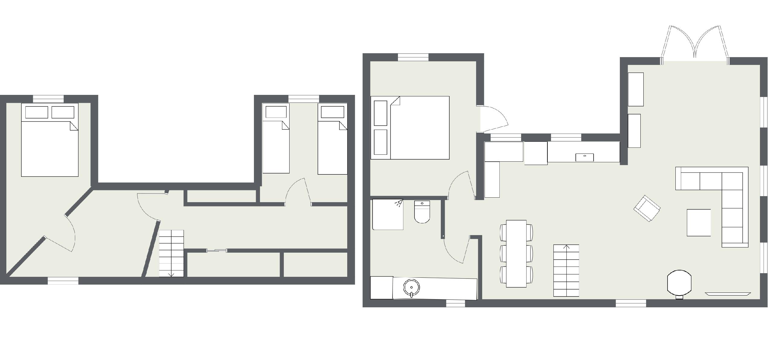 På 1. salen er der en hyggelig repos/stue, hvor man kan slappe af med en bog eller nyde et spil sammen, samt to værelser – det ene med to enkeltsenge og det andet med dobbeltseng.