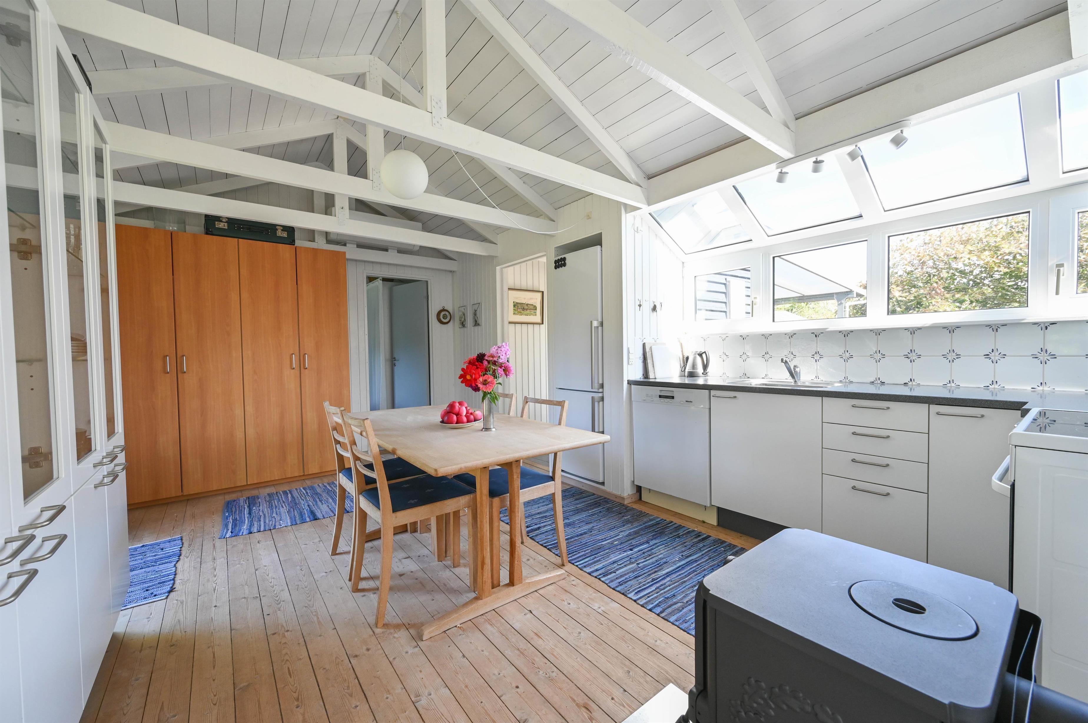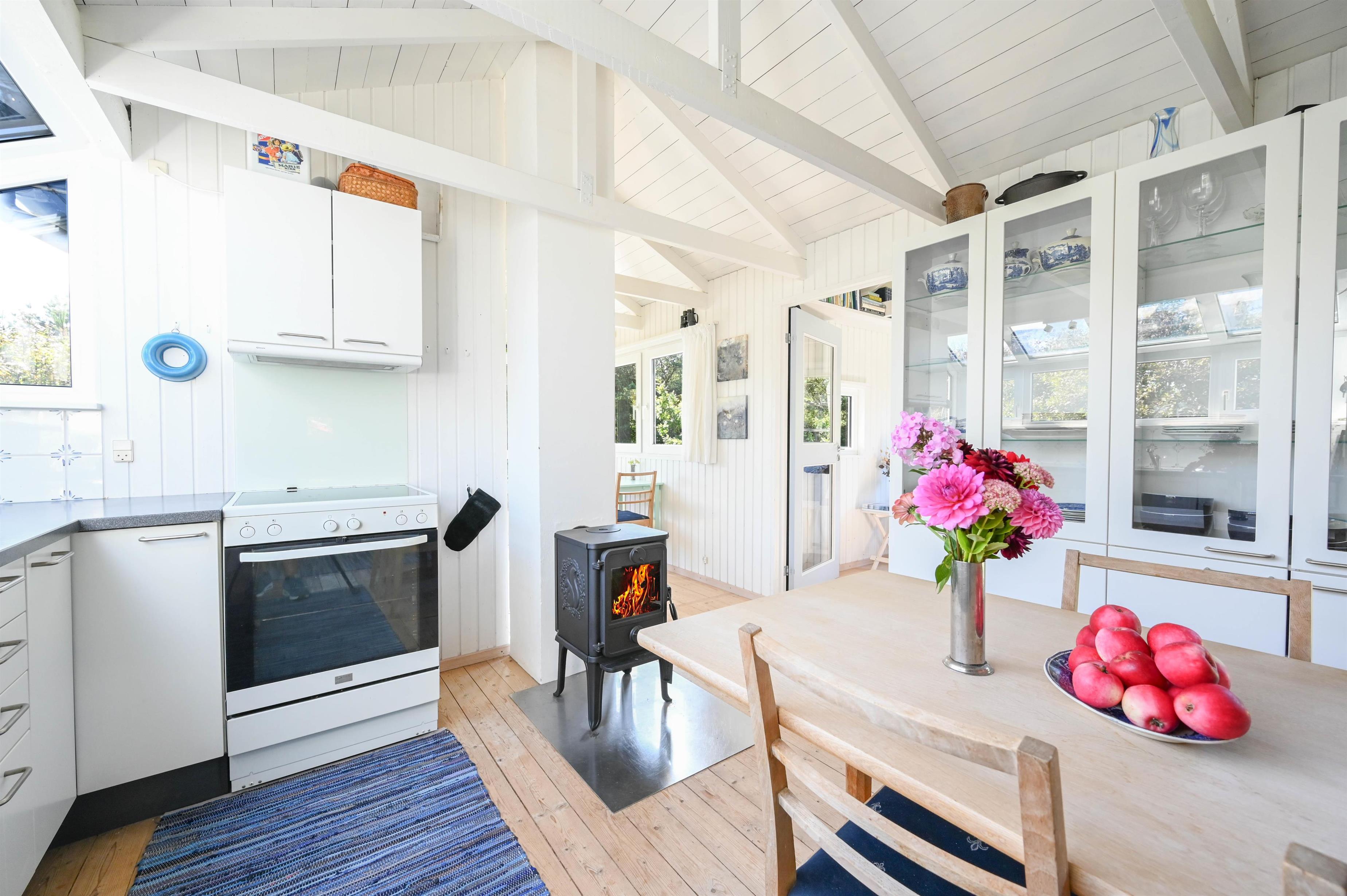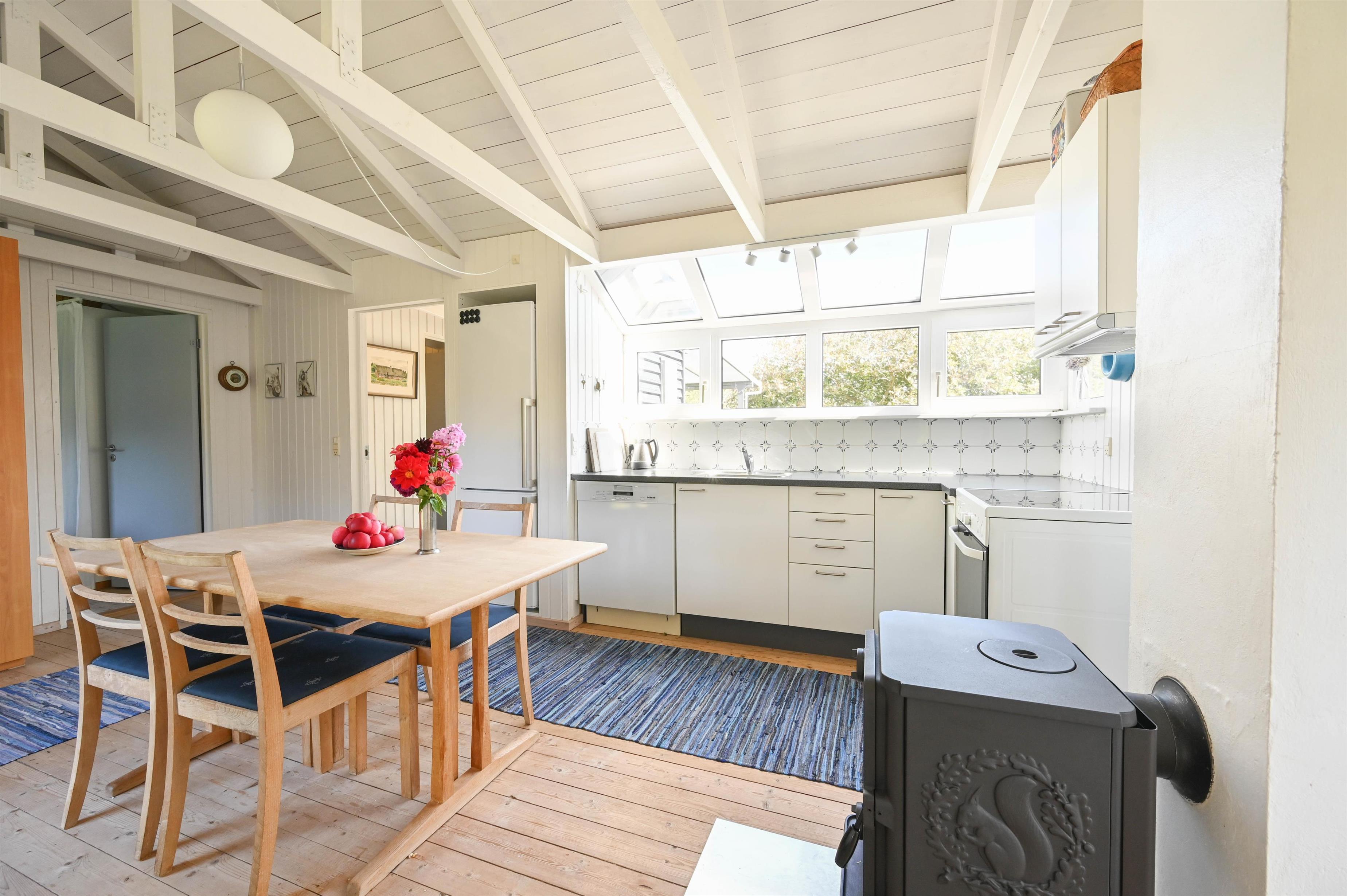 I det dejlige køkken-alrum er der god plads til madlavning og samvær, og brændeovnen skaber varme og atmosfære på kølige aftener.