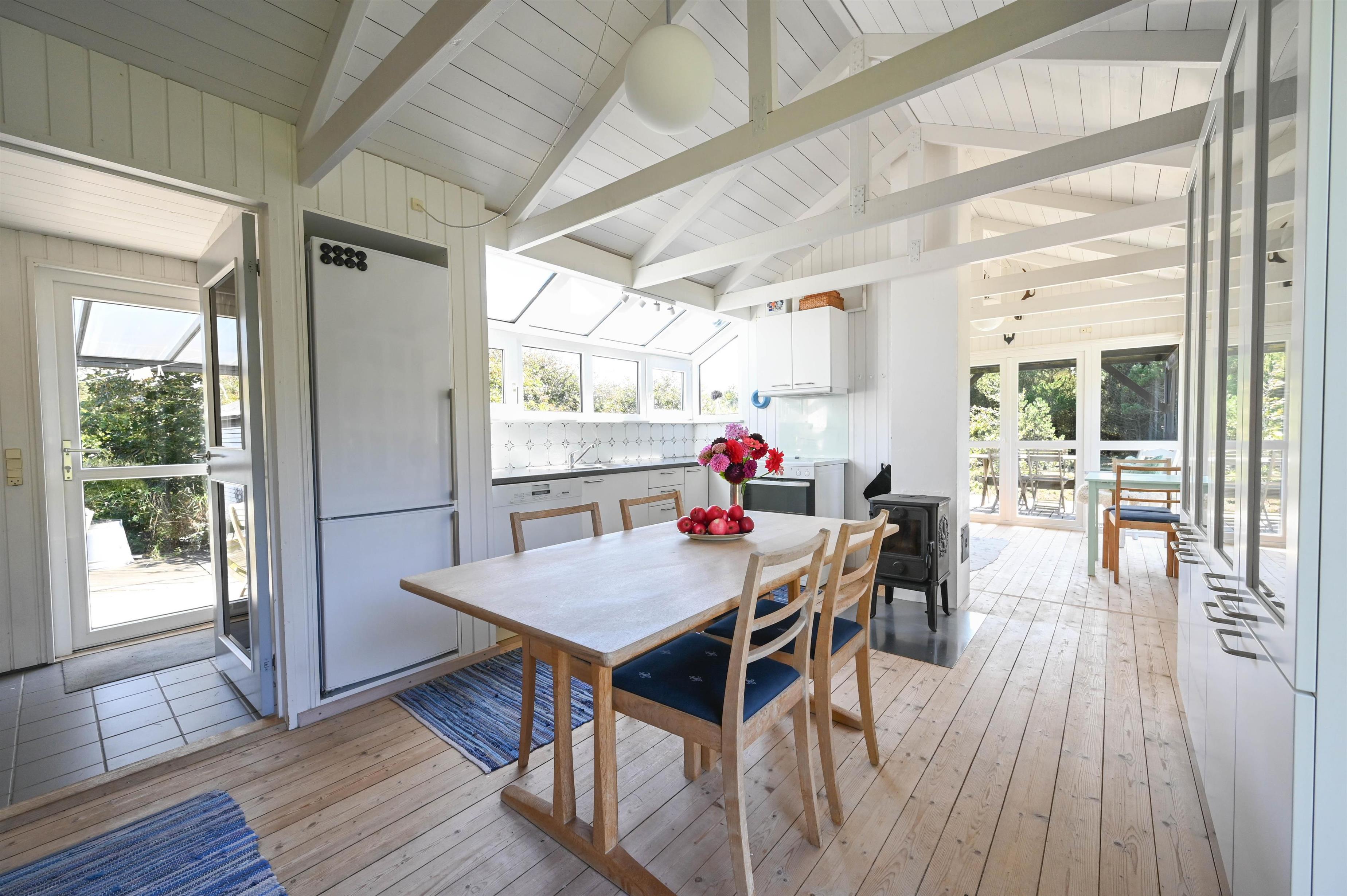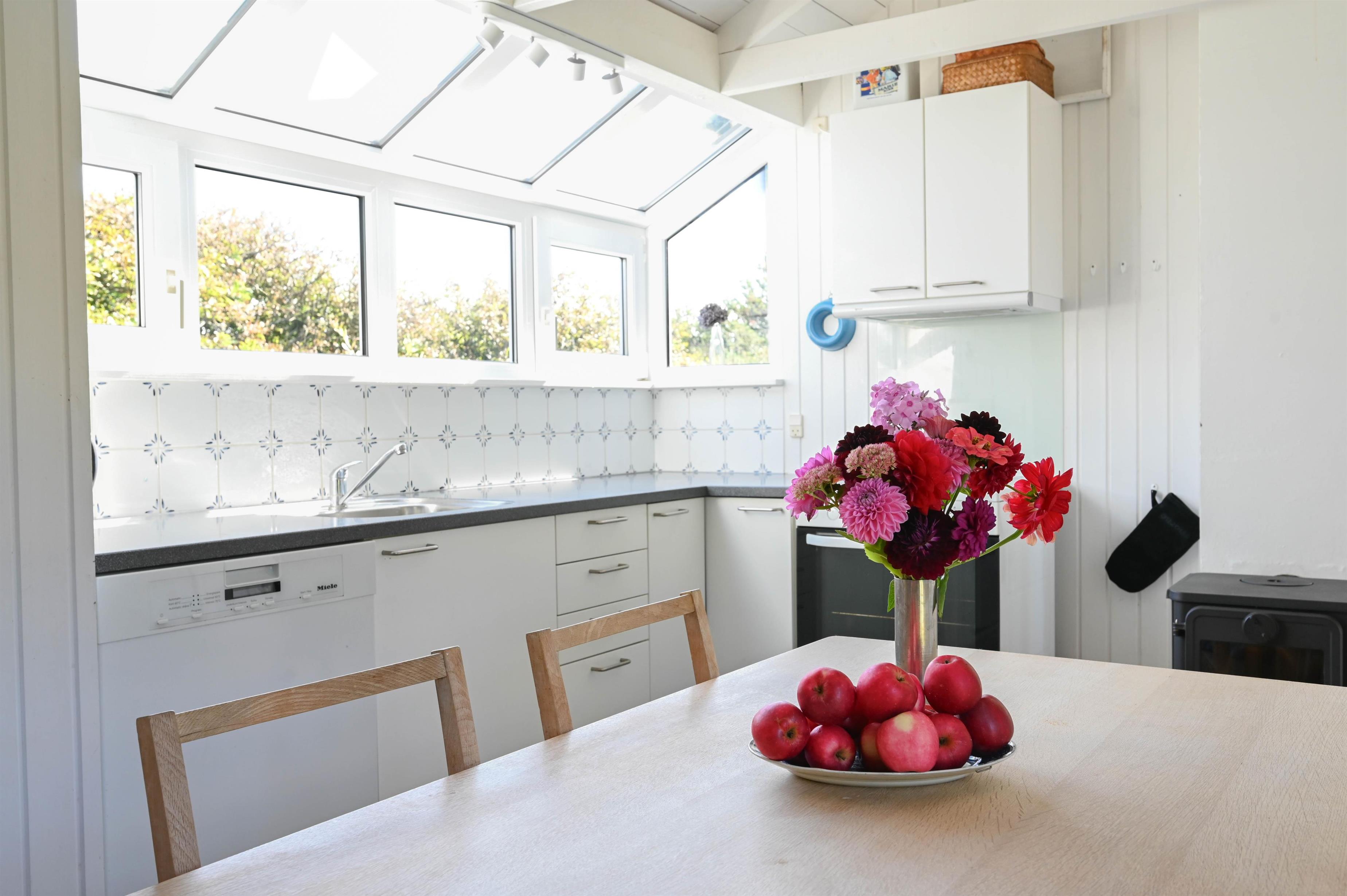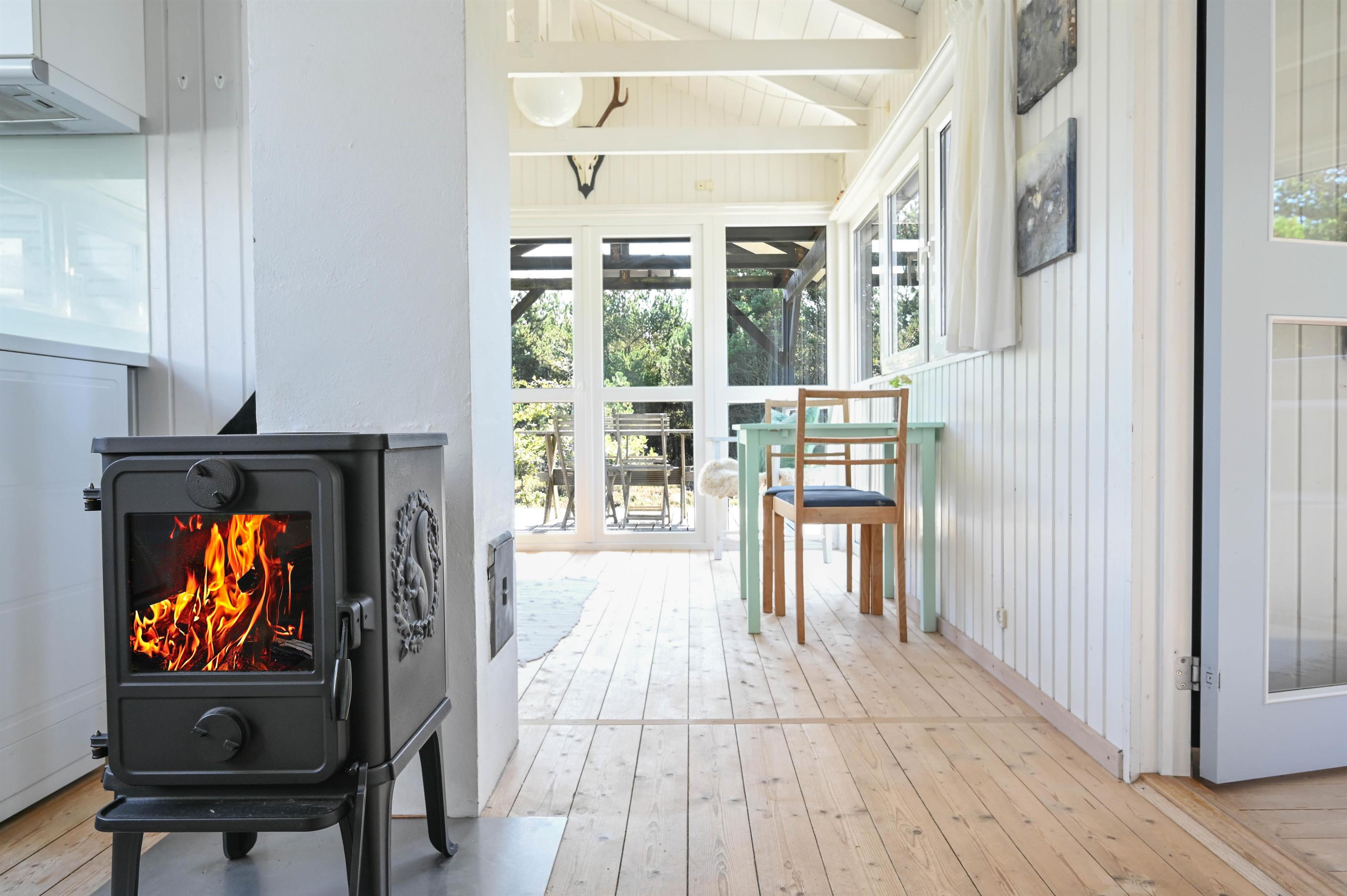 I det dejlige køkken-alrum er der god plads til madlavning og samvær, og brændeovnen skaber varme og atmosfære på kølige aftener.