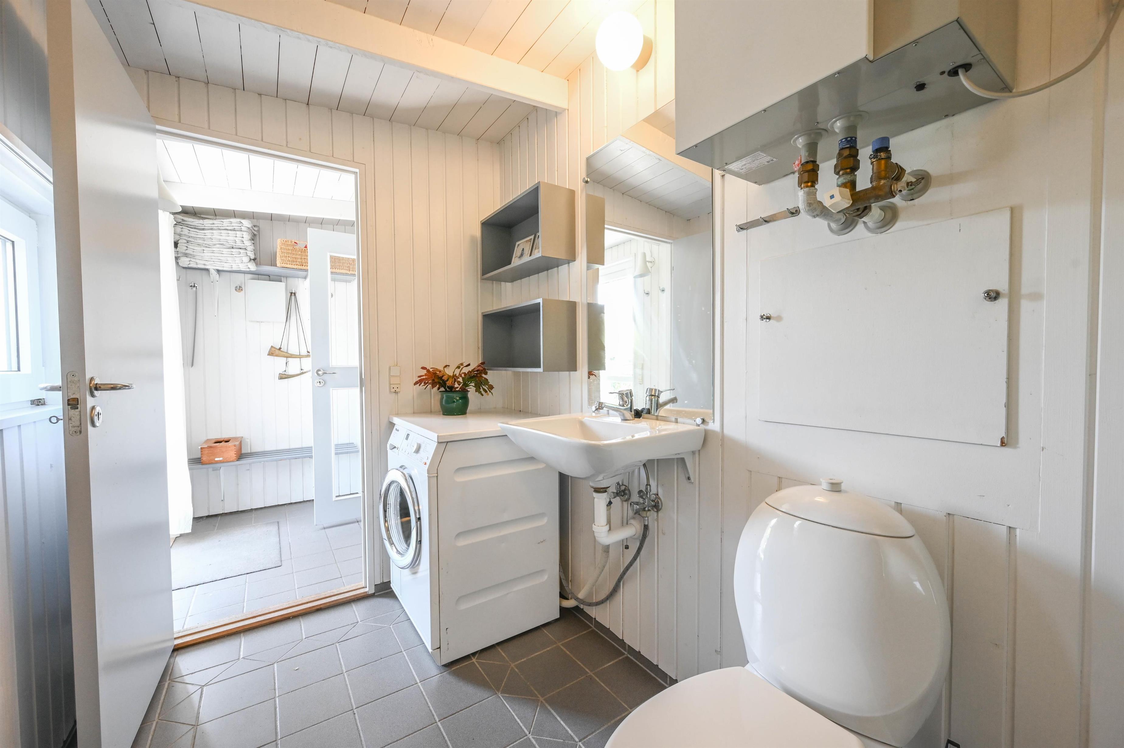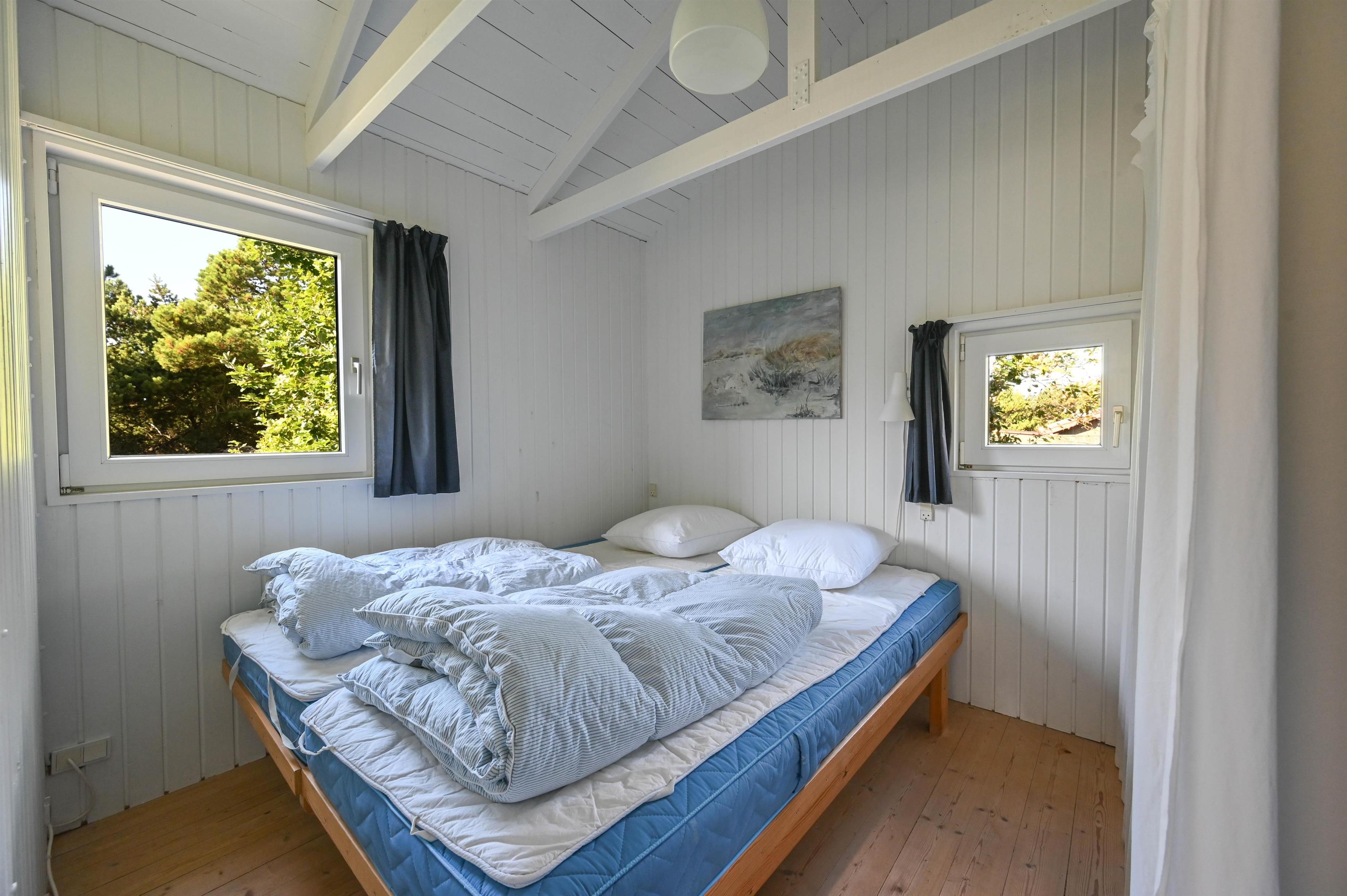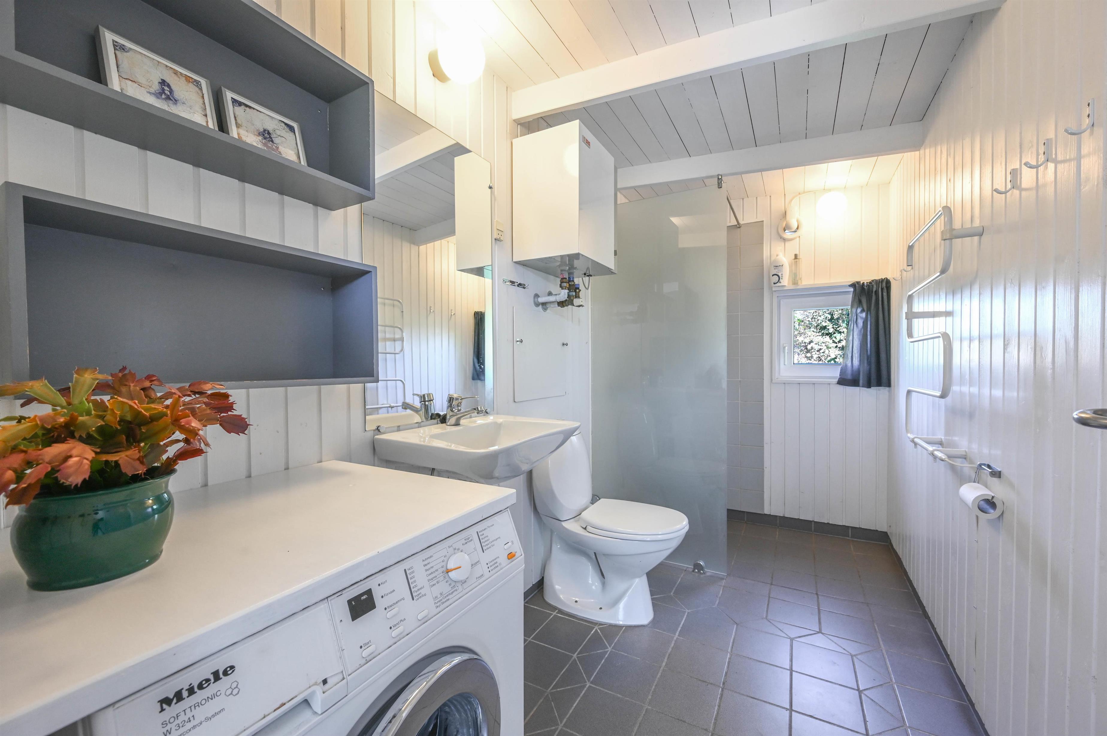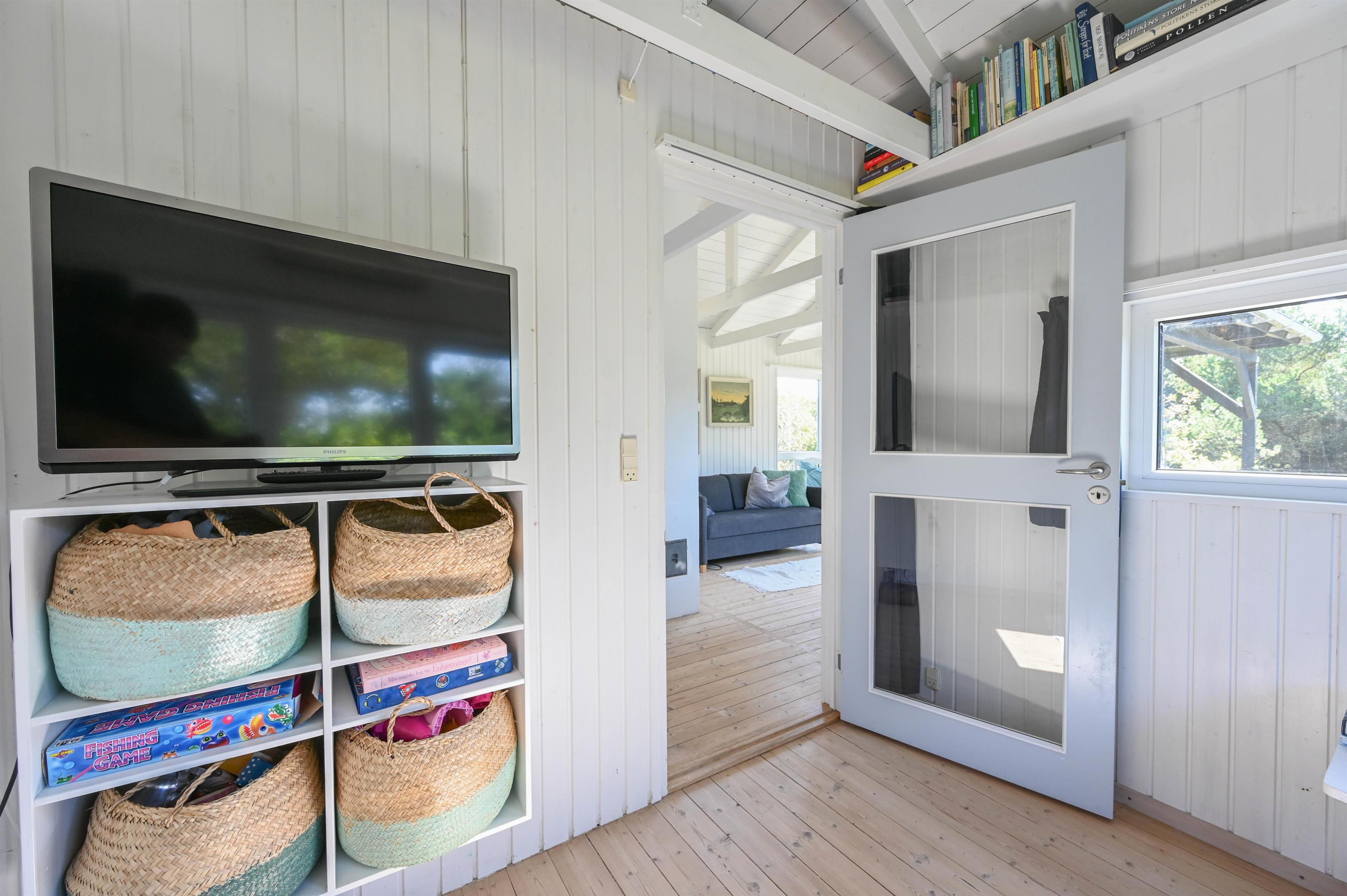 Huset har desuden et dejligt soveværelse med dobbeltseng, et pænt badeværelse med bruser og vaskemaskine samt en lille ekstra tv-stue med sofa.