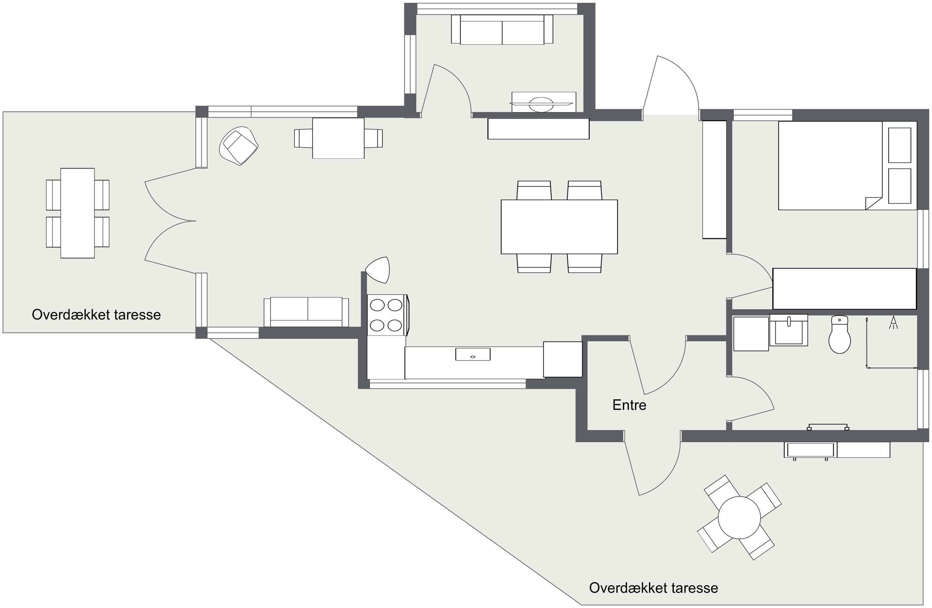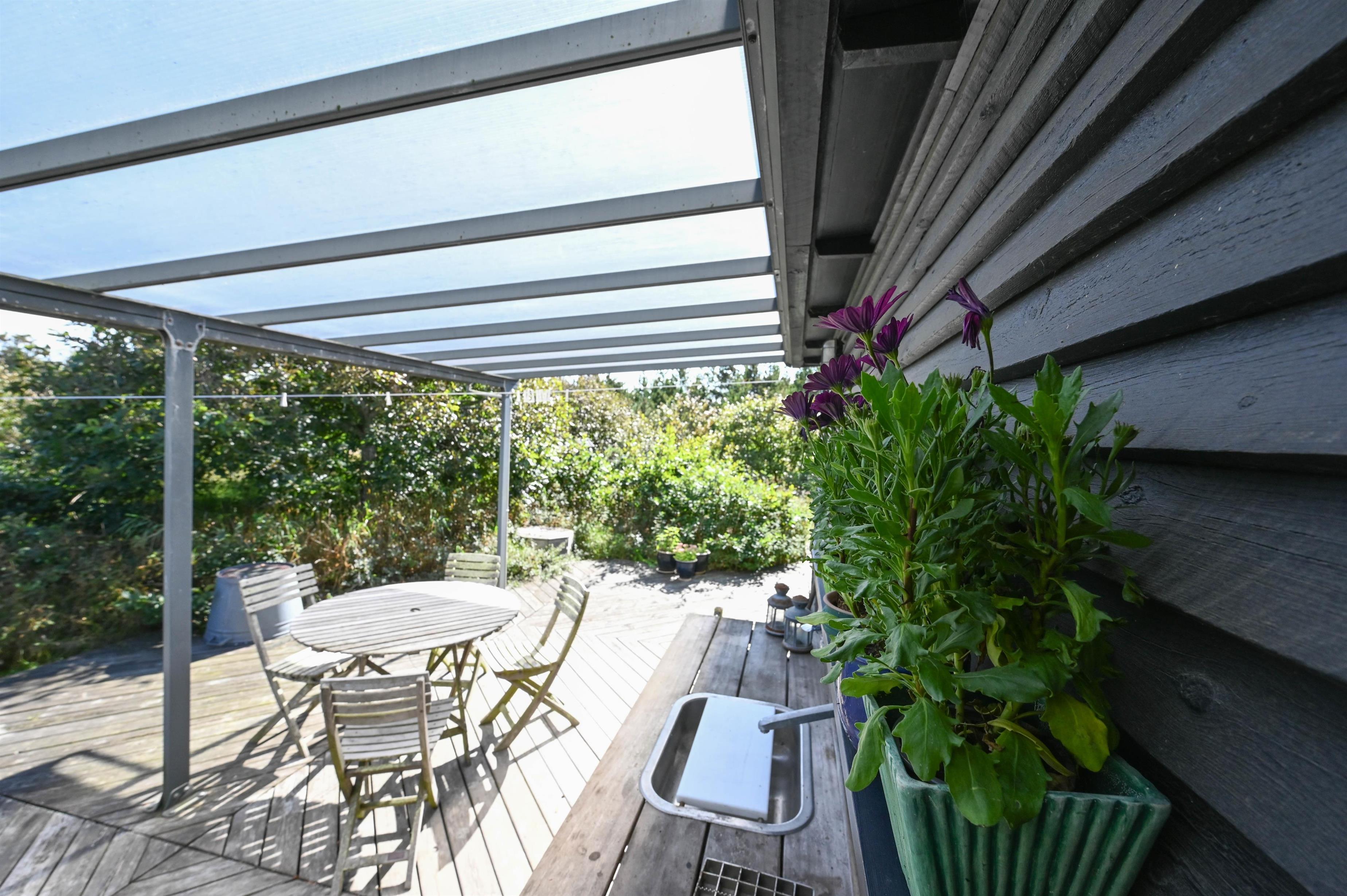 Fra den hyggelige stue er der direkte udgang til den overdækkede terrasse, hvor man nærmest sidder midt i naturen – perfekt til morgenkaffen, en god bog eller aftensmaden under trætoppene.