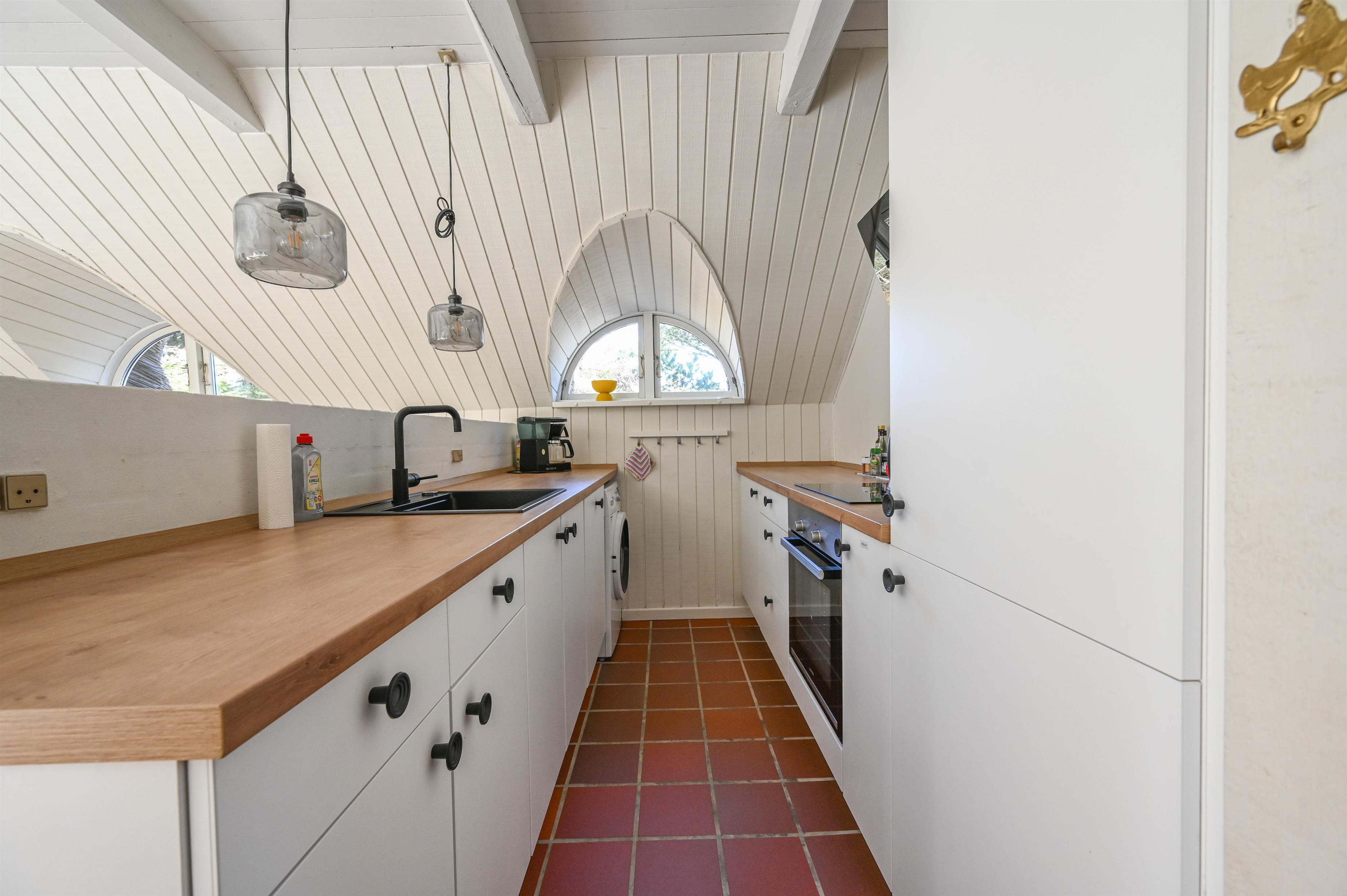 Det lyse køkken ligger i åben forbindelse med stuen, hvor store vinduer lukker naturen ind og skaber en behagelig stemning.