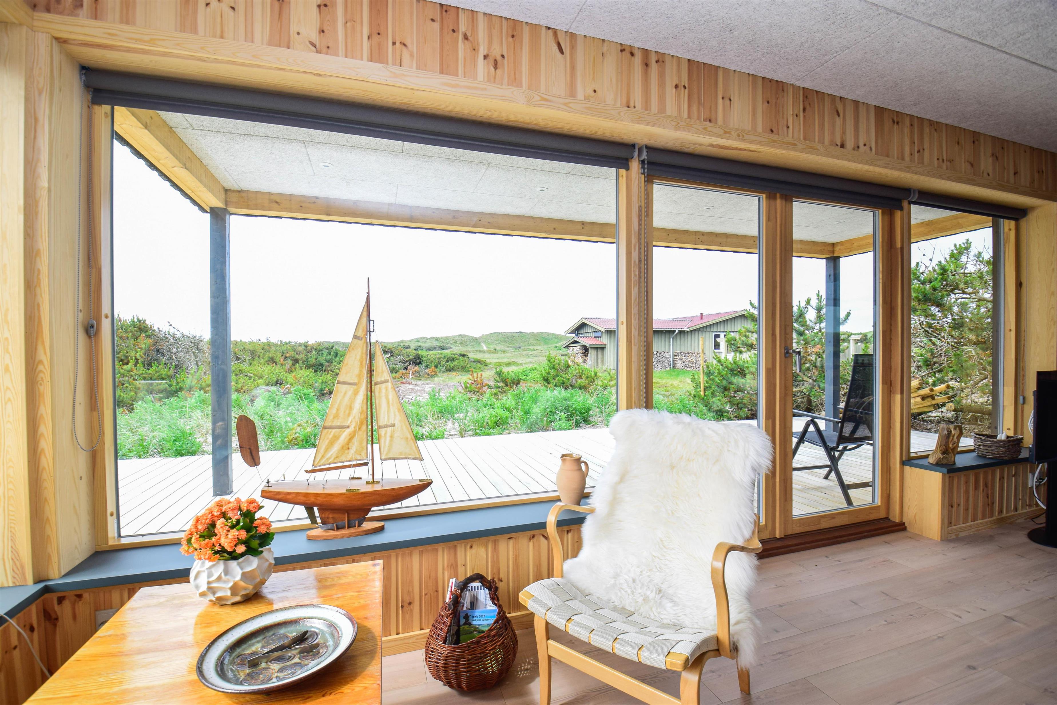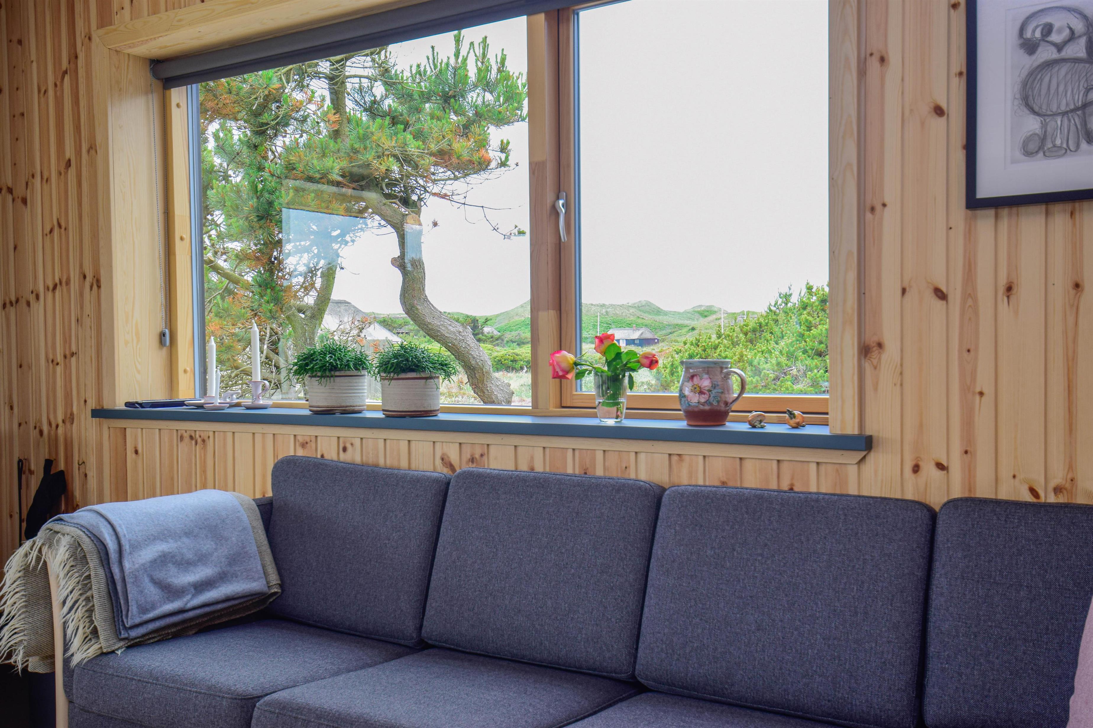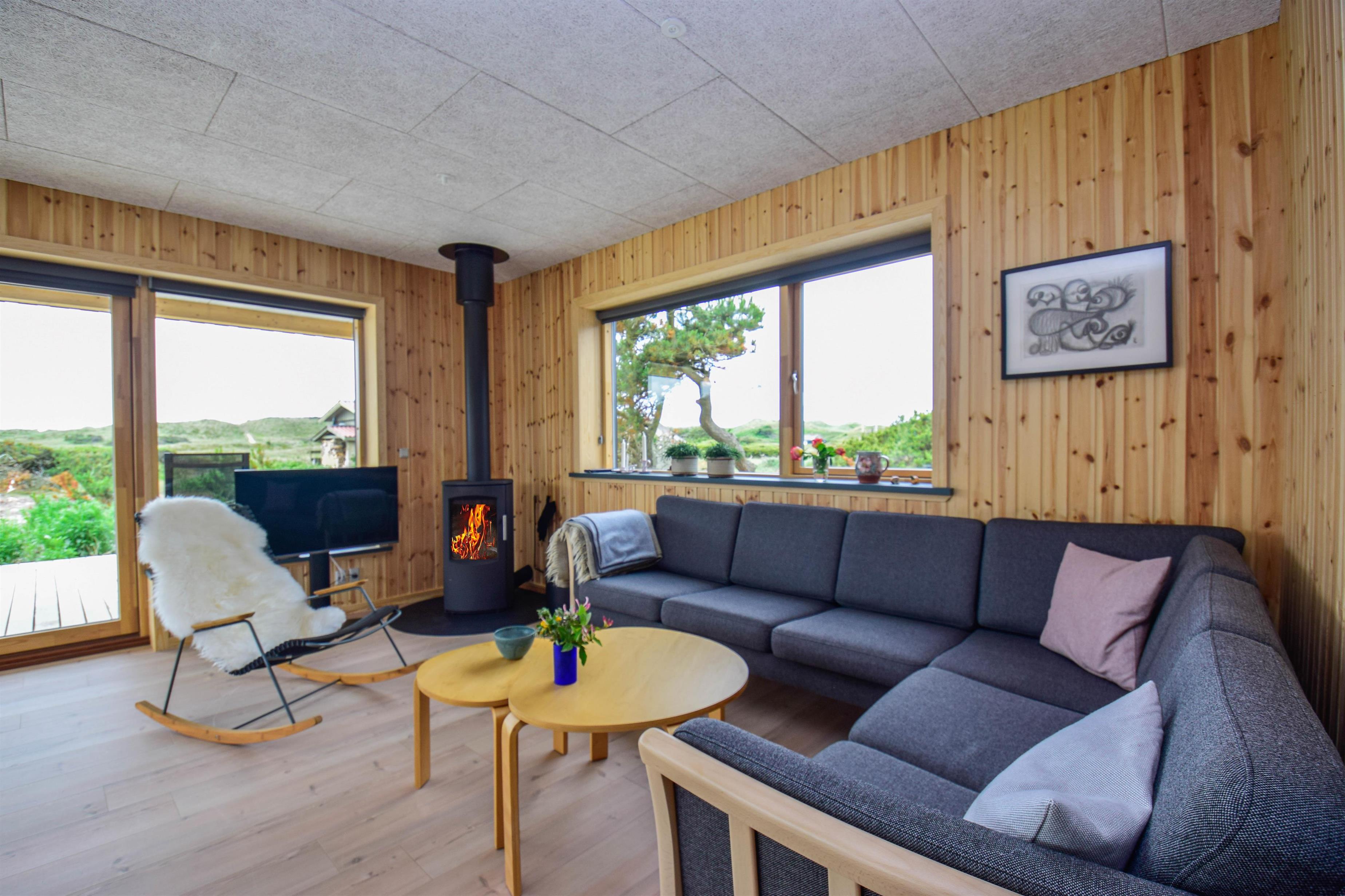 Feriehuset er lyst og venligt indrettet med store vinduespartier, der lukker naturen helt ind i stuen – her får man næsten fornemmelsen af at sidde ude, selv når man er inde.