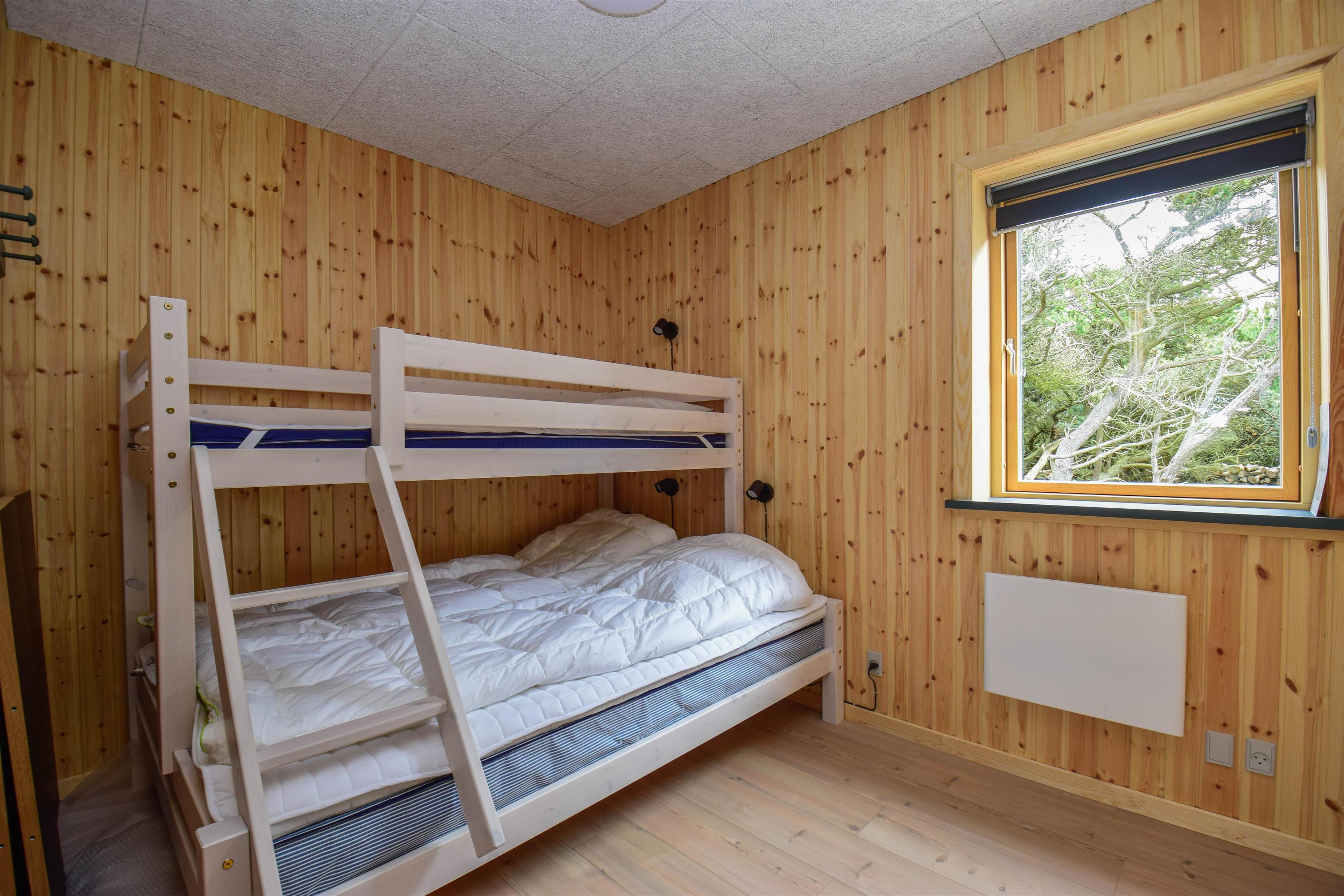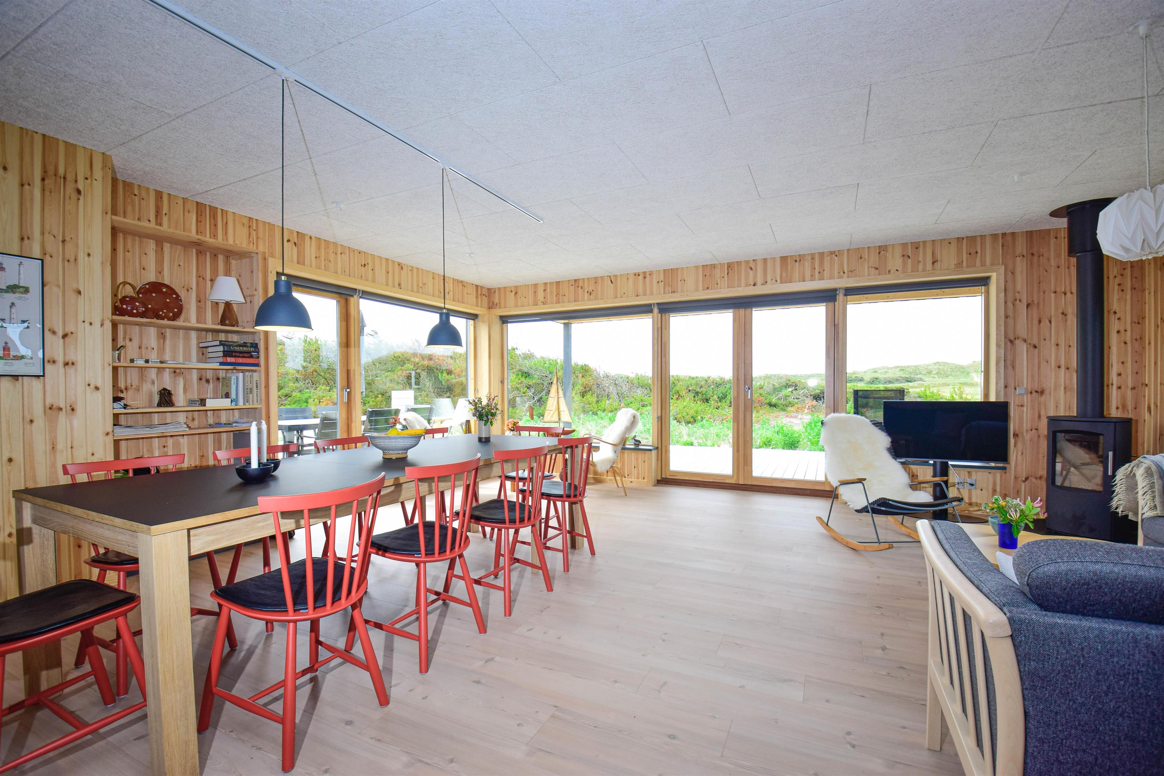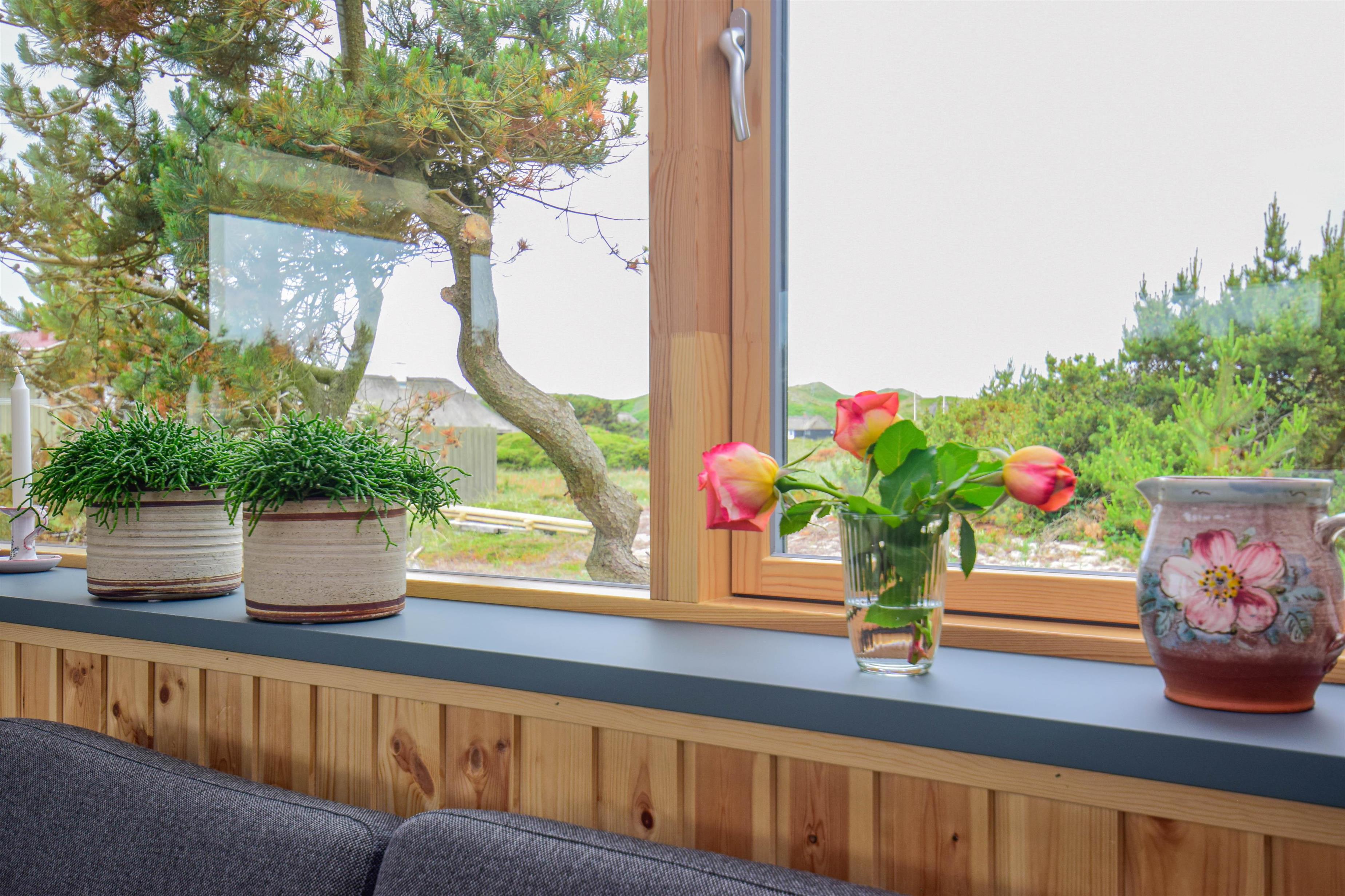 Feriehuset er lyst og venligt indrettet med store vinduespartier, der lukker naturen helt ind i stuen – her får man næsten fornemmelsen af at sidde ude, selv når man er inde.