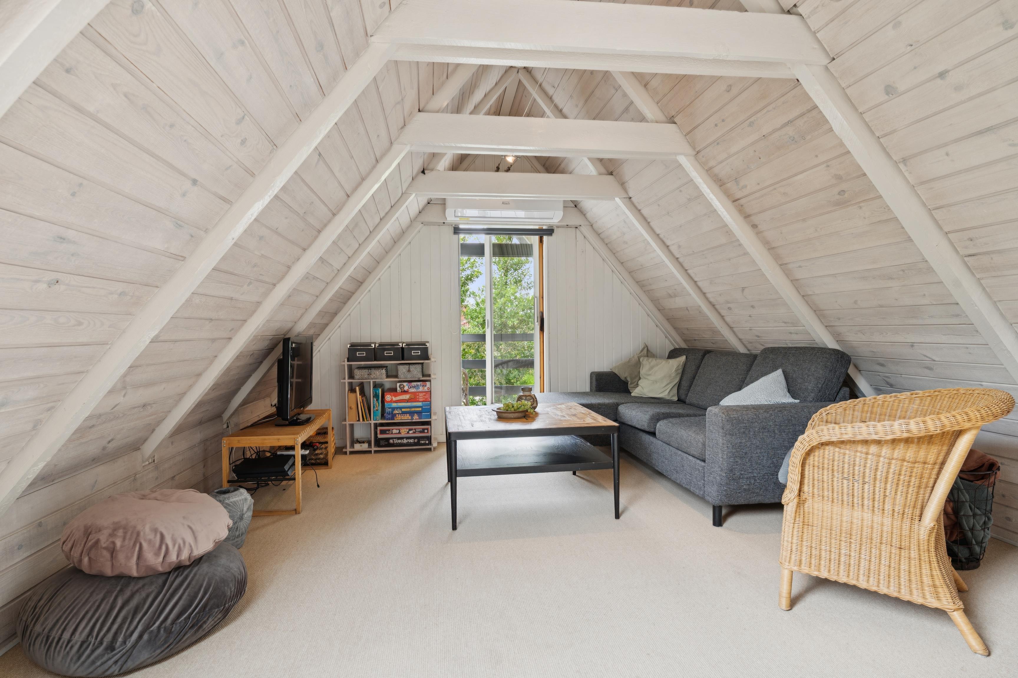 I stueetagens køkken-alrum kan I lave mad sammen, samles om brætspil og nyde stemningen fra brændeovnen på kølige dage. Huset har varmepumpe og gulvvarme i badeværelset, hvilket sikrer komfort året rundt. På førstesalen kan I koble af med en god film, og fra altanen er der en dejlig udsigt over haven.