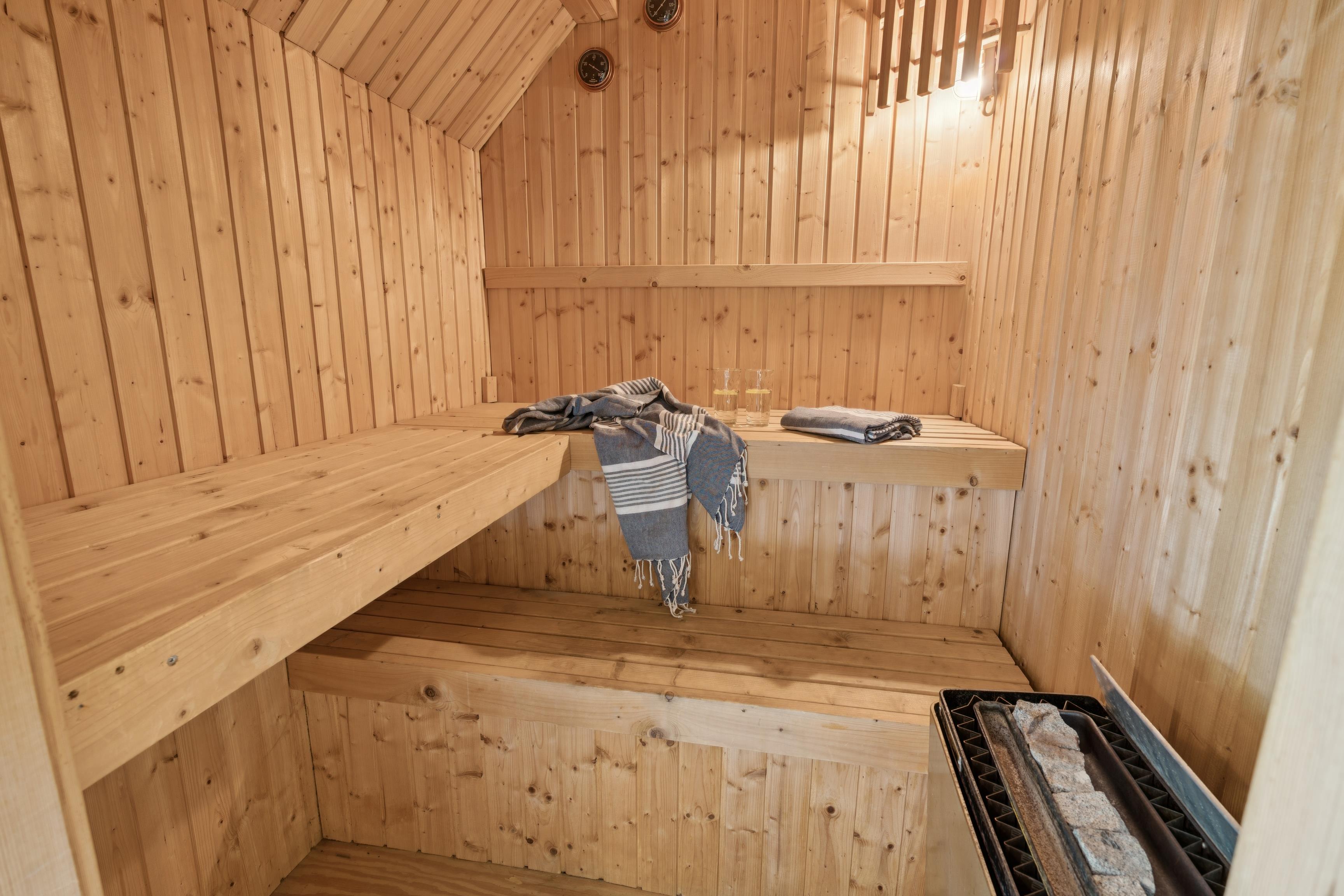 Efter en aktiv dag i naturen er det skønt at vende hjem og slappe af i husets sauna, som fuldender ferieoplevelsen.